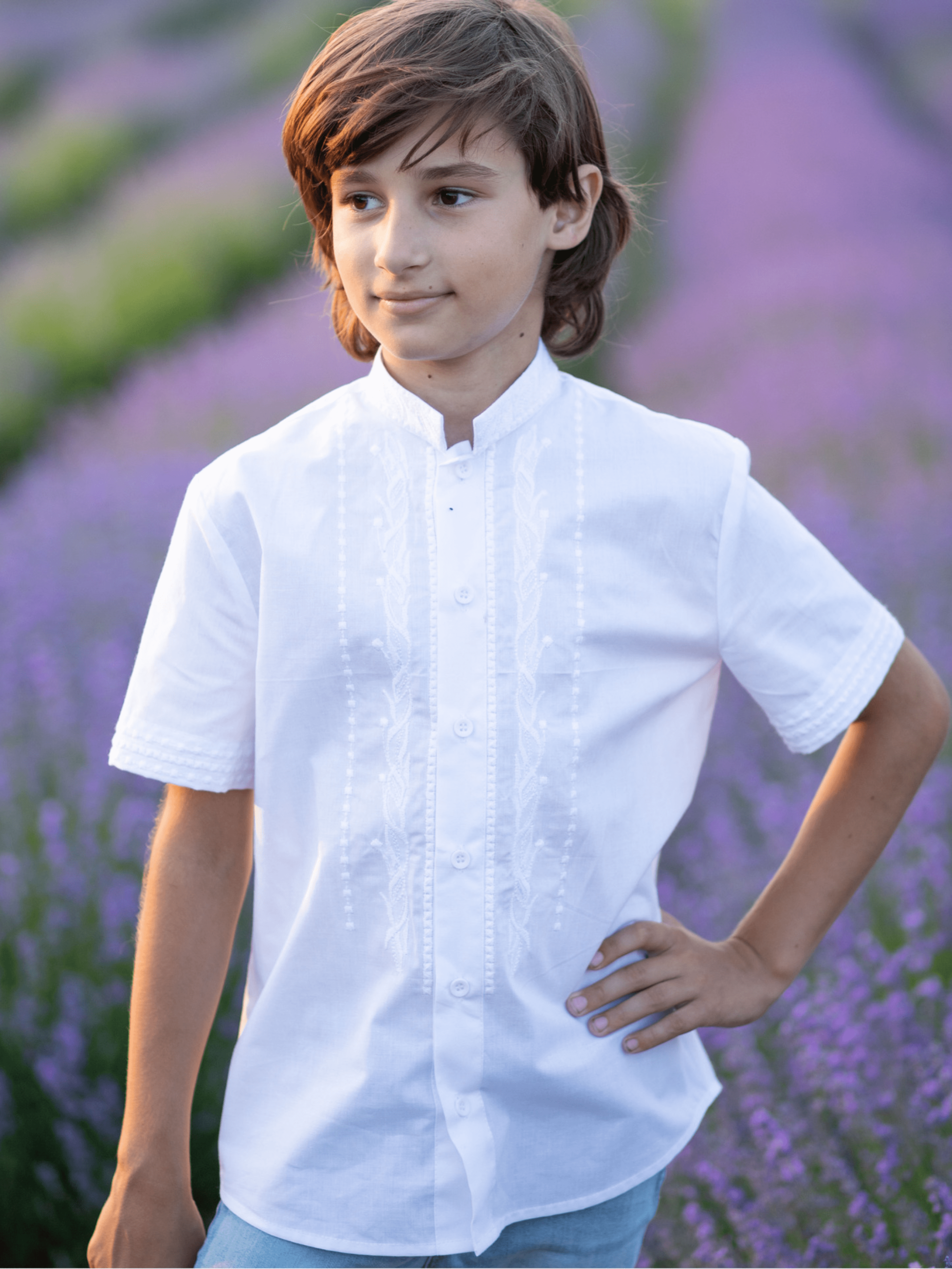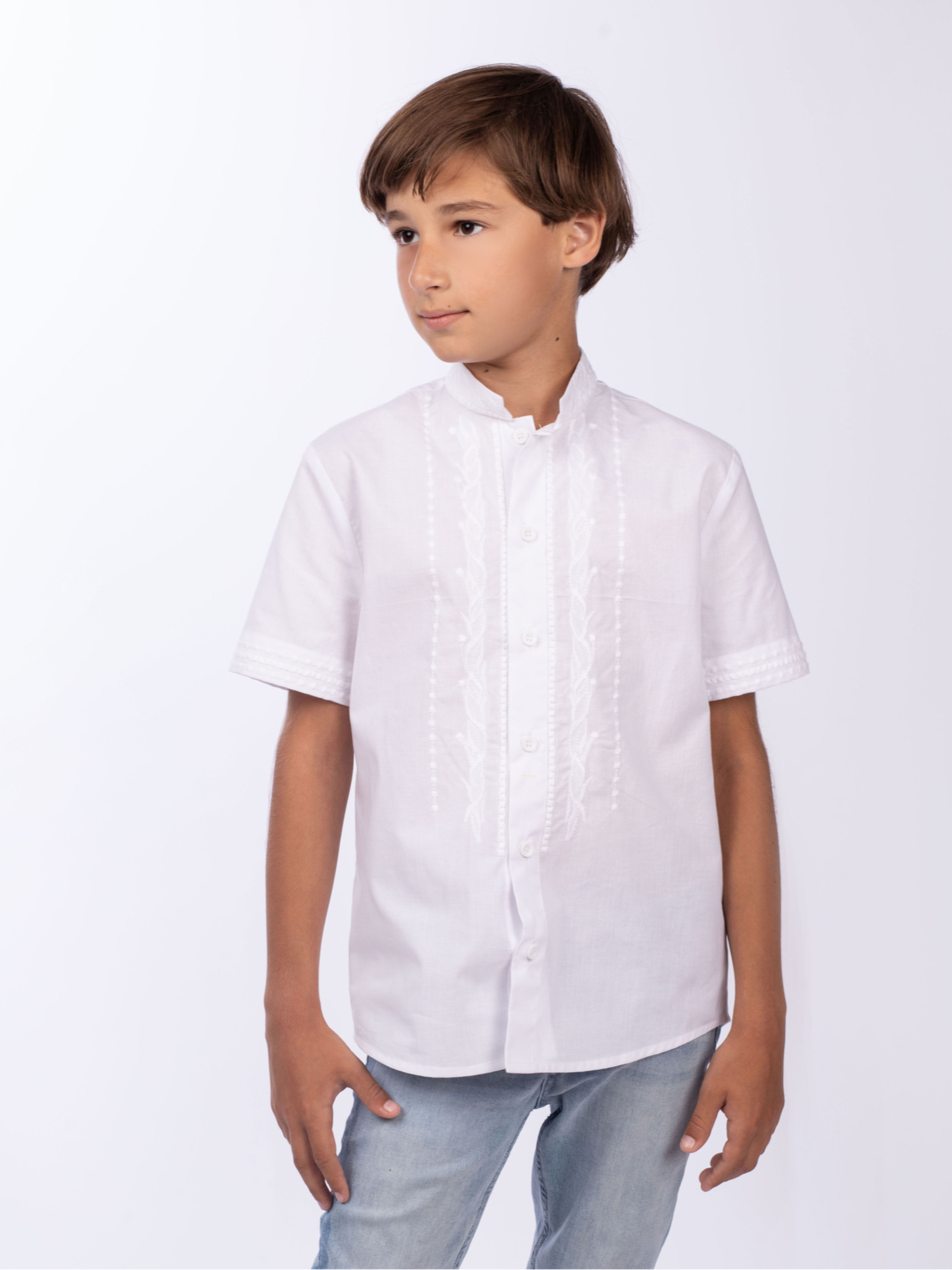 Вишита сорочка білим по білому - must have в дитячому гардеробі. Вона буде завжди актуальною, адже з нею можна створити безліч яскравих образів у casual та в класичному стилі. Сорочка створена з 100% бавовни, вона огорне тіло дитини ніжністю та турботою, а виражений рослинний орнамент слугуватиме надійним оберегом для вашого янголятка. Вишиванка прямого крою, по всій довжині виробу застібка з гудзиків та вишитий узор по обидві сторони. Короткий рукав і комір-стійка також містять орнамент вишитий гладдю. Завітавши до нас, ваша дитина порине в глибокий світ народних звичаїв та безповоротно закохається в широкий простір традиційної української вишивки з унікальним дизайнерським почерком.