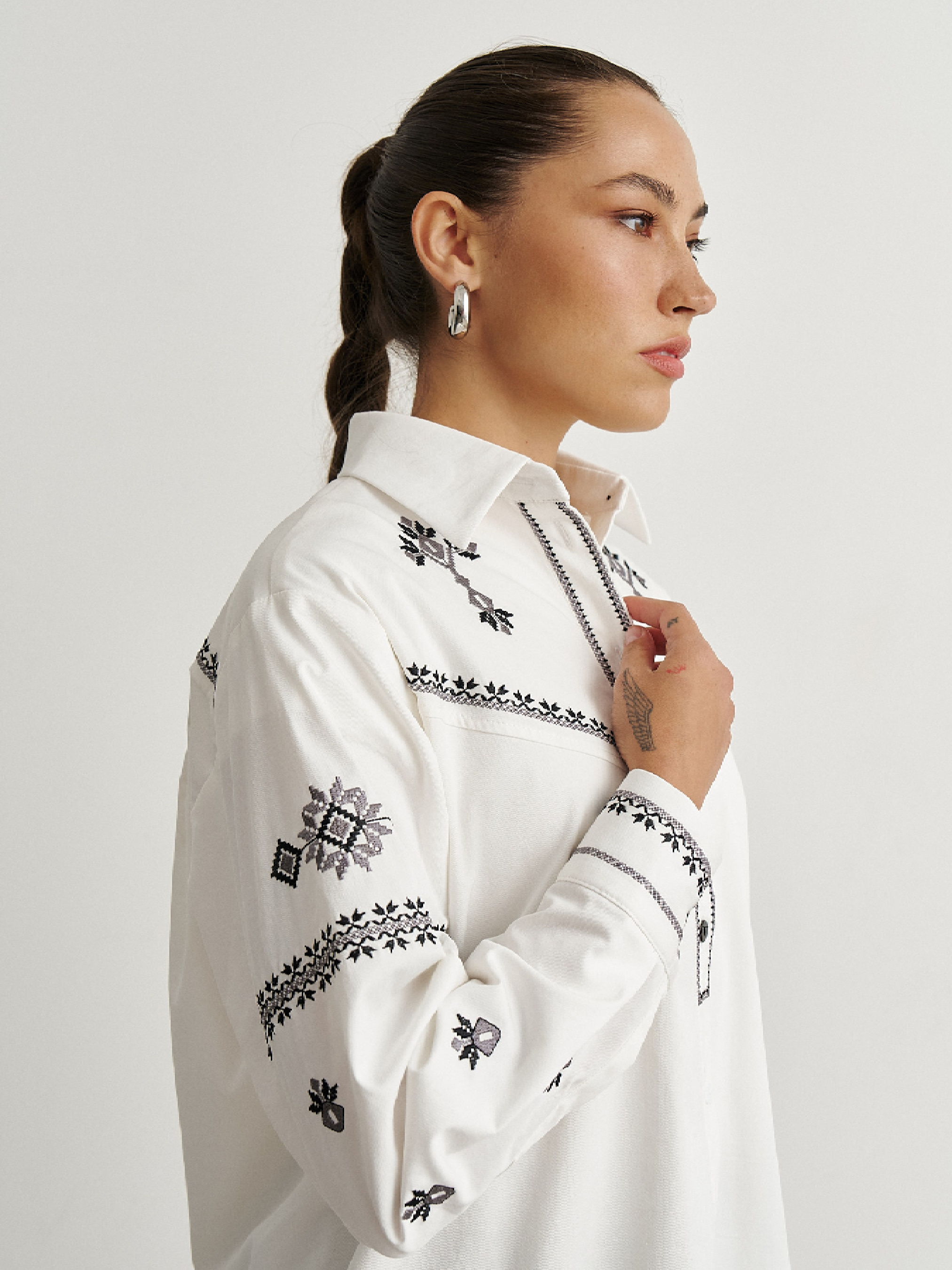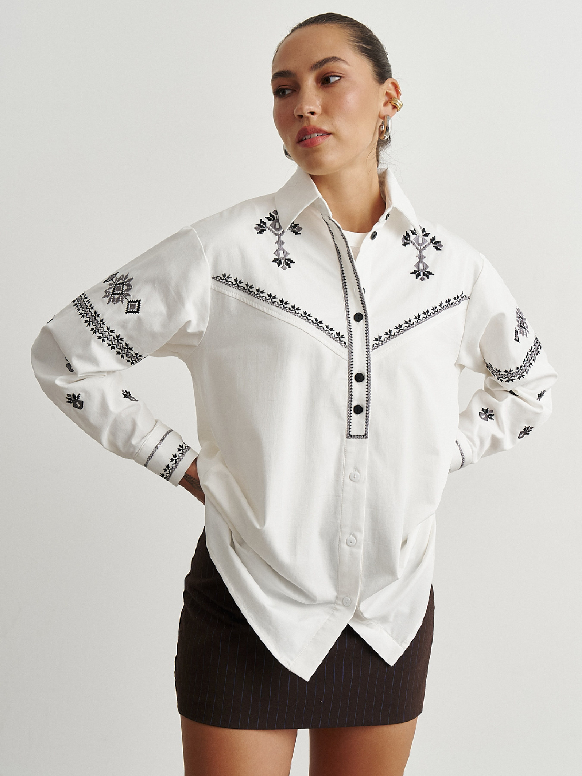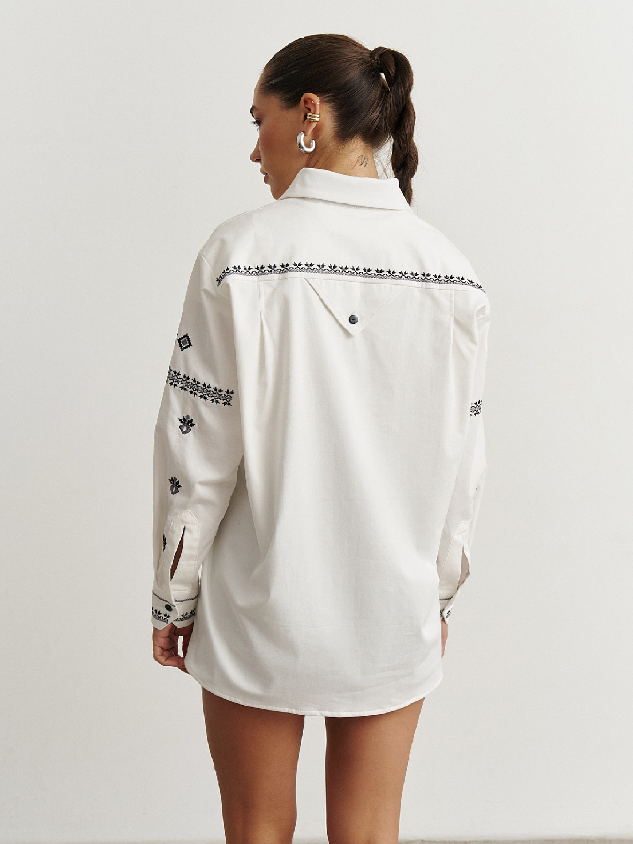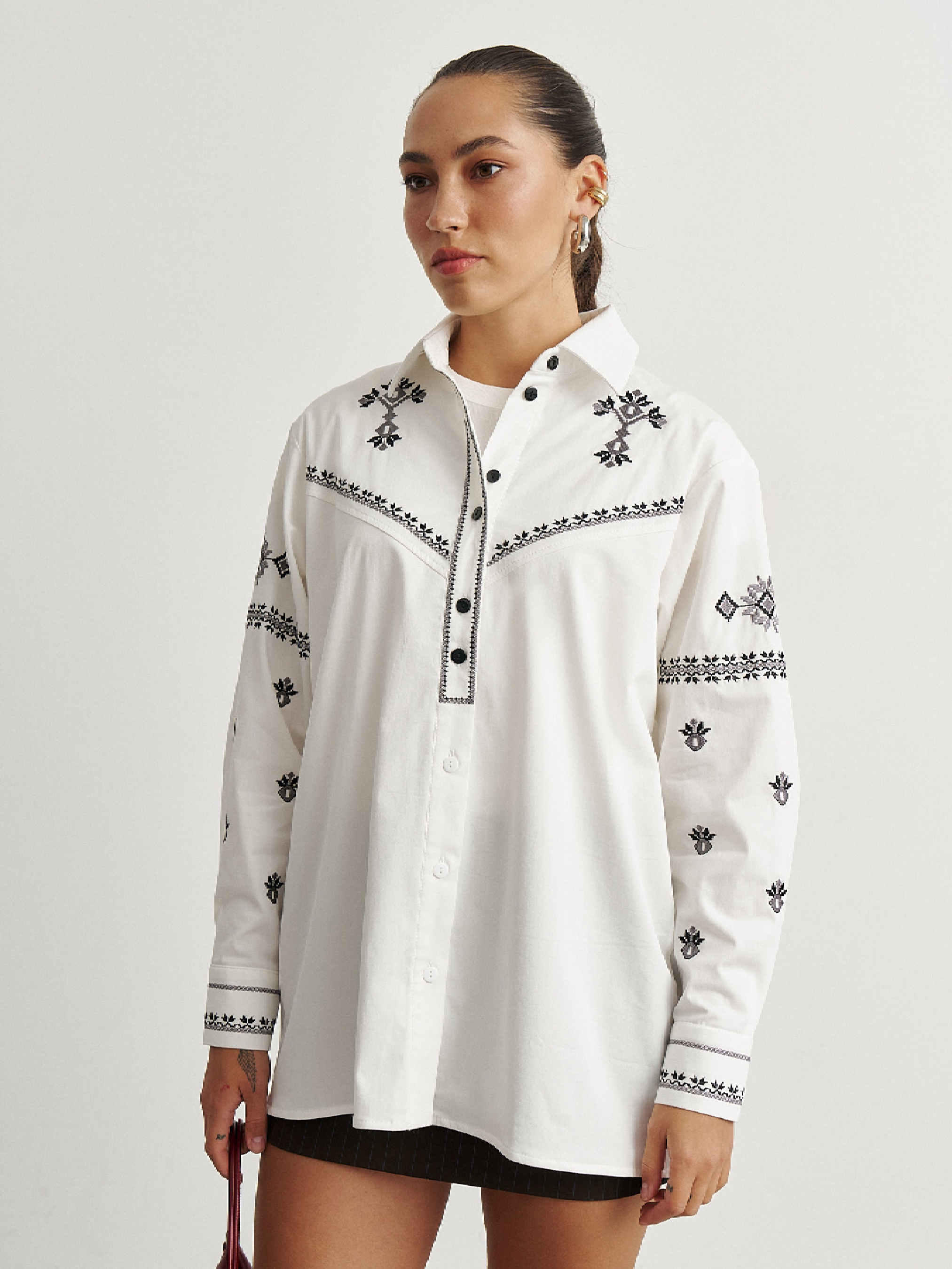 Сорочка оверсайз силуету з бавовняної тканини з вишивкою українського орнаменту. Цей орнамент належить до Полтавського регіону або близької до нього Східно-Середньої України. Такий стиль часто зустрічався саме на Полтавщині, а також у Сорочинцях, Решетилівці, Опішні. Символичне значення орнаменту надає вбранню особливого статусу. Ромб як один із найдавніших символів родючої землі, життєдайної сили. Квіти — символ краси, молодості, духовного цвітіння. Часто вишивали такі мотиви на рушниках для весілля чи благословення, щоб передати побажання щасливої долі. Геометричний бордюр — це охоронна межа, що відділяє святе від буденного. На моделі розмір S. Замір виробу в грудях: S - 112 см, M - 116 см, L - 120 см, XL - 124 см, XXL - 128 см. Замір низу виробу: S - 114 см, M - 118 см, L - 122 см, XL - 126 см, XXL - 130 см.