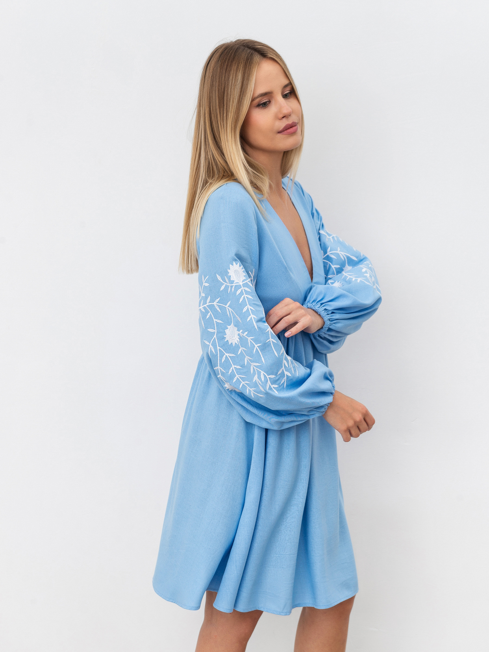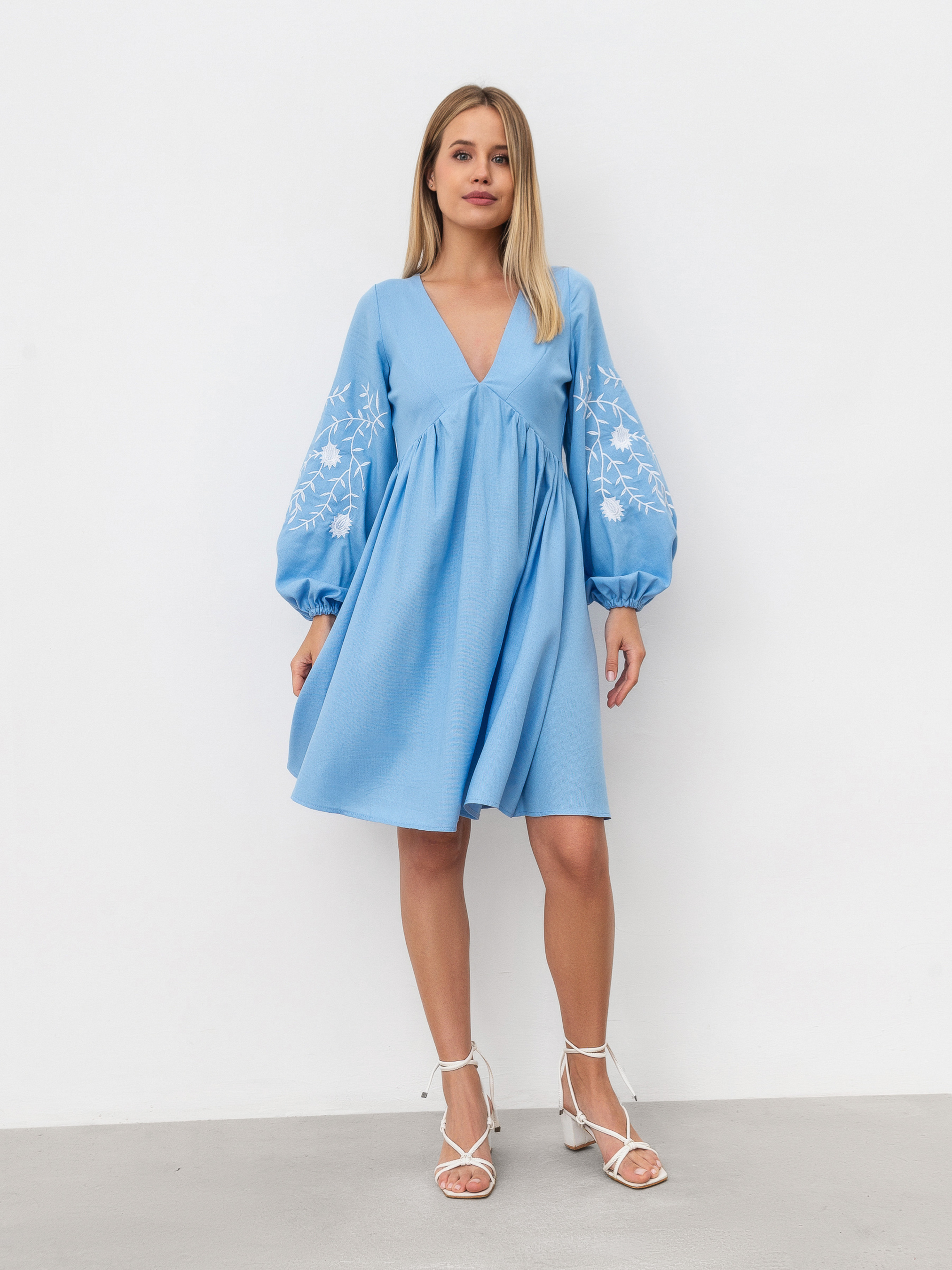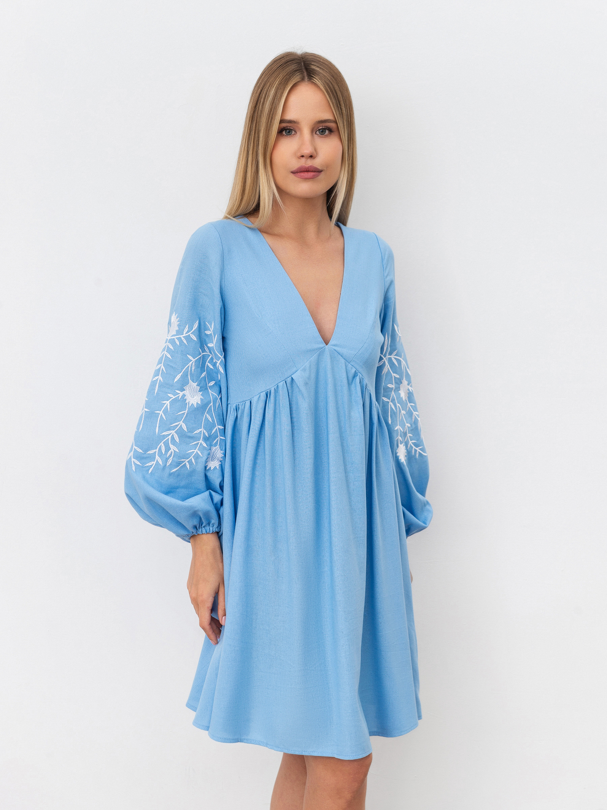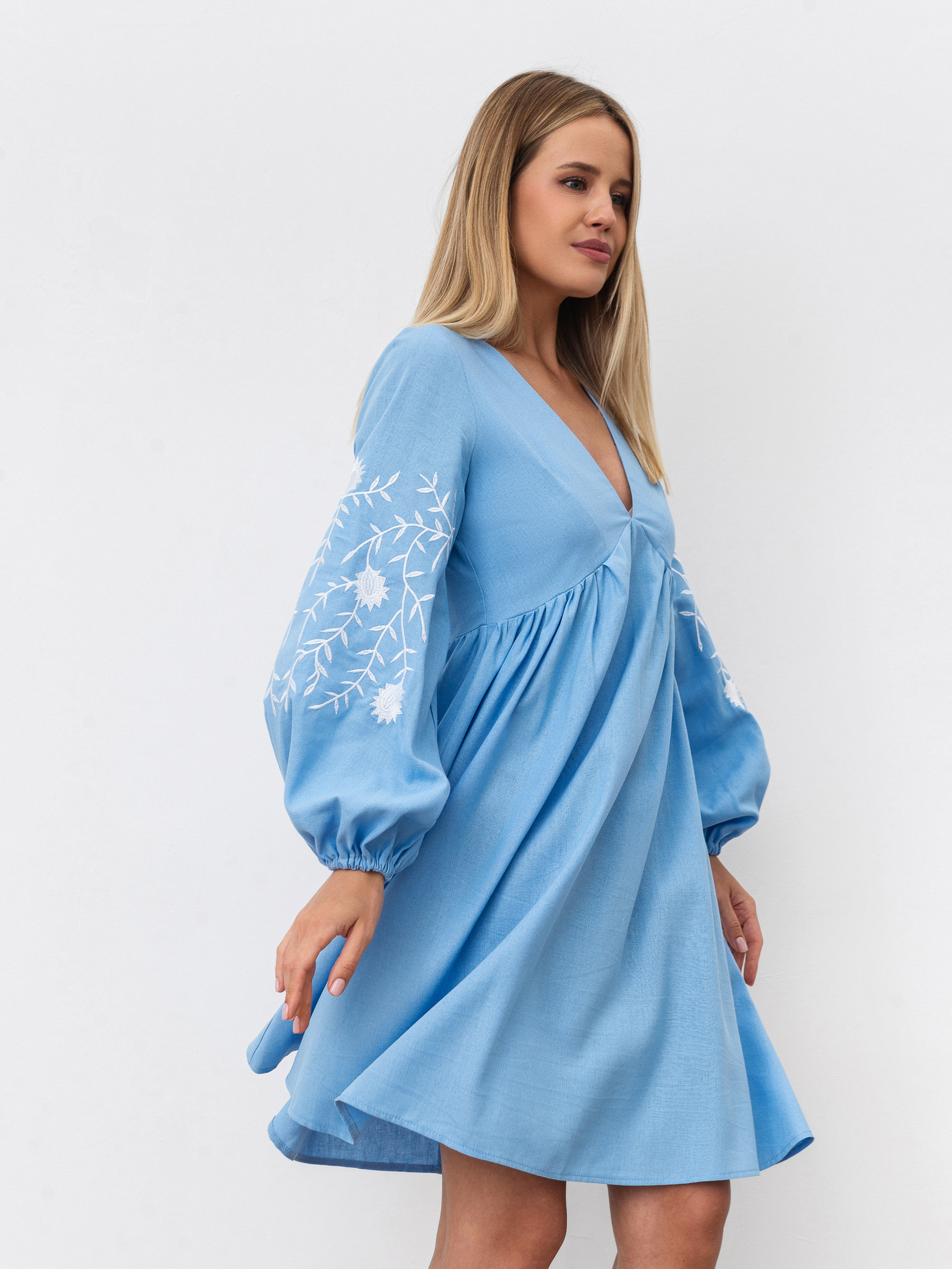 Невагома сукня для літніх прогулянок. Фасон вільний, не сковує рухи. Модель лляна і має актуальний V-подібний виріз. На манжеті є додаткові акценти - маленькі ґудзики. До нього пасуватиме як закрите, так і відкрите взуття, яскраві сумки та тонкі прикраси. XS:- Довжина по спині: 84 см; Довжина рукава: 57 см; Напівобхват грудей: 43 см; Ширина плечей: 31 см; Напівобхват талії: 38 см, S:- Довжина по спині: 85 см; Довжина рукава: 57 см; Напівобхват грудей: 44 см; Ширина плечей: 32 см; Напівобхват талії: 39 см, M: - Довжина по спині : 88 см; Довжина рукава : 57,5 см; Напівобхват грудей : 47 см; Ширина плечей : 33 см; Напівобхват талії : 42 см, L:- Довжина по спині : 88 см; Довжина рукава : 57,5 см; Напівобхват грудей : 50 см; Ширина плечей : 34 см; Напівобхват талії : 42 см.