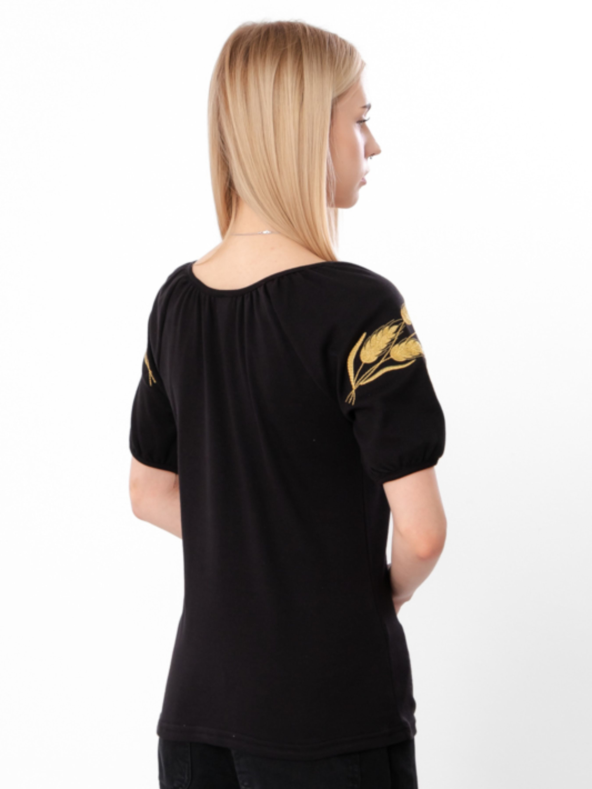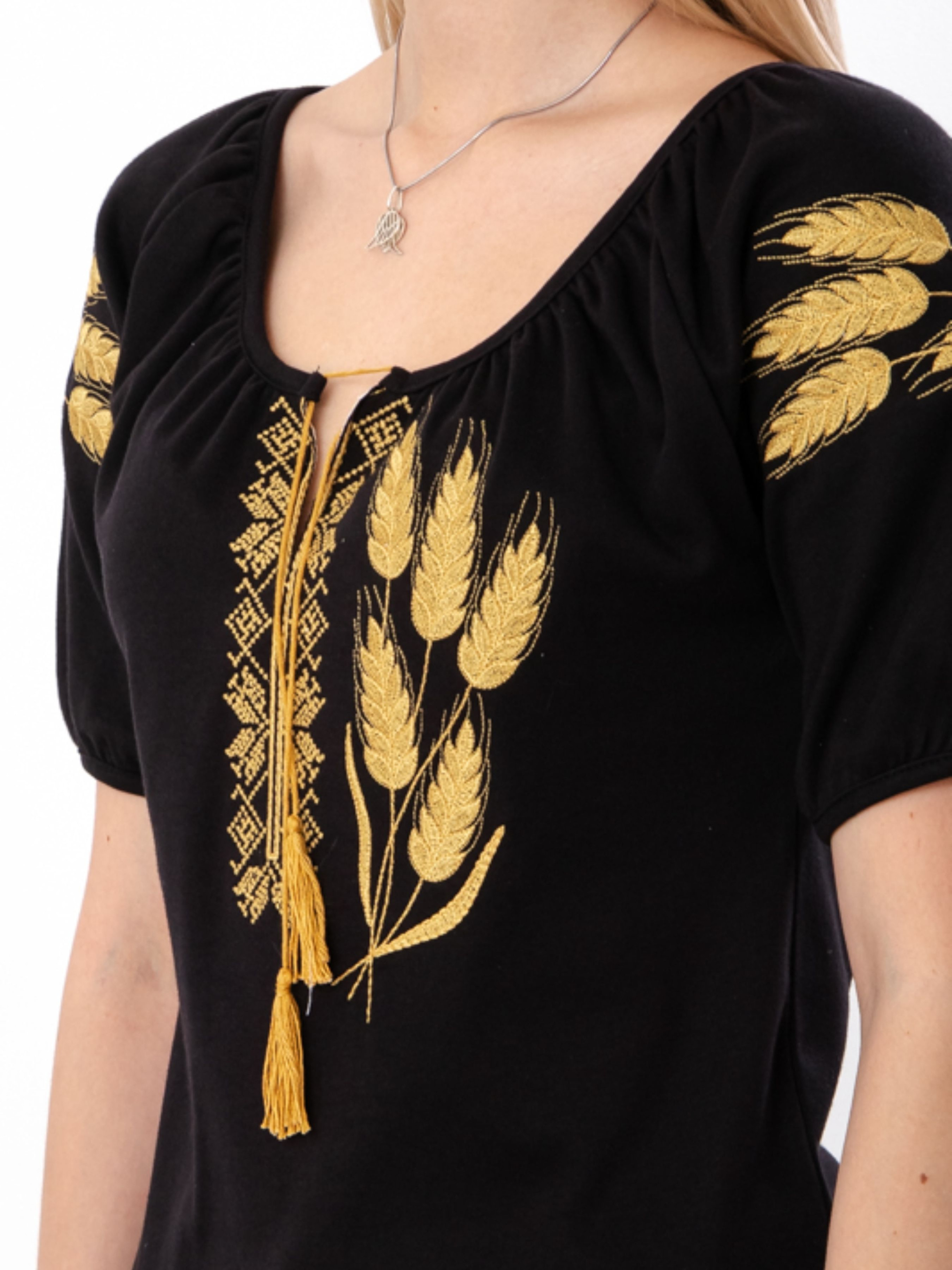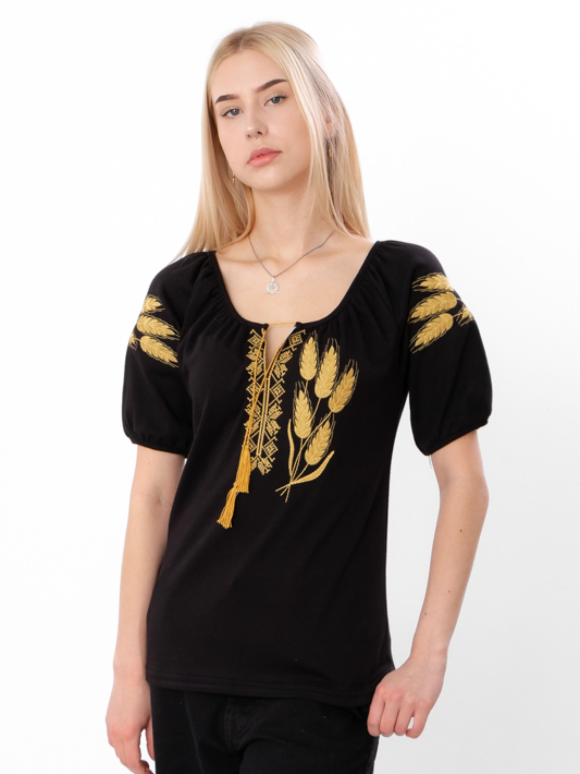 Полотно: інтерлок чорний Склад полотна: 100% бавовна Розмір: 44-54 Жіноча вишиванка з коротким рукавом «Колоски» з інтерлоку поєднує традиції та сучасний комфорт. М’який, щільний трикотаж не просвічує, зносостійкий і тримає форму після прання. Чорна основа підкреслює контраст орнаменту, що символізує родючість і багатство. Короткий рукав і вільний крій ідеальні для теплої пори, підходять для щоденного носіння та свят. Стриманий дизайн легко поєднується з різним одягом, створюючи стильні образи. Ця вишиванка — символ жіночності, гідності та любові до рідної землі, що дарує комфорт і впевненість щодня.