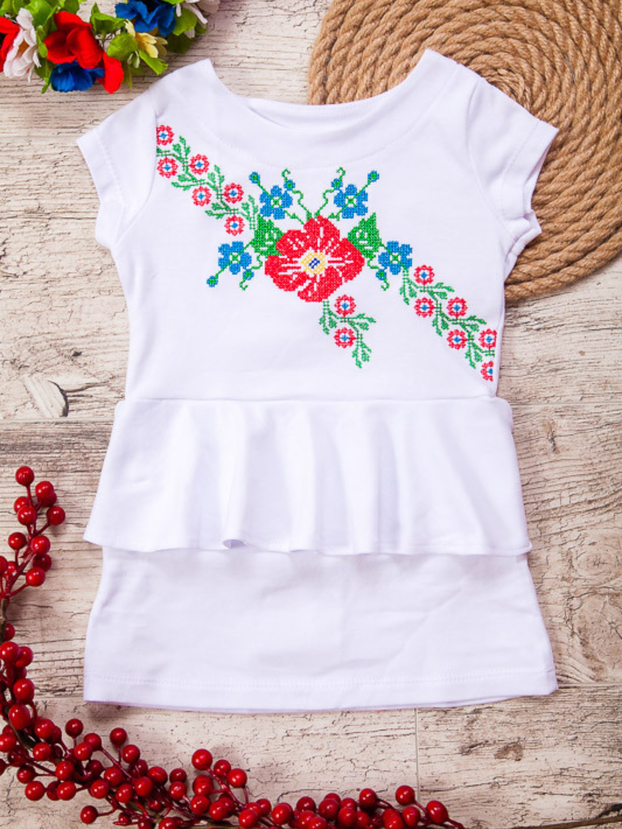 Полотно: інтерлок однотонний Склад полотна: 100% бавовна Розмір: 86-98 Сукня-вишиванка з однотонного інтерлоку для дівчаток випускається в різних барвистих кольорах. Модель зі спідницею-баскою сукня суцільна. Прикрашено гарною машинною вишивкою хрестиком. Прекрасне плаття буде чудово виглядати на вашій дитині а навколишні просто будуть в захваті від вашої крихітки!