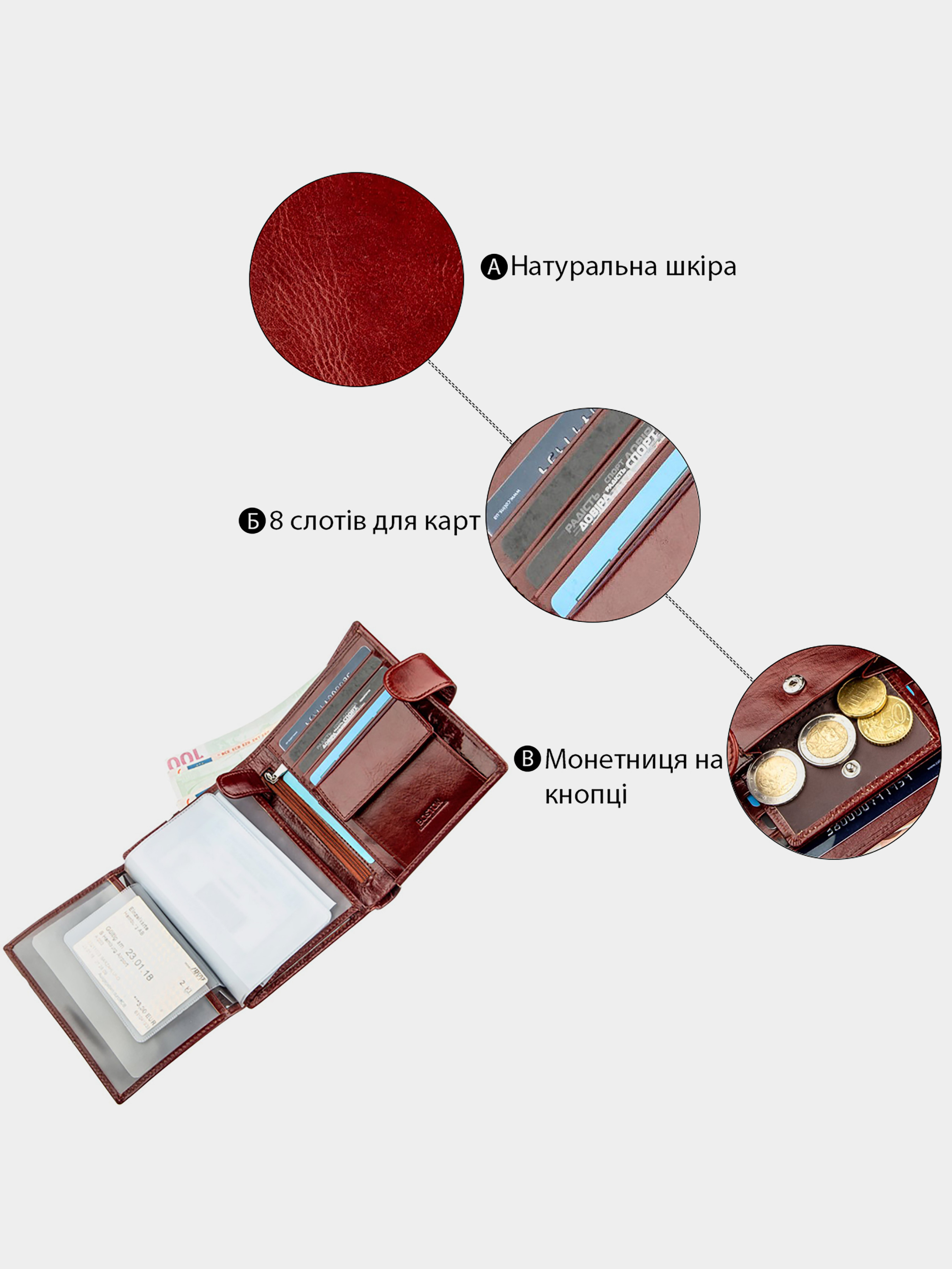Матеріал: натуральна шкіра; Розміри (ШхВ, см): 11х14; Колір: коричневий; Країна виробник: Китай; Країна походження ТМ: Україна. Опис: - чоловічий гаманець з натуральної шкіри на кнопці; - всередині розташовано два великих відділення для купюр по всій довжині; - одне велике відділення на блискавці по всій довжині; - відділення для монет на кнопці; - відділення на блискавці для цінних речей по центру; - три прозорих відділення для карт; - відділення для фото; - 8 відділень для карток; - одне потаємне відділення; - шість прозорих вкладок, в тому числі і для документів. Дуже практичний і зручний чоловічий гаманець з натуральної шкіри для повсякденного життя. Має гарний і оригінальний коричневий колір з червоним відтінком. Його можна охарактеризувати високою функціональністю і відмінною місткістю, завдяки його продуманому до дрібниць дизайну. В даному гаманці є місце не тільки для купюр і монет, а й для різних карт, документів та інших важливих речей. Такий гаманець стане відмінним подарунком для вашої дорогої людини на день народження або будь-яке інше свято. При покупці Ви отримаєте упаковку даного аксесуара в фірмову картонну коробку.