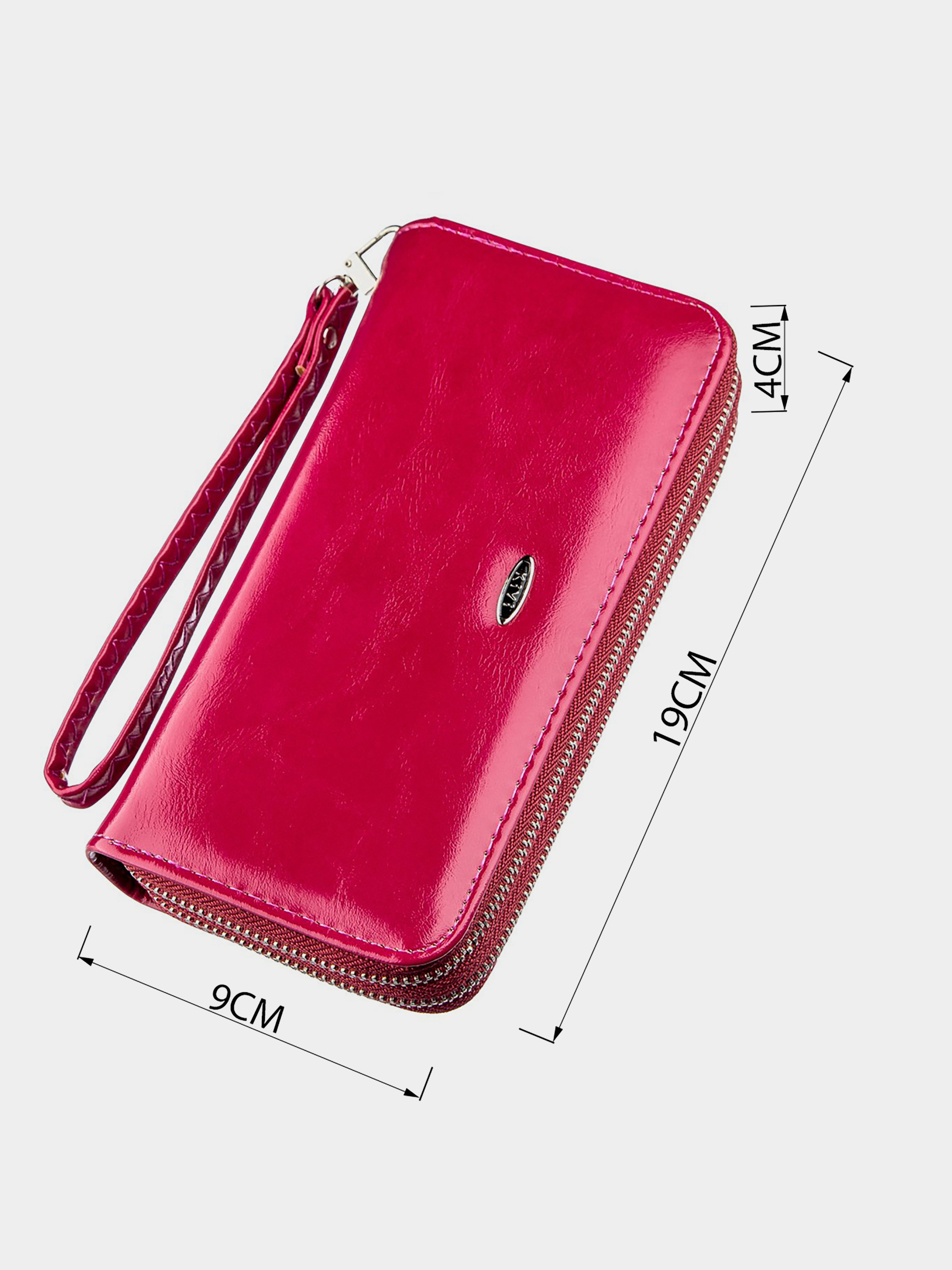 Матеріал: екошкіра; Колір: темно-рожевий; Розміри (ШхВхГ): 9х19х4; Країна виробництва: Китай. Особливості -2 автономних відділення У ближньому: -2 відділення для банкнот; -1 відділення на блискавці; -2 відкритих кишені; -8 слотів для кредиток. У далекому: -2 відділення для банкнот; Ремінець на зап'ясті знімається. Чудовий клатч на дві блискавки насиченого рожевого кольору. Клатч ви можете носити як в сумочці, так і в руках за допомогою ручки на зап'ясті, яка йде в комплекті. На лицьовій стороні аксесуара розташований металевий логотип бренду. Матеріал, з якого виконаний гаманець - міцний шкірозамінник. Гаманець дуже доступний і при цьому досить якісний. Виріб буде хорошим подарунком для будь-якої дівчини.