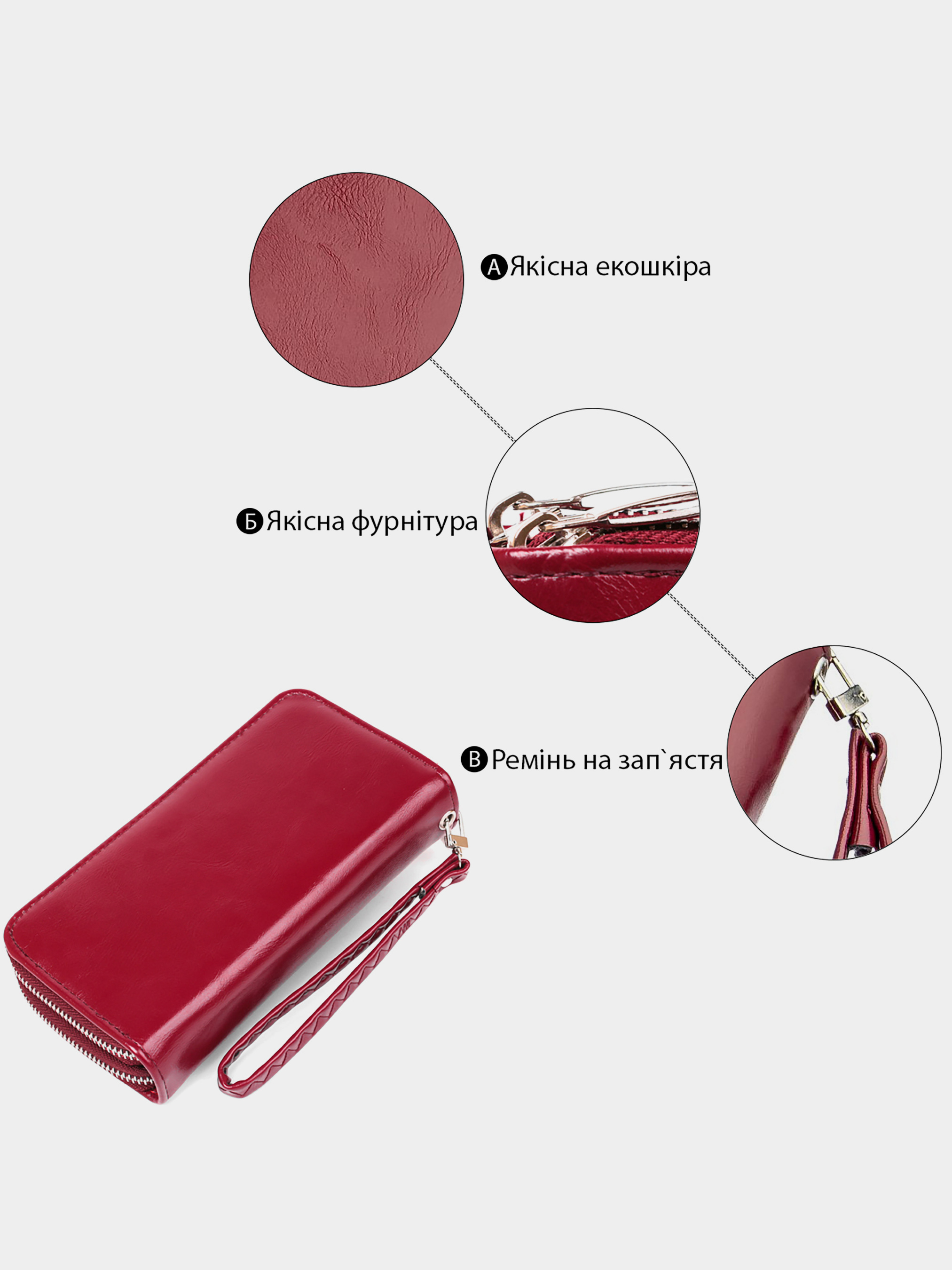 Матеріал: екошкіра; Колір: малиновий; Розміри (ШхВхГ): 9х19х4; Країна виробництва: Китай. Особливості -2 автономних відділення У ближньому: -2 відділення для банкнот; -1 відділення на блискавці; -2 відкритих кишені; -8 слотів для кредиток. У далекому: -2 відділення для банкнот; Ремінець на зап'ясті знімається. Класичний і доступний жіночий гаманець. Така модель сподобається тим дівчатам, які носять з собою багато карток і не хочуть викладати їх з гаманця. Місткий обсяг гаманця не принесе вам незручності у використанні. Малиновий колір і дизайн поєднуватимуться з будь-яким одягом. Гаманець доповнений якісною фурнітурою і виконаний з якісного шкірозамінника.