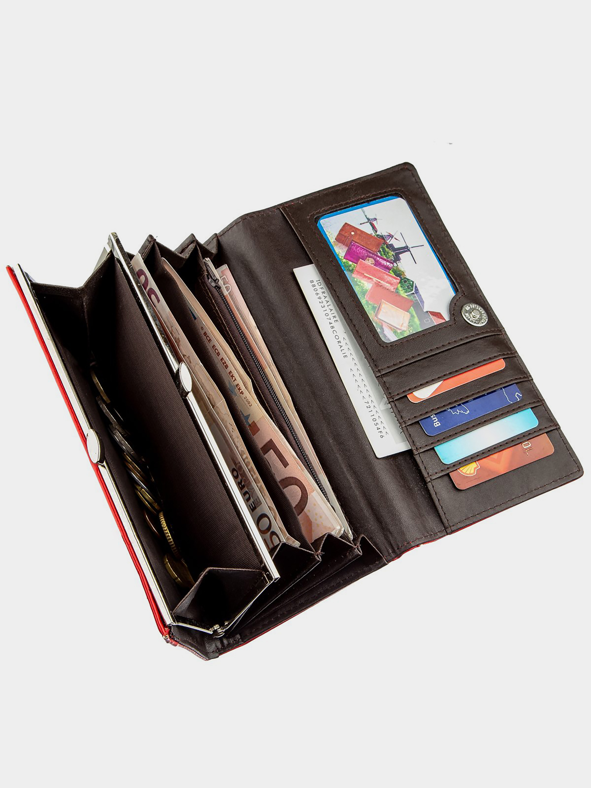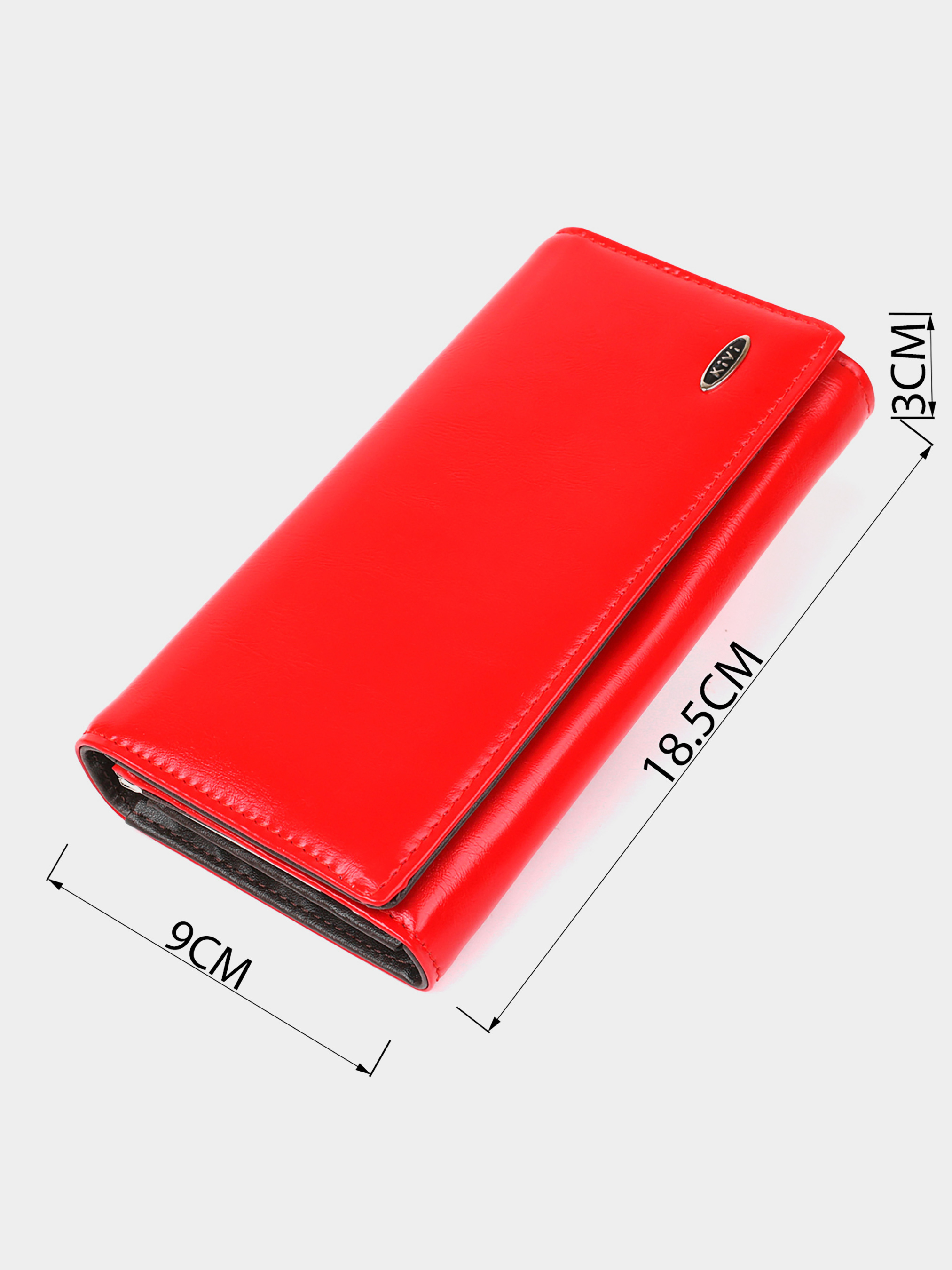 Матеріал: екошкіра; Колір: червоний; Розміри (ШхВхГ): 9х18,5х3; Країна виробництва: Китай. Особливості: -3 відділення для купюр; -відділення на блискавці; -монетниця на механічній застібці; -5 слотів для кредиток (один з них під прозорою плівкою для фото). Багато дівчат віддають перевагу червоному кольору гаманця. Тим більше з таким функціоналом. Містка і одночасно компактна модель гаманця. Виріб має три містких відділення для купюр і окремий блок з відділеннями для карток. Закривається гаманець на клапан з магнітною кнопкою. Усередині гаманця підкладка з поєднанням екошкіри і якісного текстилю. На лицьовій стороні присутнє металеве лого бренду.
