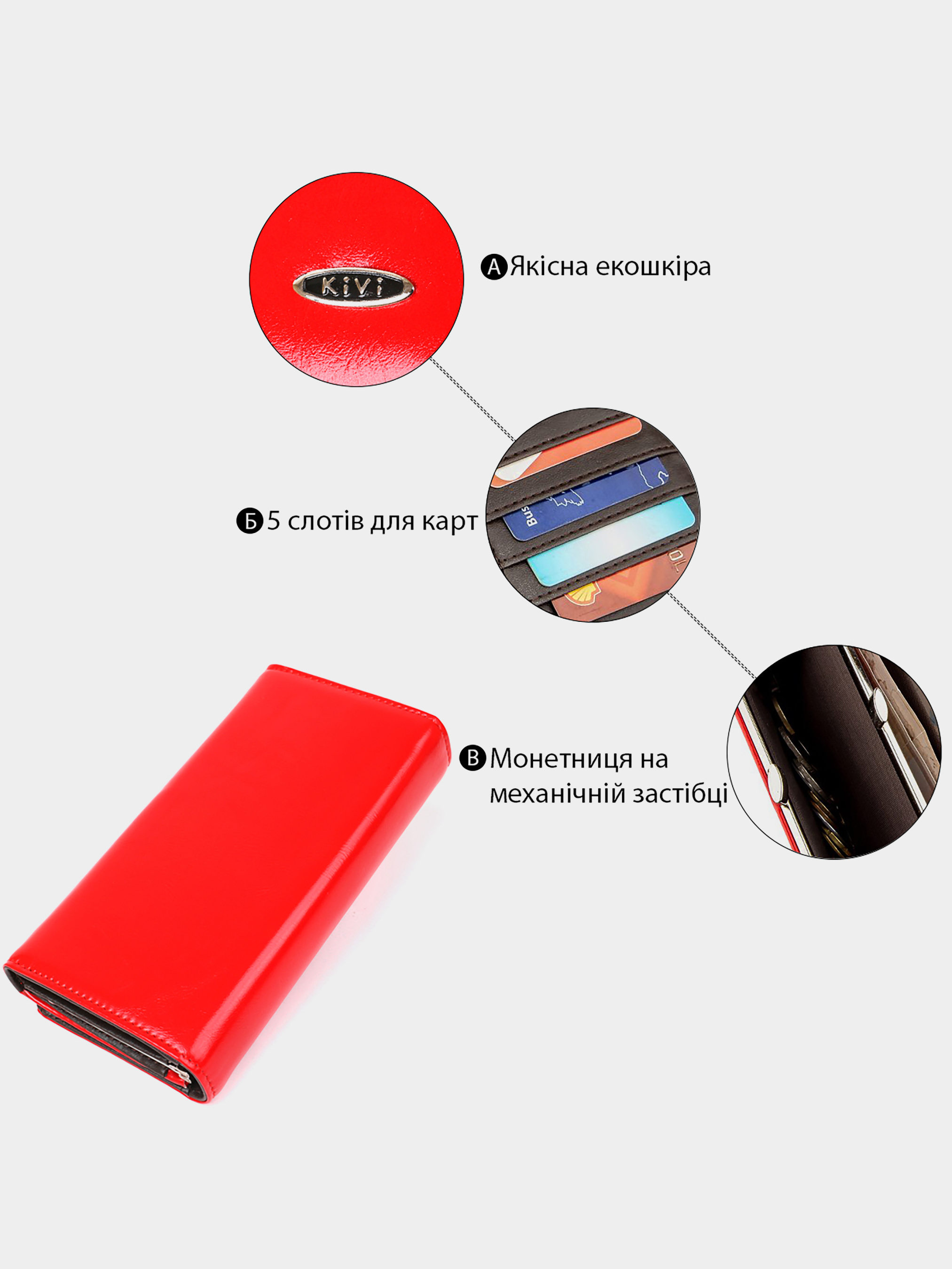 Kivi — бренд, що спеціалізується на виробництві жіночих гаманців та аксесуарів із високоякісної екошкіри. Асортимент продукції включає різноманітні моделі гаманців, зокрема з гладкої та зернистої екошкіри, а також лакові варіанти. Вироби Kivi відзначаються стильним дизайном, функціональністю та доступною ціною.