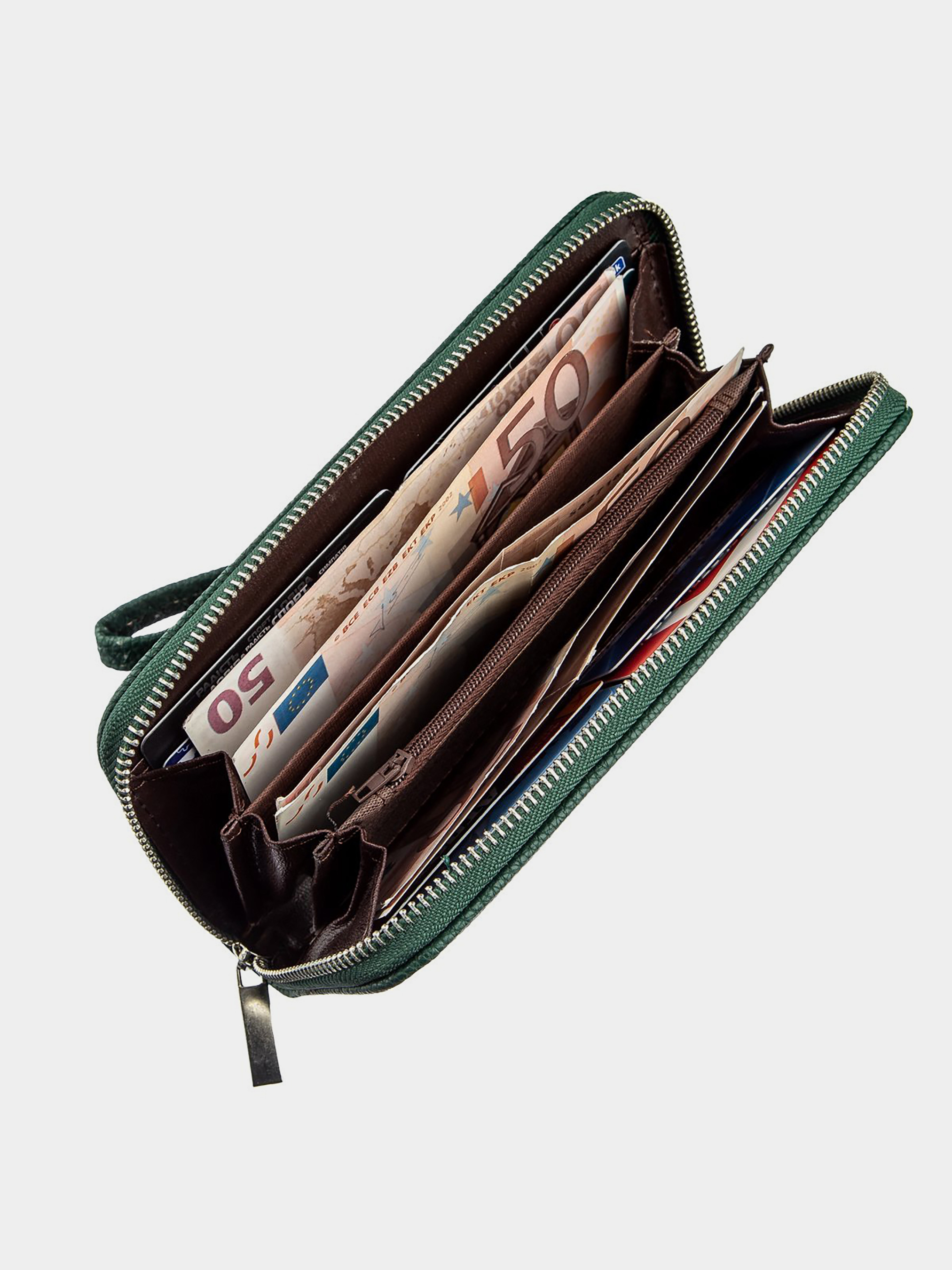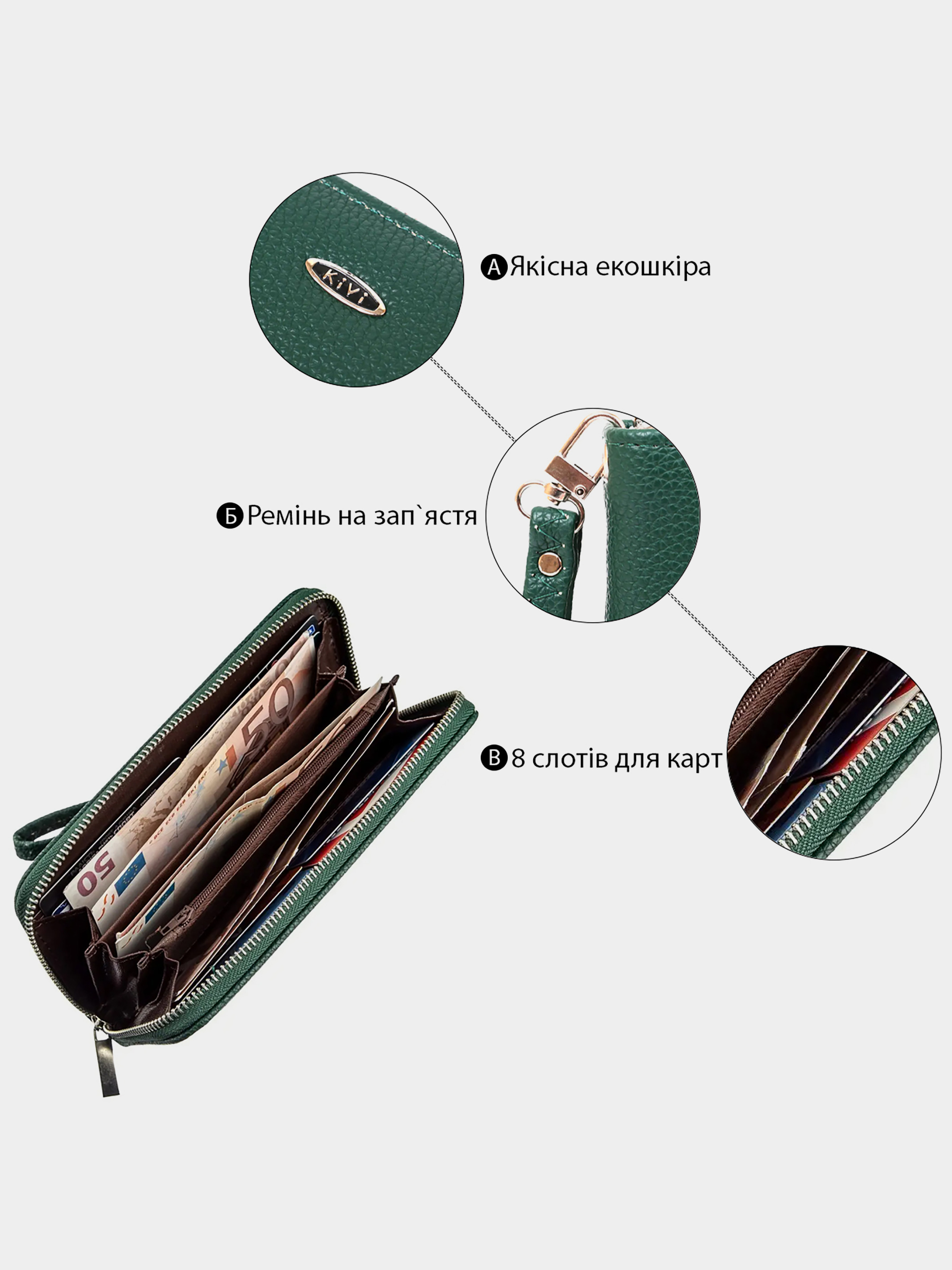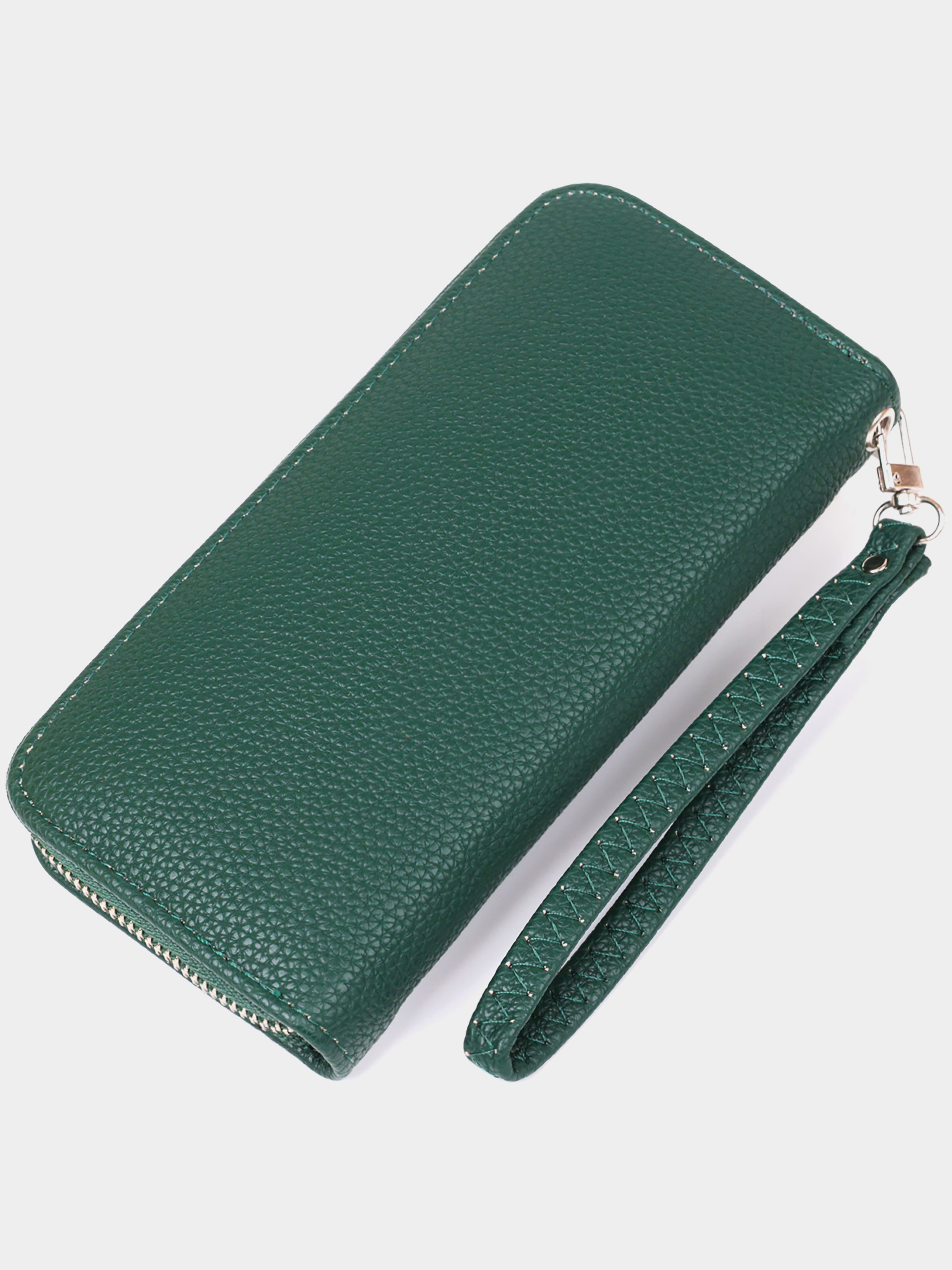 Матеріал: екошкіра; Колір: зелений; Розміри (ШхВхГ): 9х19х2,5; Країна виробництва: Китай. Особливості -3 відділення для купюр; -відділення на блискавці; -2 відкриті кишені під стінками; -8 слотів для кредиток. Гаманець на одне відділення з якісної екошкіри. Аксесуар має дрібне тиснення. Усередині гаманця є ремінець-петелька на зап'ястя. Особливістю є те, що ви можете носити гаманець, як в сумочці, так і на зап'ясті. Гаманець горизонтального типу зовсім не вибагливий у догляді і досить довго носиться. Якщо ви шукаєте недорогий, але при цьому гідний гаманець радимо придивитися до цієї моделі. Вона стане прекрасним подарунком для близької людини. Аксесуар упакований в прозорий пакет.
