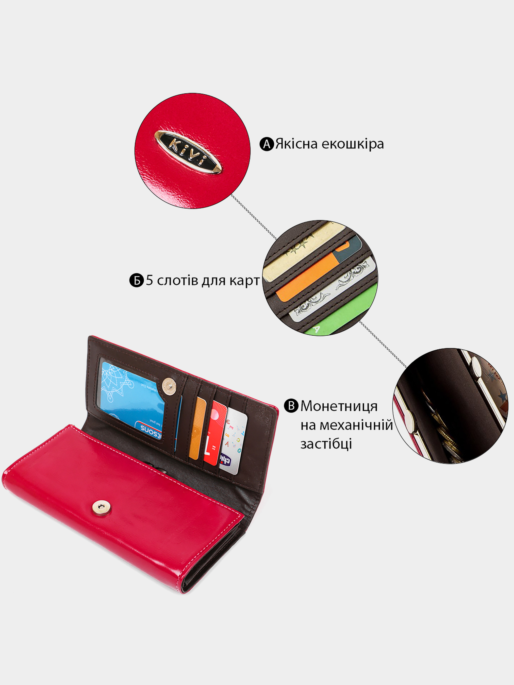 Kivi — бренд, що спеціалізується на виробництві жіночих гаманців та аксесуарів із високоякісної екошкіри. Асортимент продукції включає різноманітні моделі гаманців, зокрема з гладкої та зернистої екошкіри, а також лакові варіанти. Вироби Kivi відзначаються стильним дизайном, функціональністю та доступною ціною.