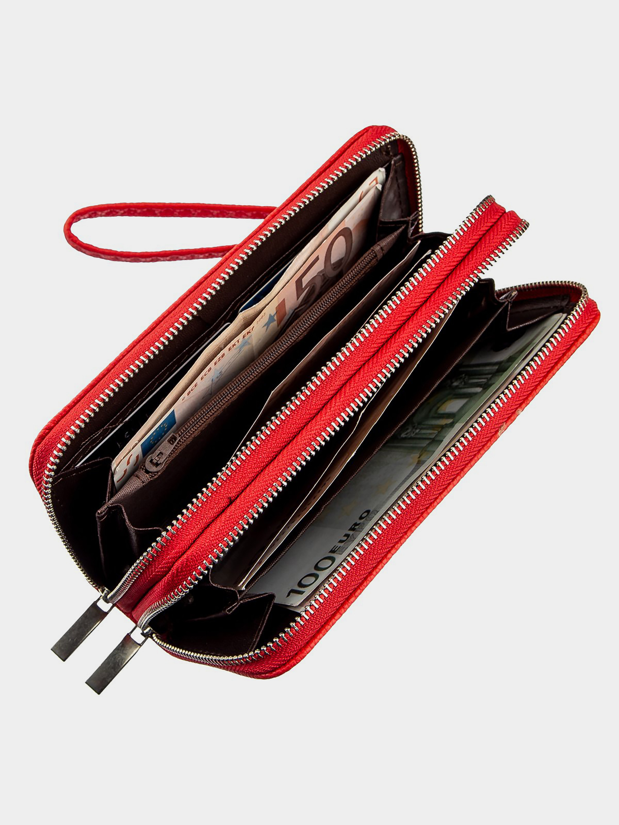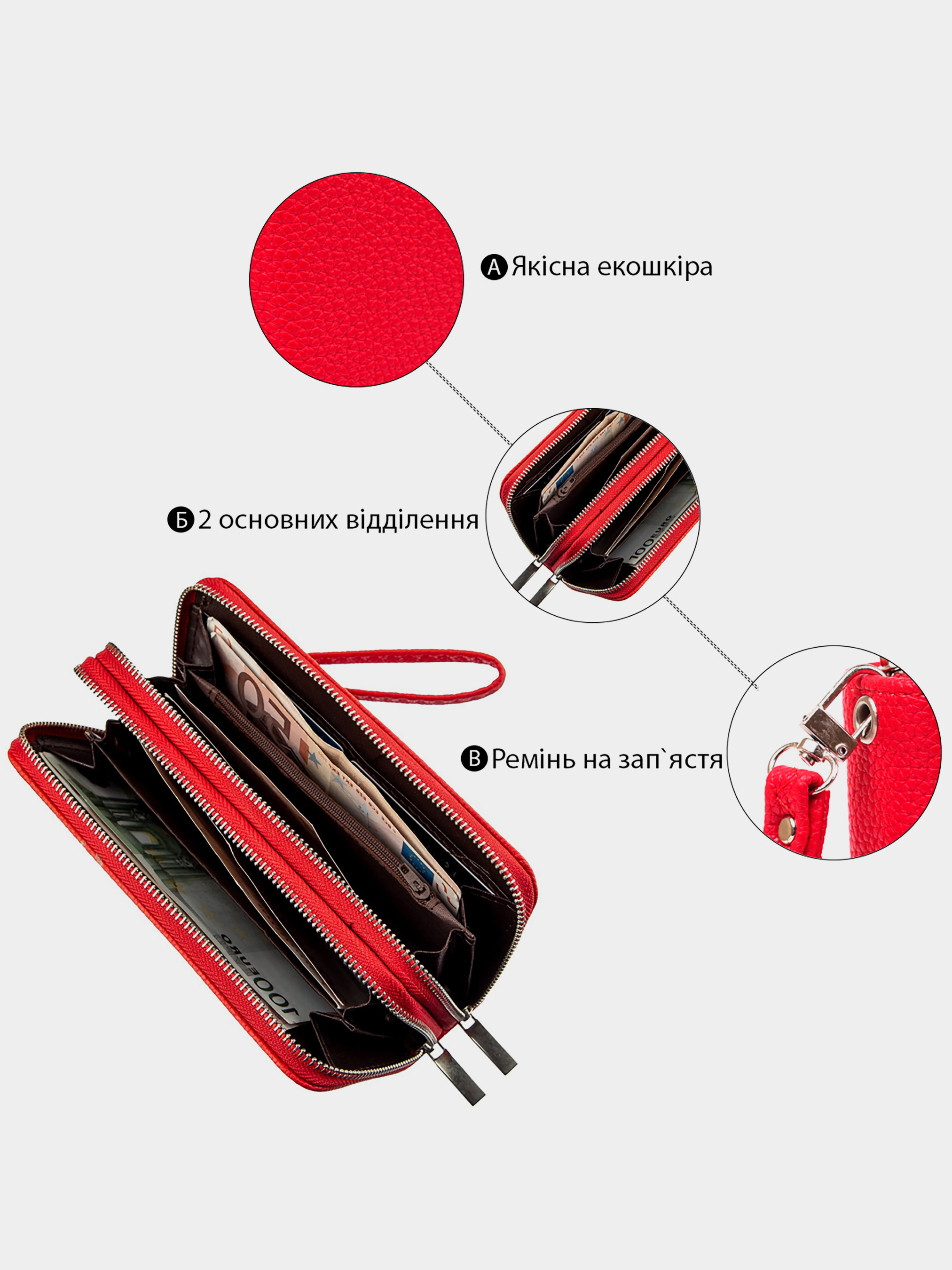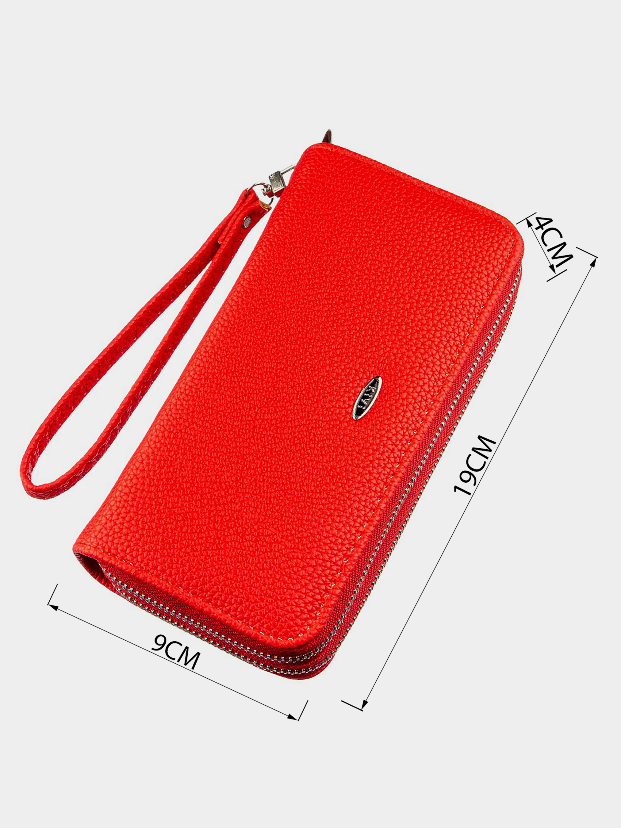 Матеріал: екошкіра; Колір: яскраво-червоний; Розміри (ШхВхГ): 9х19х4; Країна виробництва: Китай. Особливості -2 автономних відділення У ближньому: -2 відділення для банкнот; -1 відділення на блискавці; -2 відкритих кишені; -8 слотів для кредиток. У далекому: -2 відділення для банкнот; Ремінець на зап'ястя, що знімається. Гаманець з двома автономними і місткими відділеннями. Виріб має зручний функціонал, підібраний по всіх побажаннях дівчат. Виготовлена модель з екошкіри зернистого типу і яскраво-червоного кольору. Впевнені, що гаманець буде до душі будь-якій дівчині. Особливо модель сподобається шанувальницям яскравих відтінків і тим, хто любить досить місткі моделі гаманців. На зовнішній стороні аксесуара металевий логотип бренду. Гаманець буде прекрасним подарунком для близької людини.