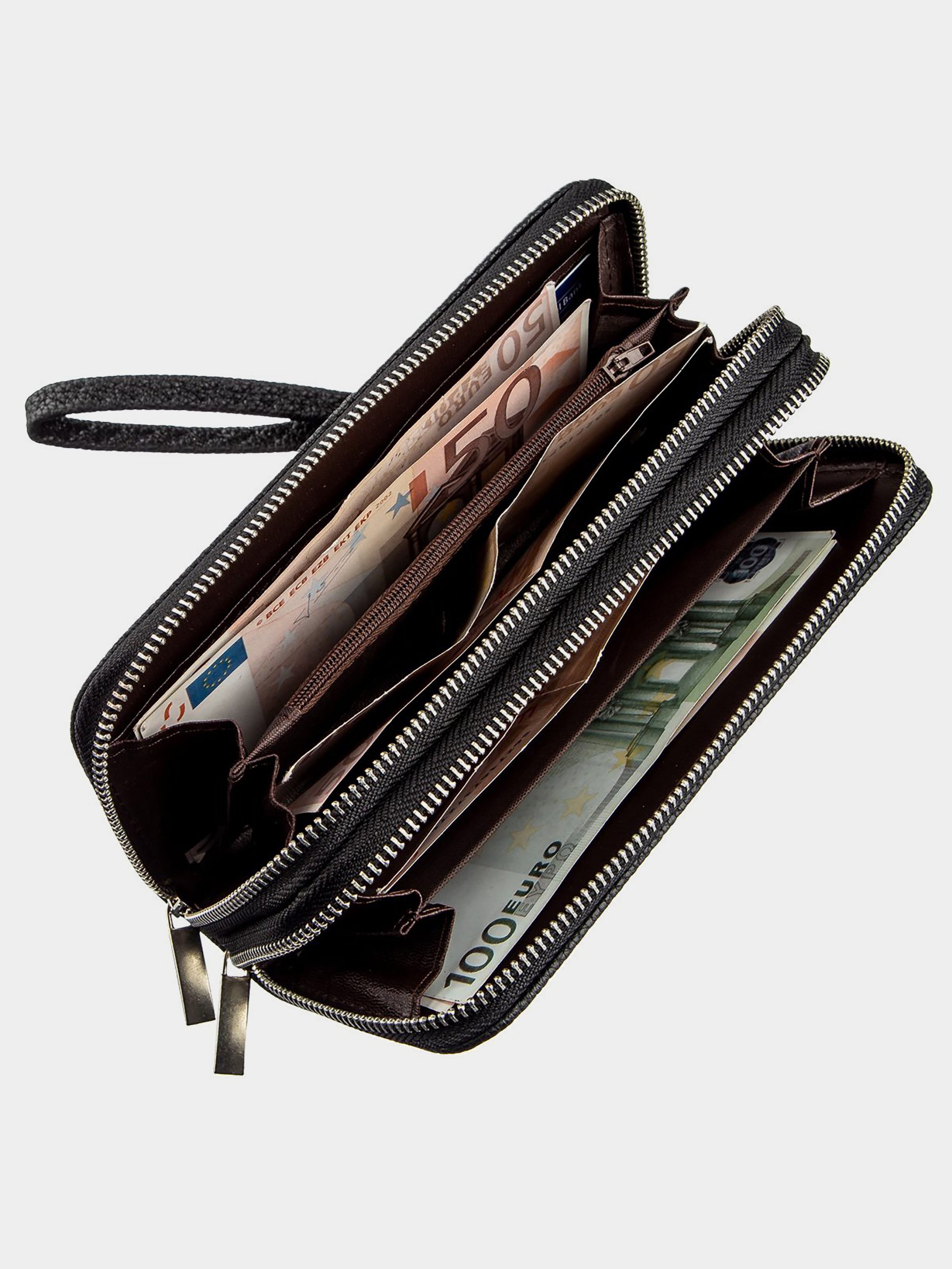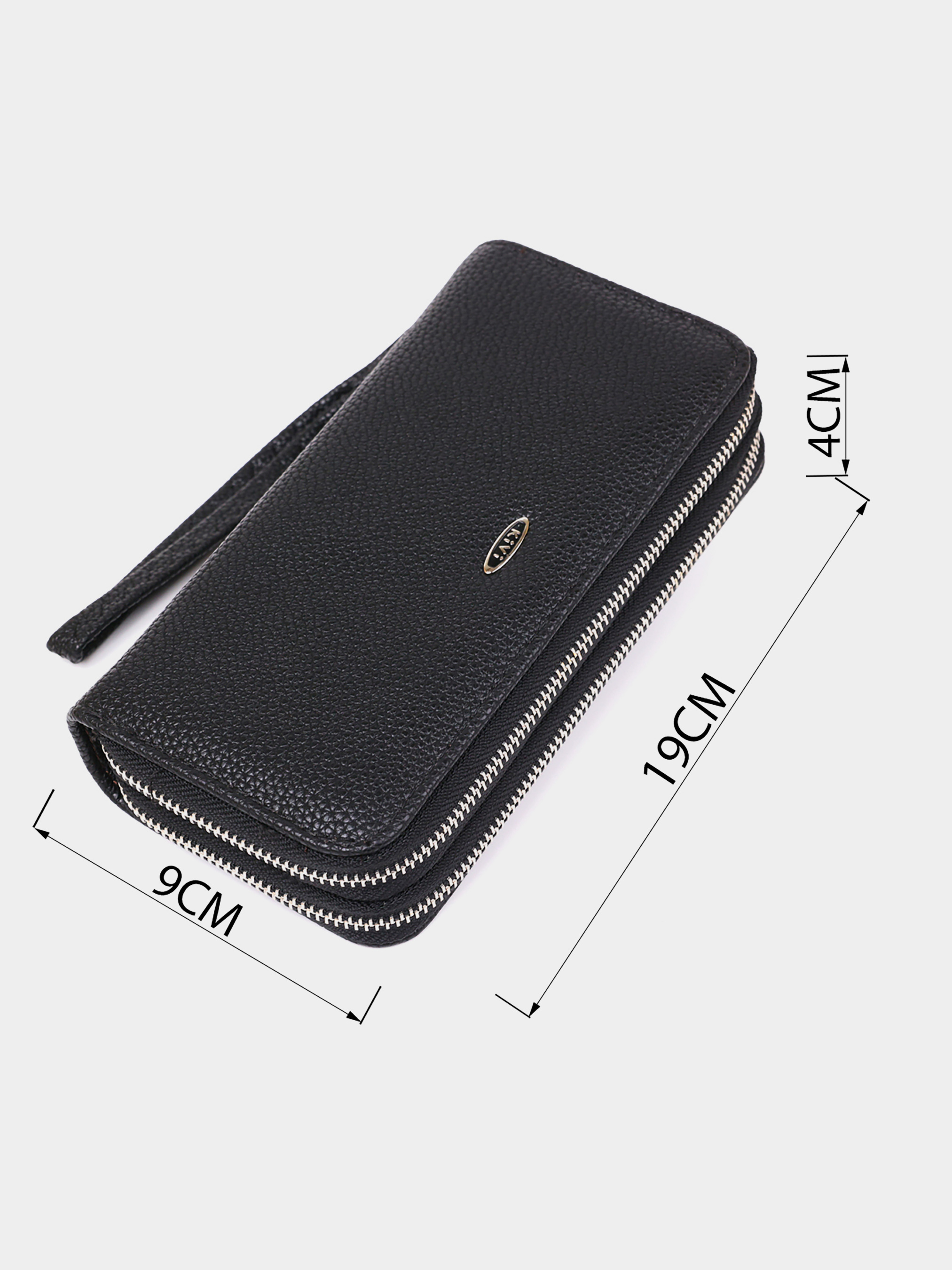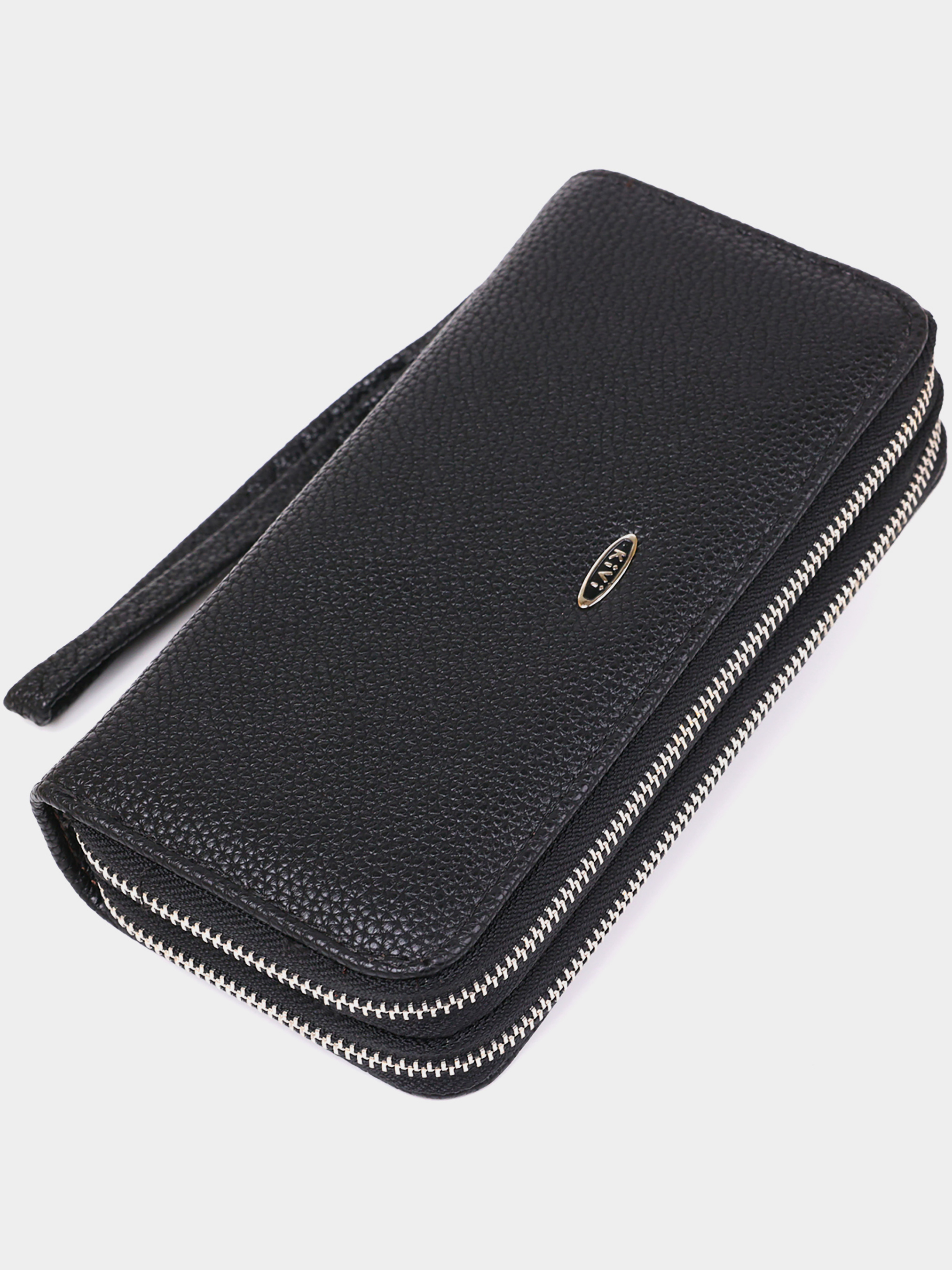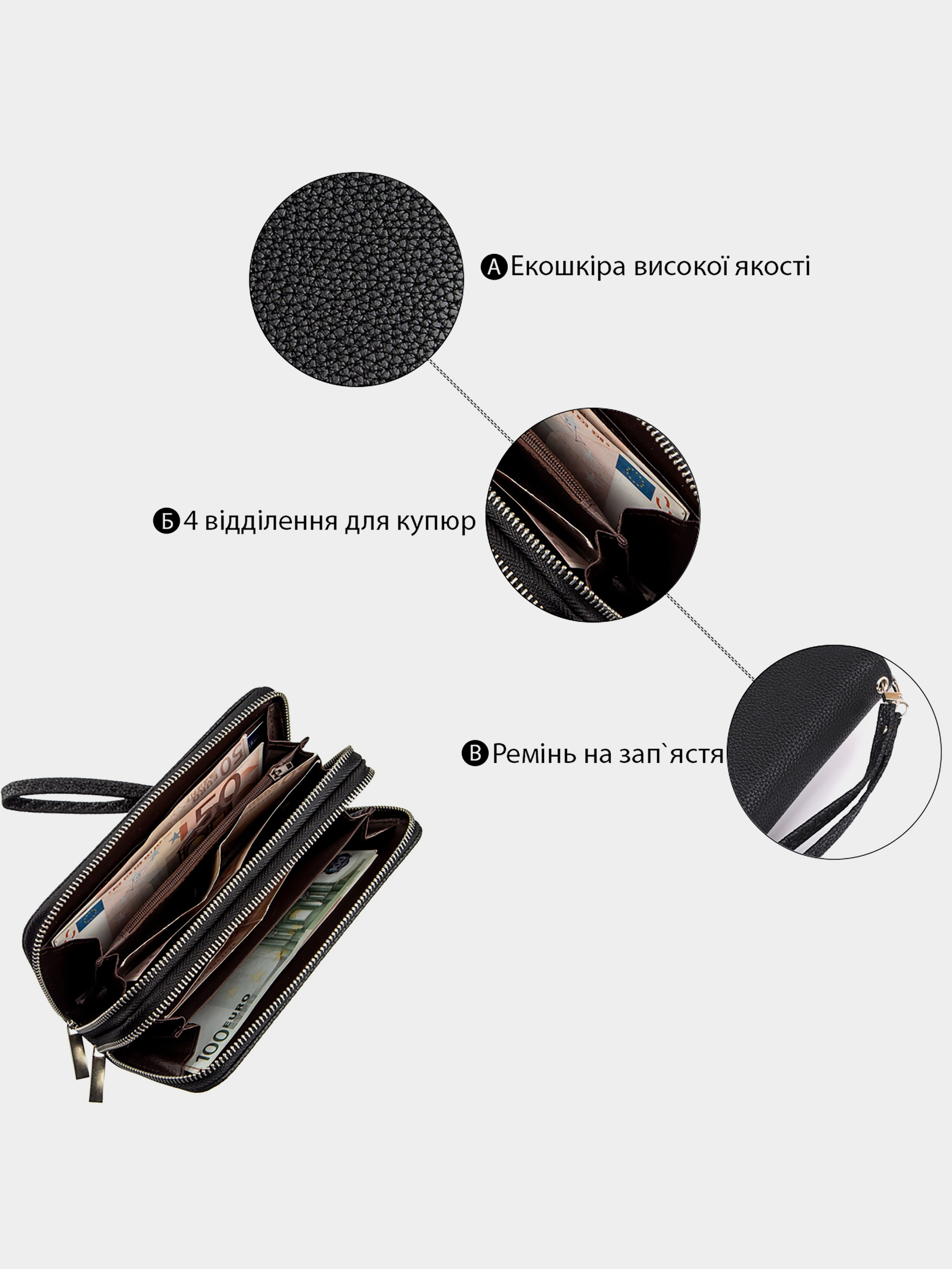 Матеріал: екошкіра; Колір: чорний; Розміри (ШхВхГ): 9х19х4; Країна виробництва: Китай. Особливості -2 автономних відділення У ближньому: -2 відділення для банкнот; -1 відділення на блискавці; -2 відкритих кишені; -8 слотів для кредиток. У далекому: -2 відділення для банкнот; Ремінець на зап'ястя, що знімається. Модель гаманця з двома автономними відділеннями. У магазині гаманець представлений в різних кольорах. Аксесуар виконаний з екошкіри і має доступну вартість. Якщо ви не любите переплачувати за натуральну шкіру така модель точно буде для вас. У комплекті до гаманця йде ремінець-петелька за допомогою якого ви зможете носити виріб, як клатч. Гаманець буде прекрасним подарунком для близької людини.