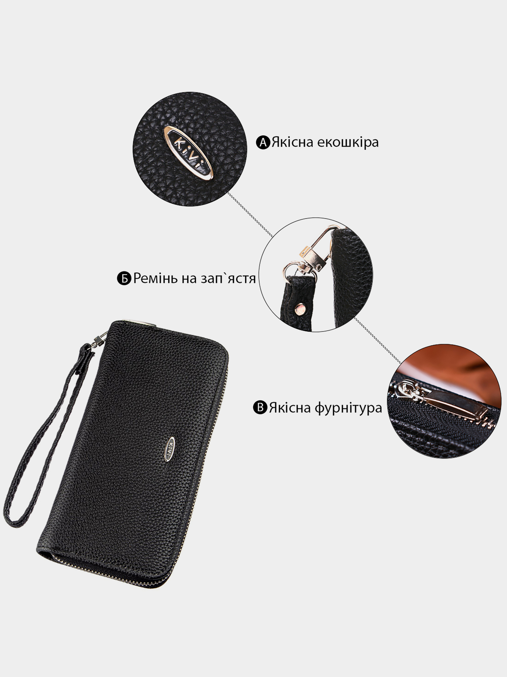 Kivi — бренд, що спеціалізується на виробництві жіночих гаманців та аксесуарів із високоякісної екошкіри. Асортимент продукції включає різноманітні моделі гаманців, зокрема з гладкої та зернистої екошкіри, а також лакові варіанти. Вироби Kivi відзначаються стильним дизайном, функціональністю та доступною ціною.