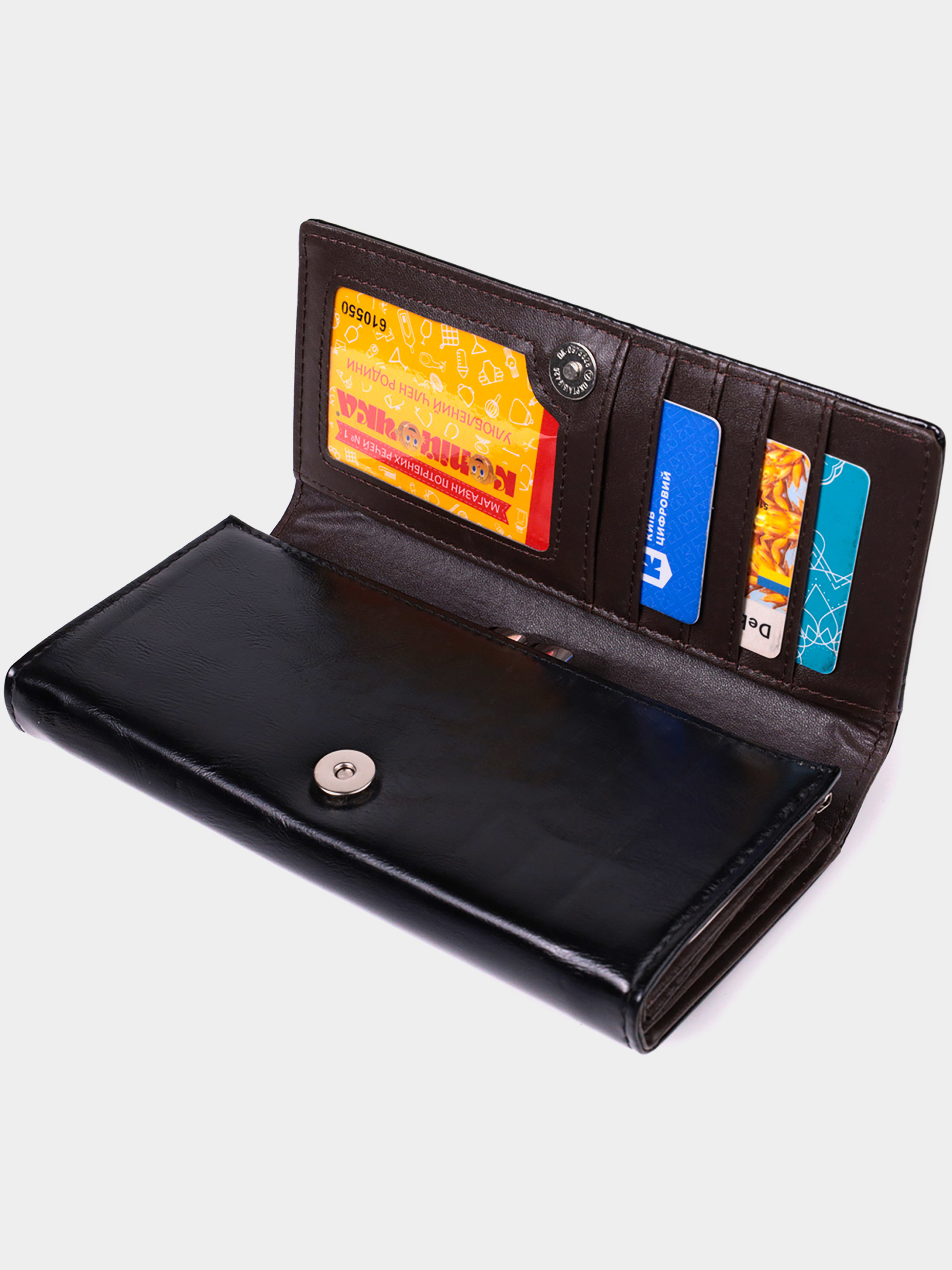 Матеріал: екошкіра; Колір: чорний; Розміри (ШхВхГ): 19х9,5х3 см; Країна виробництва: Китай. Особливості: - 3 широкі відділення для купюр; - кишеня-перегородка на блискавці; - кишеня для монет з механічною клямкою; - 2 відкриті кишені під стінками; - 1 прихована кишеня; - 5 осередків для карток, одна з них під плівкою; - закривається клапаном на магніт. Жіночий стильний гаманець у класичному дизайні, виготовлений з якісного екошкіри, яка нічим не поступається шкіряним виробам. Аксесуар складається з трьох широких відділень для купюр, кишені-перегородки на блискавці, монетниці, однієї прихованої кишені та п'яти осередків під пластикові картки. Закривається гаманець прямокутним клапаном на магніт.