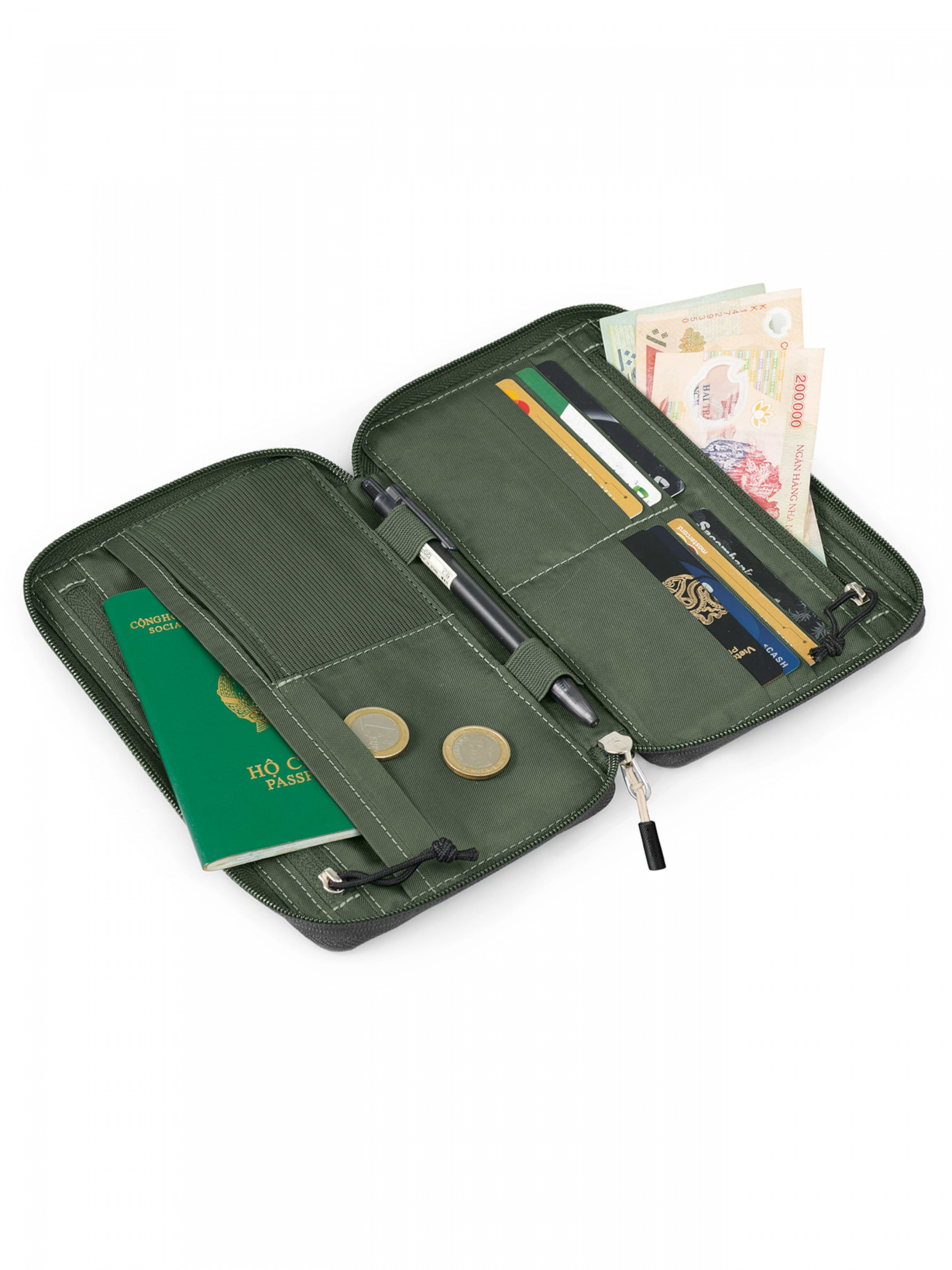 Має 8 комірок для карток, місце під купюри, затискач для ручки, кишеню для монет і спеціальне місце для паспорта з RFID-захистом. Зовні є ще одна кишеня для квитка чи посадкового талону. Це ідеальний гаманець для мандрівок літаком чи щоденного використання.