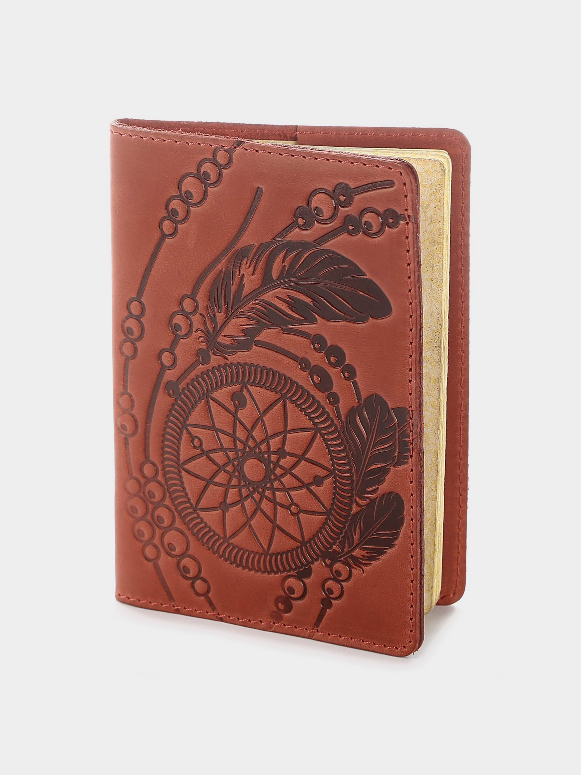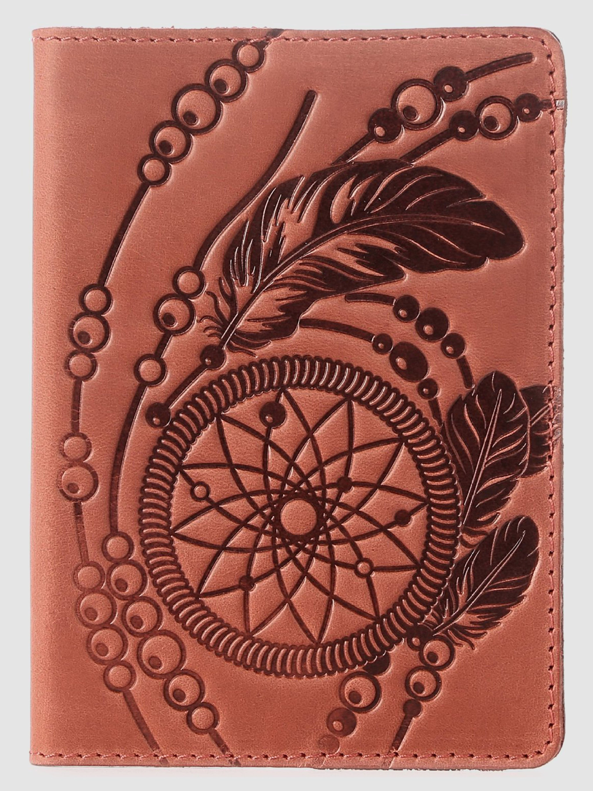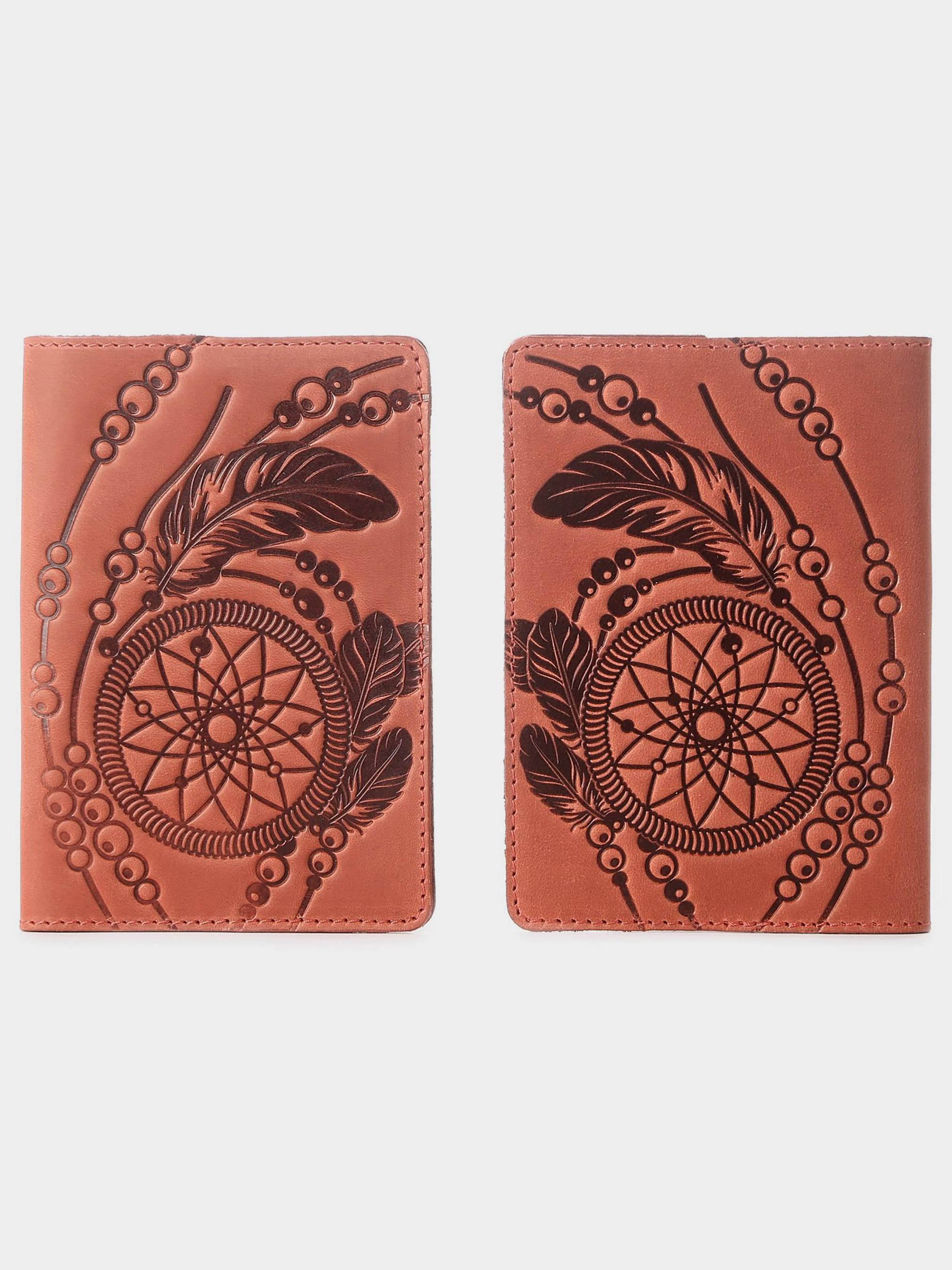 Матеріал: натуральна шкіра високої якості; Колір: червоний; Розміри (ШхВ, см): 9,5х13. Відмінна обкладинка на паспорт з ексклюзивним дизайнерським малюнком на лицевій стороні, яка називається Ловець Снів (dreamcatcher). Це індіанський амулет, який символізує захист сплячої людини від злих духів. Аксесуар виконаний з натуральної, високоякісної вінтажної шкіри. Дана обкладинка на паспорт упакована в красивий, фірмовий текстильний мішечок.
