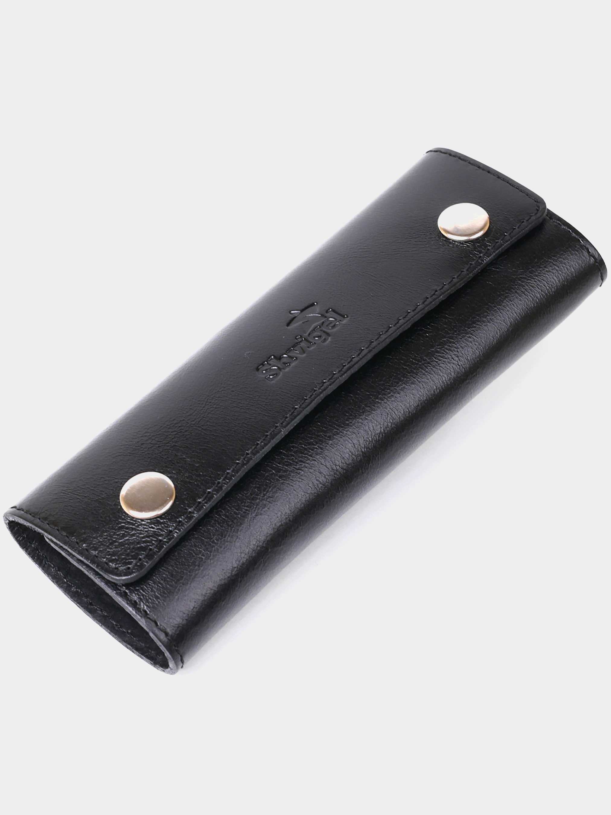 Матеріал: натуральна шкіра. Колір чорний. Розміри (ШхВхГ, см): 14,5 х6х2 см. Країна виробник: Україна. Бренд: Shvigel. Опис: - закривається на кнопки; - усередині 6 карабінів. Добротна ключниця із натуральної шкіри від українського виробника з відмінними характеристиками зносостійкості. Колір виробу - універсальний чорний із легким блиском, фактура - гладка. Усередині розташовано шість невеликих карабінів для ключів. Закривається аксесуар на дві кнопки у кольорі під срібло.