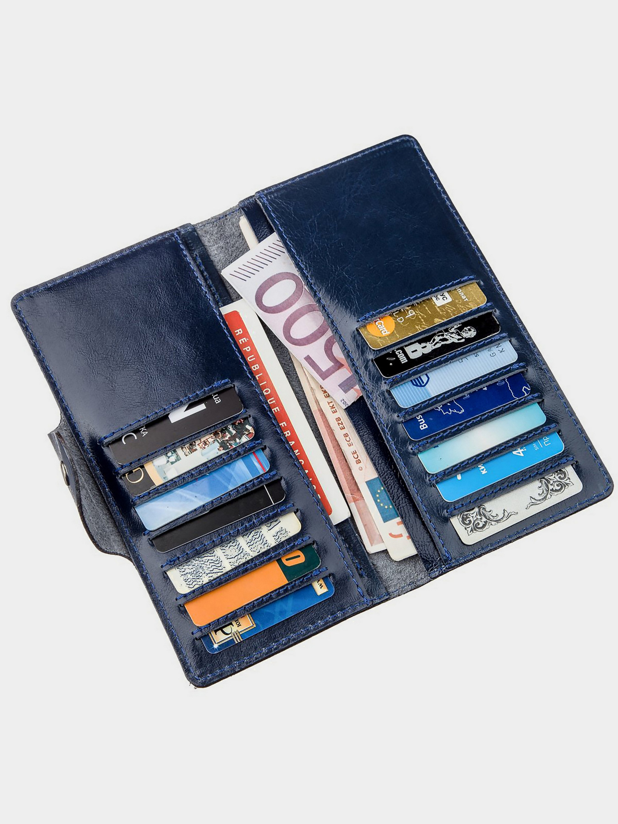 Колір синій; Матеріал: натуральна шкіра високої якості; Розміри (ШхВ, см): 18х8,5х1; Країна виробник: Україна. Всередині: - 4 відділення для купюр; - 14 відділень для пластикових карток. Якісний вертикальний гаманець з натуральної шкіри Алькор. Відмінною особливістю такої шкіри є її дрібні подряпини і блиск як в гладкій шкірі. Аксесуар дуже красиво грає на сонці. Просторі відділення для купюр і слоти для карток будуть тримати ваші кошти в порядку і в цілісності. Аксесуар поміститься в сумку або портфель. Прикрашена модель на лицьовій стороні тисненим логотипом бренду. Закривається виріб на одну з двох кнопок (ближню або дальню) в залежності від його наповненості. Якщо ви перебуваєте в пошуку подарунка - радимо вам дану модель. Вона доступна в різних кольорах.