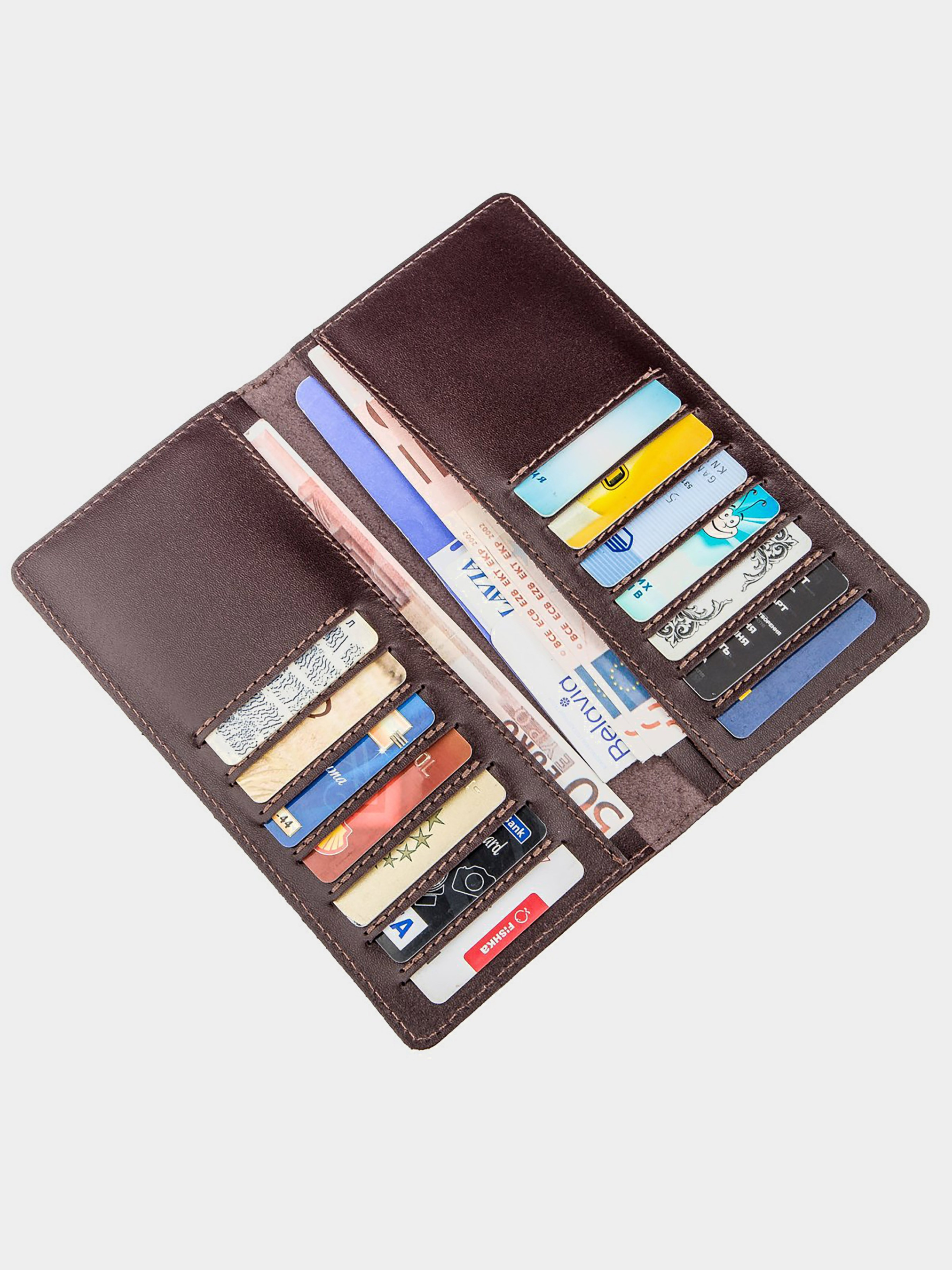 Матеріал: натуральна шкіра; Розміри (ШхВ, см): 18х9х1; Колір коричневий; Країна виробник: Україна. Всередині: - 4 відкритих кишені для купюр; - 14 осередків для карток. Тоненький шкіряний гаманець з натуральної шкіри. На лицьовій стороні тиснений логотип бренду. Гаманець підійде для вас, якщо ви не любите носити з собою монети, і віддаєте перевагу картками. Модель дуже містка за кількістю карт. Всередині - 14 слотів для карток і візиток. Дизайн моделі строгий і в класичному стилі і коричневому кольорі. Витриманий зовнішній вигляд гаманця підкреслить ваш статус. По краях модель прошита рівною рядком. Виріб прекрасно носиться і дуже практичне.