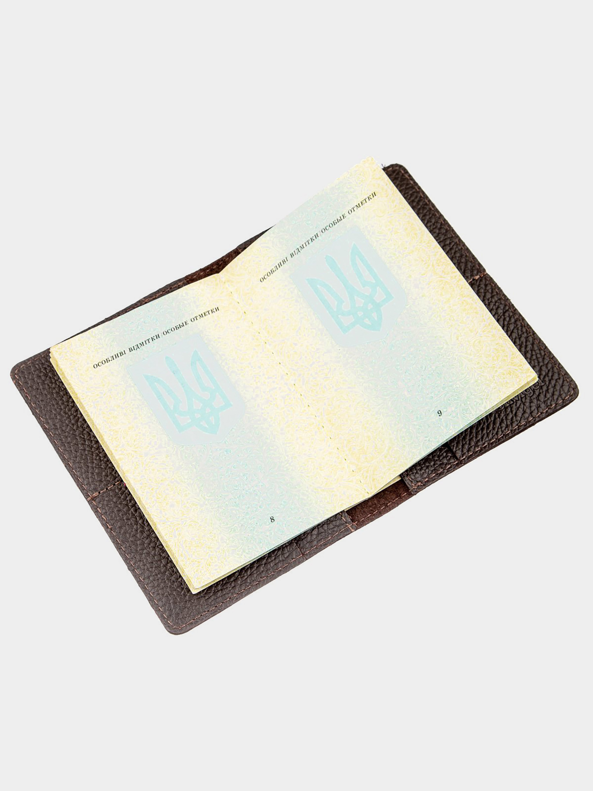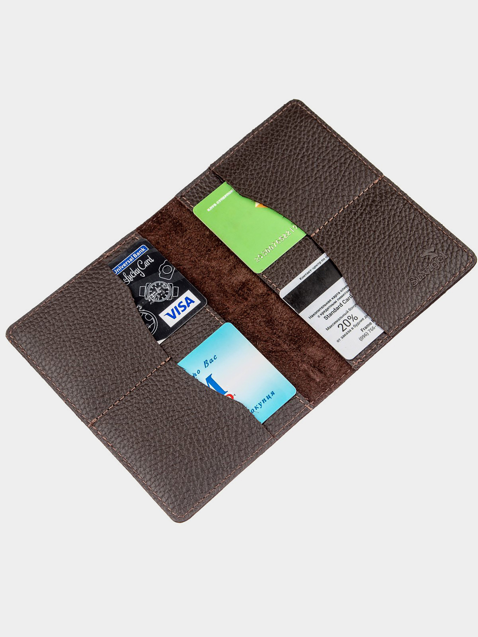 Матеріал: натуральна шкіра; Розміри (ШхВ, см): 10х7; Колір: коричневий; Країна виробник: Україна. Компактна і м'яка обкладинка-гаманець з натуральної шкіри, приємна і м'яка на дотик. Аксесуар виконаний в шкірі флотар коричневого кольору. Усередині є тиснення Shvigel. Доповнена 4 слотами для кредиток або ID карти, або прав. Така обкладинка буде прекрасним подарунком для самого близької людини.