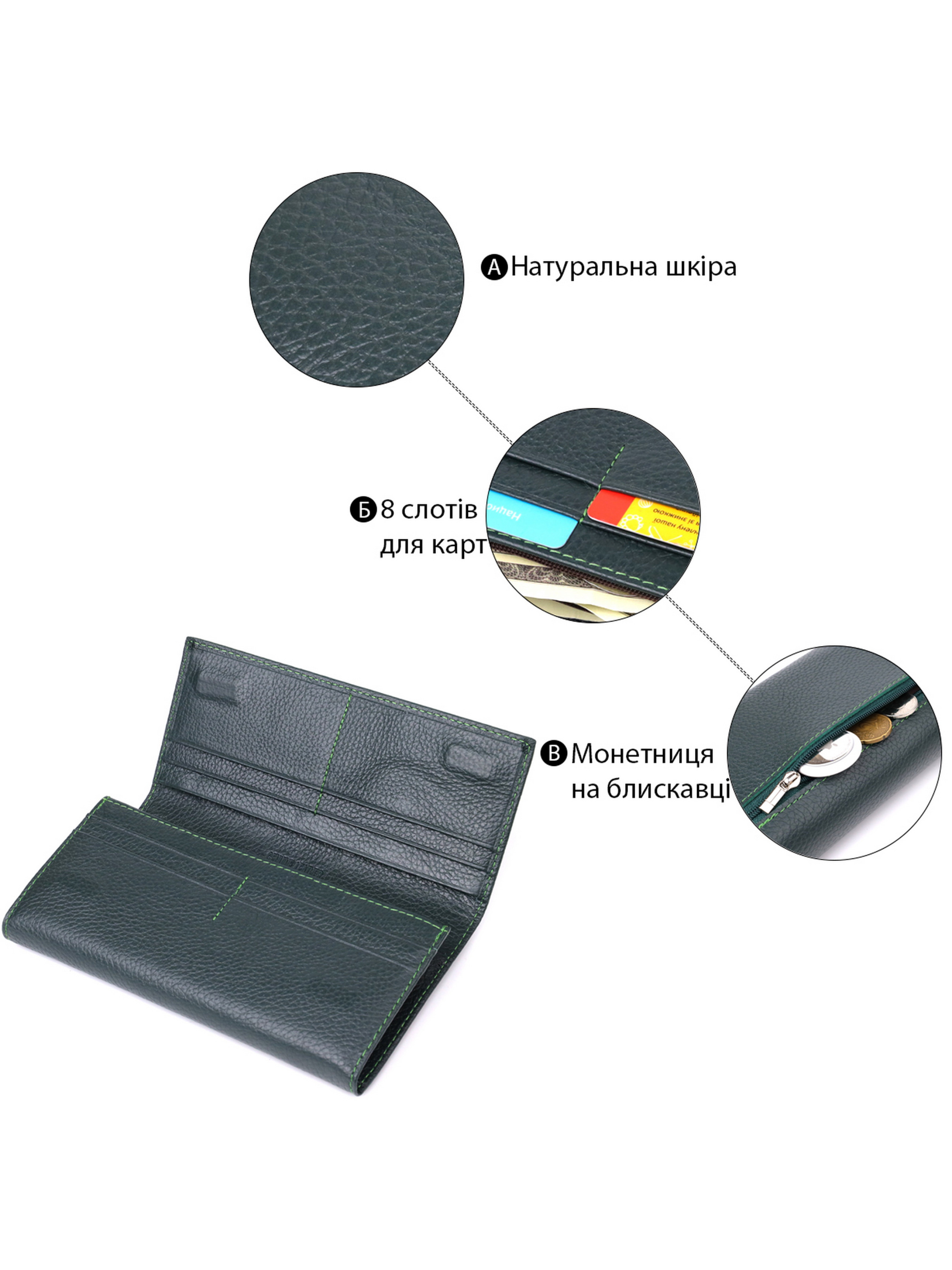 Матеріал: натуральна шкіра; Колір: зелений; Розміри (ШхВхГ)см: 19х9х3см; Країна виробництва: Китай. Особливості: - 3 широкі відділення для купюр; - 2 кишені на блискавці; - 8 осередків для кредиток; - 2 приховані кишені; - кишеню для монет на блискавці, зовні; - закривається клапаном на магніти. Зручний жіночий гаманець, який поєднує практичність, функціональність і елегантний дизайн. Виконаний із натуральної шкіри високої якості, він надійний у повсякденному використанні та довго зберігає акуратний зовнішній вигляд. Усередині — чотири відділення для купюр, дві кишені на блискавці, вісім осередків для карток, а також два приховані відділення. Зовні розташована зручна кишеня для монет. Лаконічний металевий логотип у нижньому кутку підкреслює оригінальність моделі та приналежність до бренду. Гаманець доповнений міцною підкладкою та якісною фурнітурою. Запакований у фірмову білу коробку - відмінний вибір для стильного подарунка чи особистого задоволення.