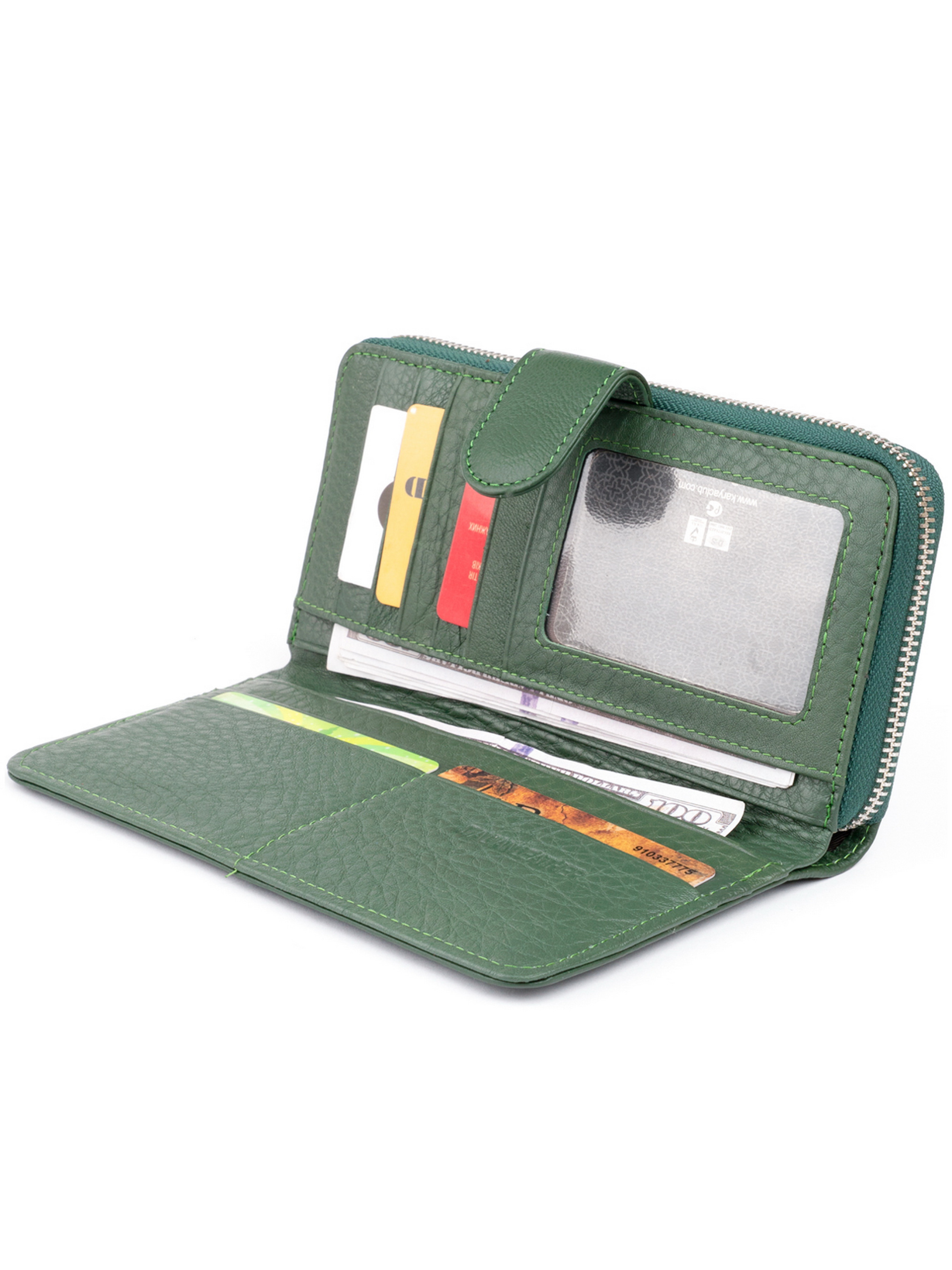 Матеріал: натуральна шкіра; Колір зелений; Розміри (ШхВхГ): 19х9,5х2,5. Країна виробництва: Китай. Особливості: виріб складається з двох частин в першій частині: 2 відділення для купюр; 2 прихованих кишені; кишеня-перегородка на блискавці; 8 слотів для кредиток; закривається на блискавку. в другій автономній частині: 3 відкритих кишені; 10 слотів для кредиток (один з них під плівкою); закривається на хлястик з магнітом; кишеня на блискавці на тильній стороні. Місткий гаманець для чоловіків і жінок благородного зеленого кольору. Аксесуар в такому кольорі притягує гроші. Виріб виглядає дуже стильно і не дивлячись на свій здавалося б громіздкий розмір зручно лежить в руці. Аксесуар доповнено достатньою кількістю осередків для кредиток. Гаманець здатний замінити вам кредитницю. Таким чином, купуючи один аксесуар ви отримуєте по функціональності навіть 2 аксесуара: гаманець і візитницю. Рекомендуємо вам дану модель, якщо ви перебуваєте в пошуку подарунка.