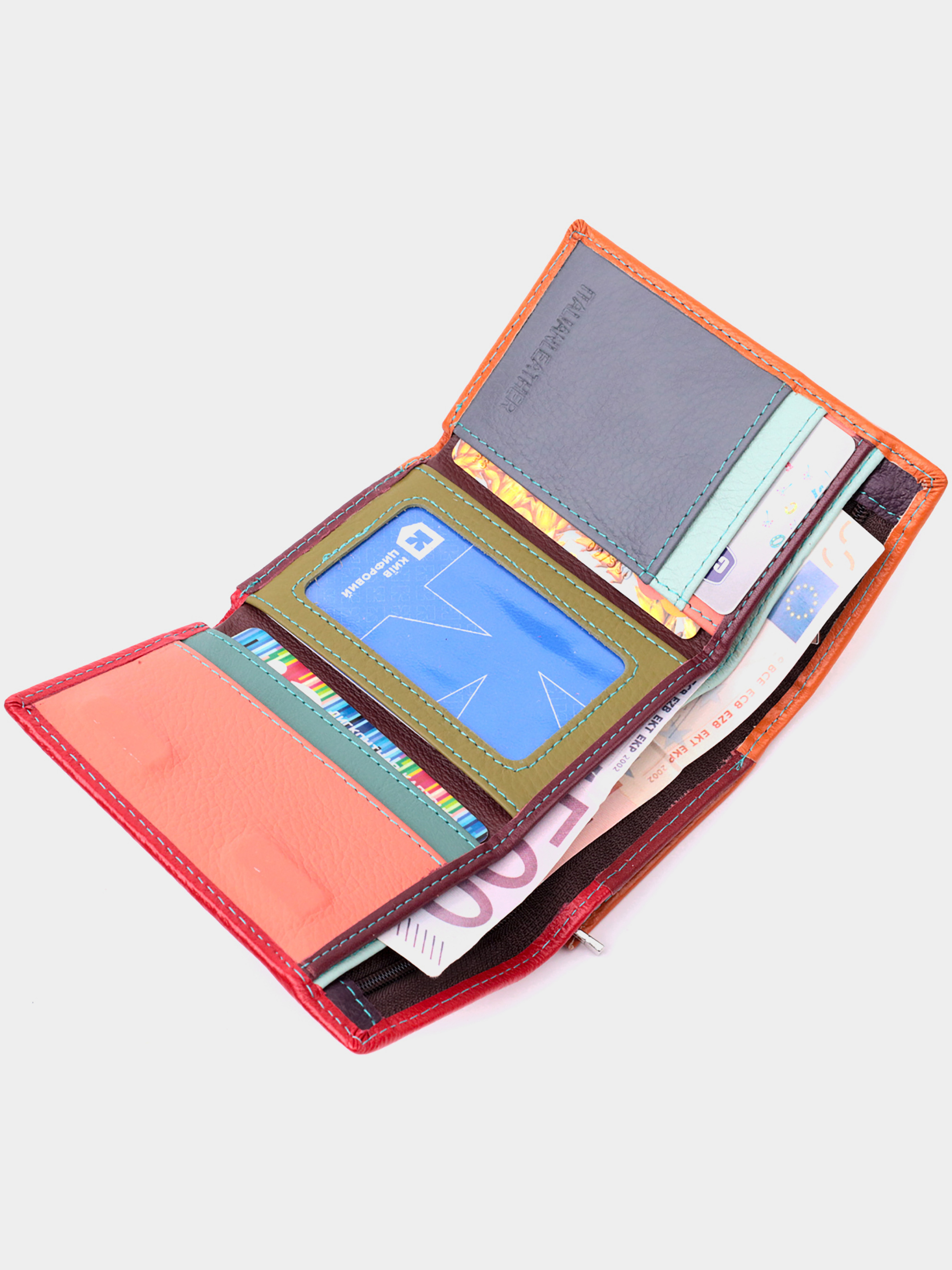 Матеріал: натуральна шкіра; Колір: кольоровий; Розміри (ШхВхГ)см: 12,2х8х2см; Країна виробництва: Китай. Особливості: - 2 основні відділення для купюр; - 1 відділення на блискавці на всю довжину; - 5 слотів для кредиток; - 1 кишенька під плівкою; - 1 зовнішня кишеня на блискавці, з перегородкою; - закривається на магніти. Яскраве жіноче портмоне в три складання з натуральної шкіри найвищої якості. Перше, що впадає в око це колірне рішення, замість однотонного аксесуара ми маємо різнокольоровий, який містить два основні зовнішні кольори і кілька додаткових всередині. Шкіряне портмоне дуже практичне і служить досить довго. Аксесуар складається з двох містких кишень для купюр, кишені на блискавці через всю довжину, п'яти осередків для карт, прозорого віконця для пропуску та зовнішньої кишені на блискавці з перегородкою, що чудово прослужить для монет. Портмоне доповнено надійною фурнітурою. Укомплектований гаманець у фірмову картонну коробку білого кольору.