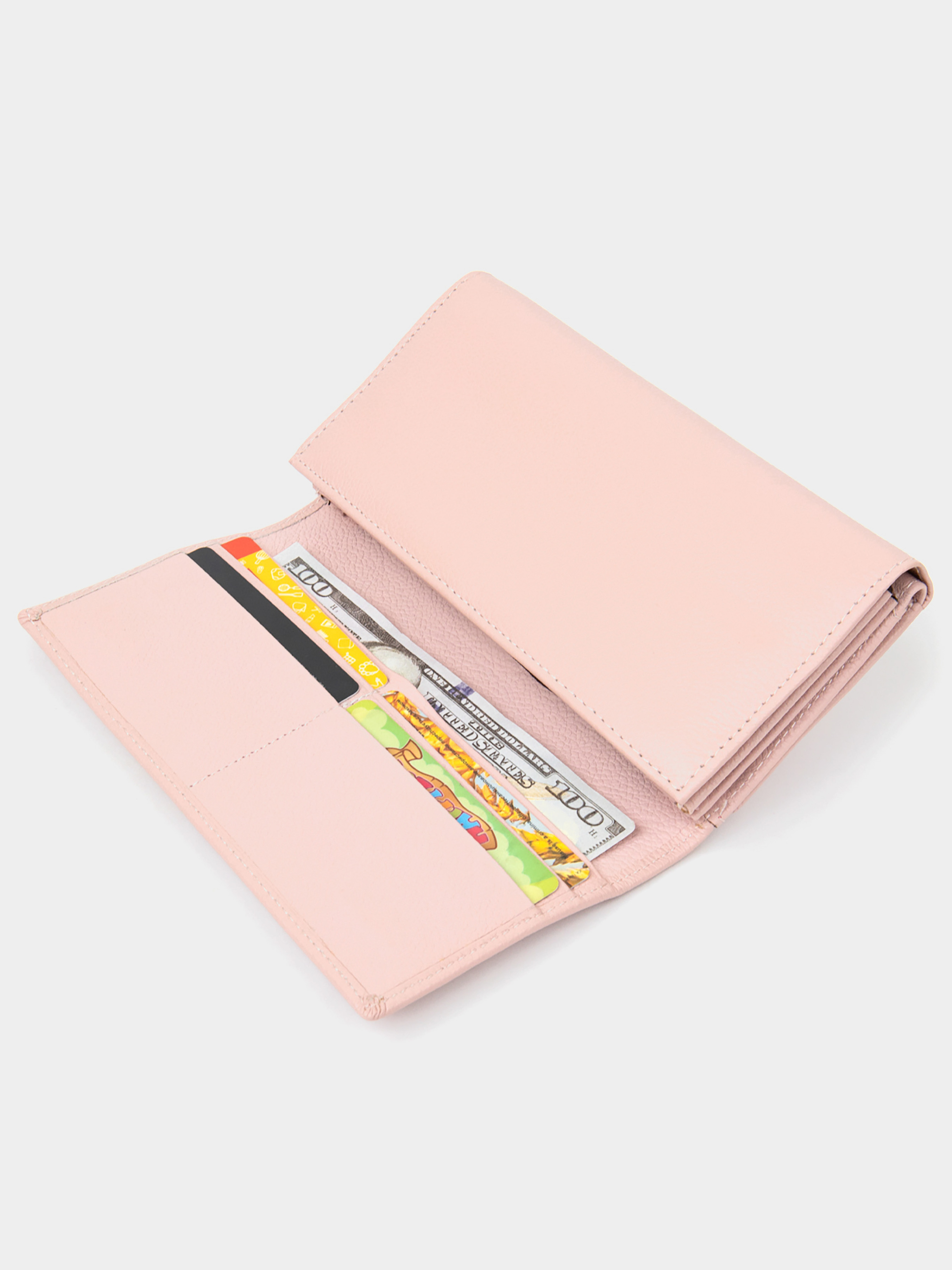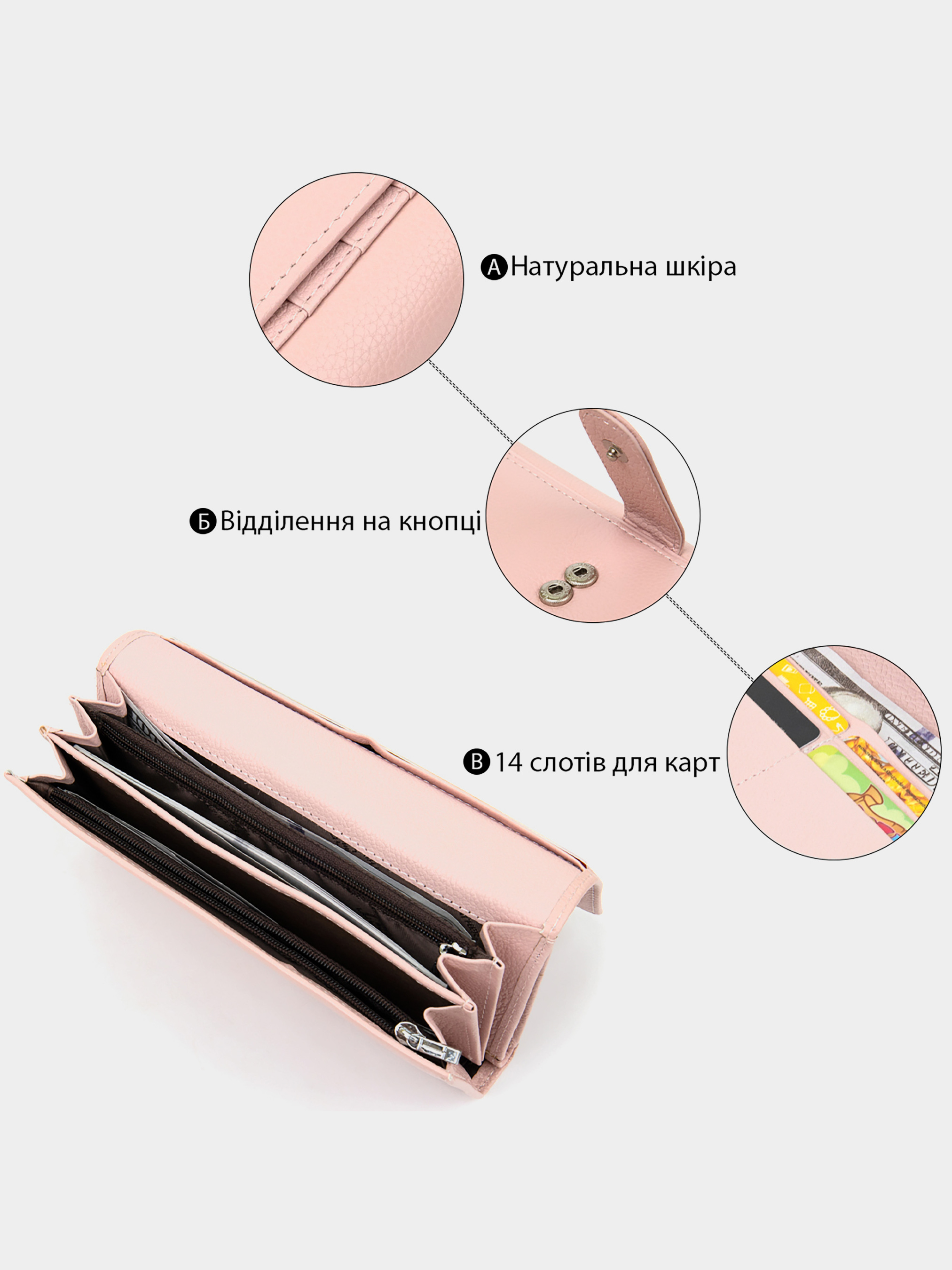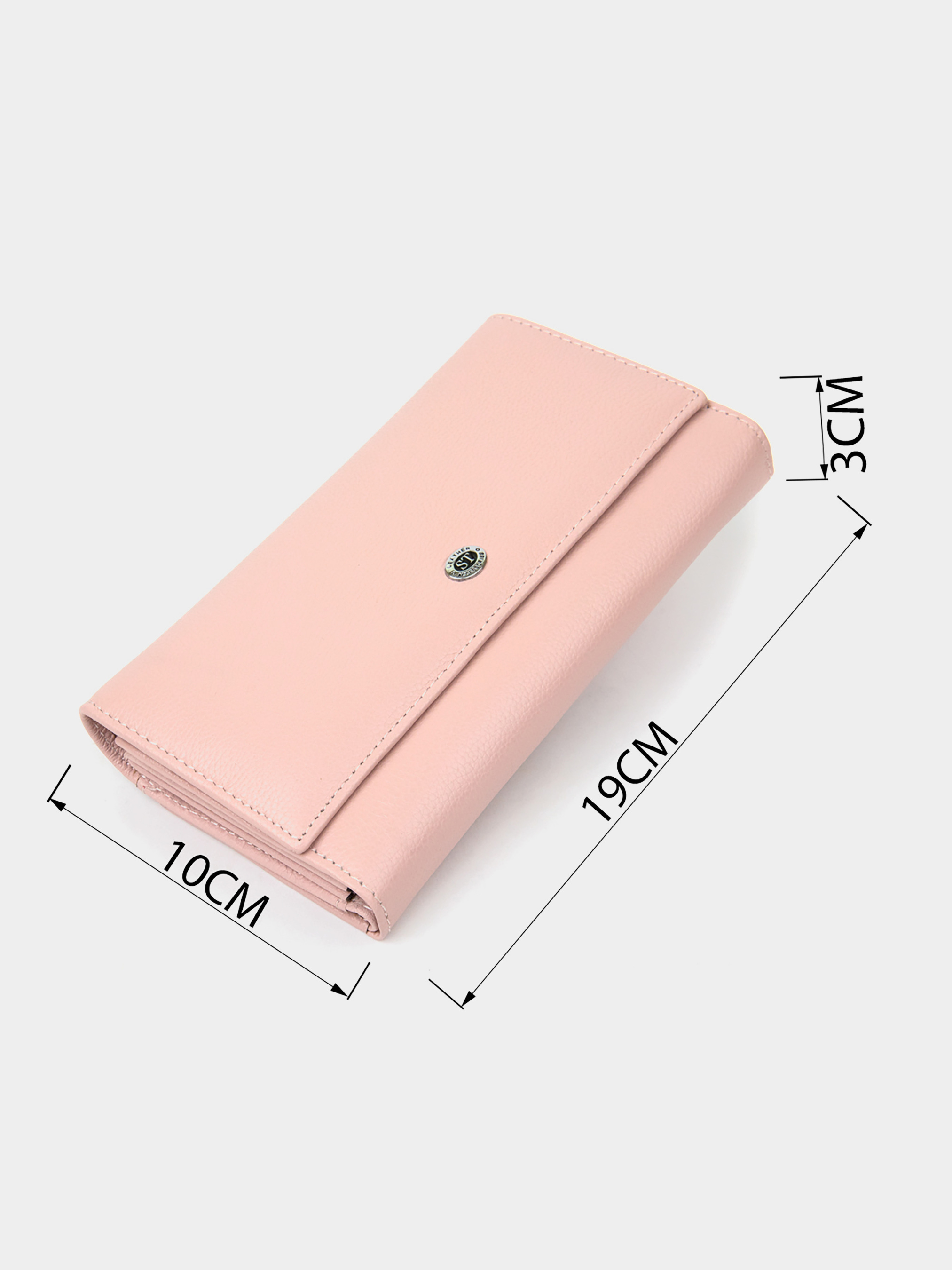 Матеріал: натуральна шкіра. Колір рожевий. Розміри (ШхВхГ, см): 19х10х3 см. Країна виробник: Китай. Бренд: ST Leather. Опис: - основне відділення закривається на два магніти; - всередині розташовано чотири великих відділення для купюр по всій довжині; - одне відділення на всю довжину для інших цінних речей; - 2 відділення на блискавках; - 4 кишень для карток; - на зовнішній стороні розміщені слоти для карт 10 шт; - відділення на всю довжину гаманця; - прозора кишенька; - слоти закриваються на хлястик з кнопкою, яка регулює обсяг його наповнення; Чудовий гаманець в ніжно-рожевому кольорі з високоякісної зернистої шкіри. Має матове покриття, що дуже популярно в наші дні. Усередині Вас порадує кількість містких відділень різного плану. Також слід зазначити спеціальне відділення для карт на зовнішній стороні, яке закривається на кнопку. Упаковано виріб в білу тверду коробку з фірмовим логотипом.