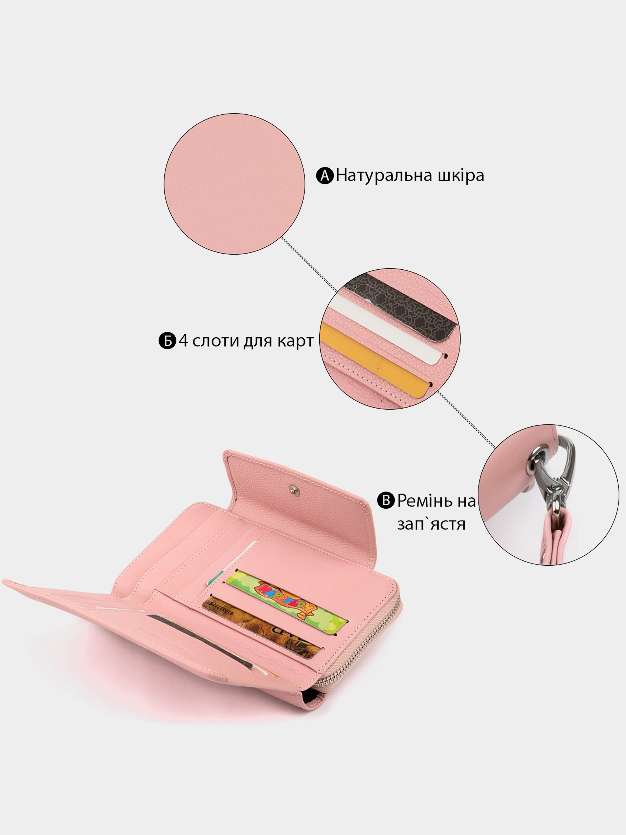 Матеріал: натуральна шкіра; Колір рожевий; Розміри (ШхВхГ): 19х9,5х2,5. Країна виробництва: Китай. Особливості: -складається з двох частин: в першій: -2 основних відділення для купюр; -2 прихованих відкритих кишені; -4 слота для кредиток; -кишеня-перегородка на блискавці; -2 маленьких відкритих кишеньки над слотами для кредиток; -знімний ремінець-петелька; -закривається на блискавку. у другій частині: -2 глибоких кишені; -4 слота ширше для посвідчення; -6 прорізних осередків для карток; -2 відкритих кишені; -закривається на кнопку. Практичний і в той же час дуже універсальний гаманець в ніжному рожевому кольорі. Ми впевнені, що змінив свій аксесуар підуть приємні зміни у вашому житті. Гаманець в рожевому кольорі - спеціально для шанувальників пастельних тонів. З таким гаманцем у вашому образі буде присутня легкість і жіночність. Колір гаманця не може не радувати око. Виробництво гаманця - фабричний Китай високої якості. Всередині - достатня кількість кишеньок і відділень для монет, купюр, документів і інших особистих речей. Ви зможете їх зручно розмістити адже гаманець оптимального розміру. Аксесуар можна носити в улюбленій сумочці або в руках.