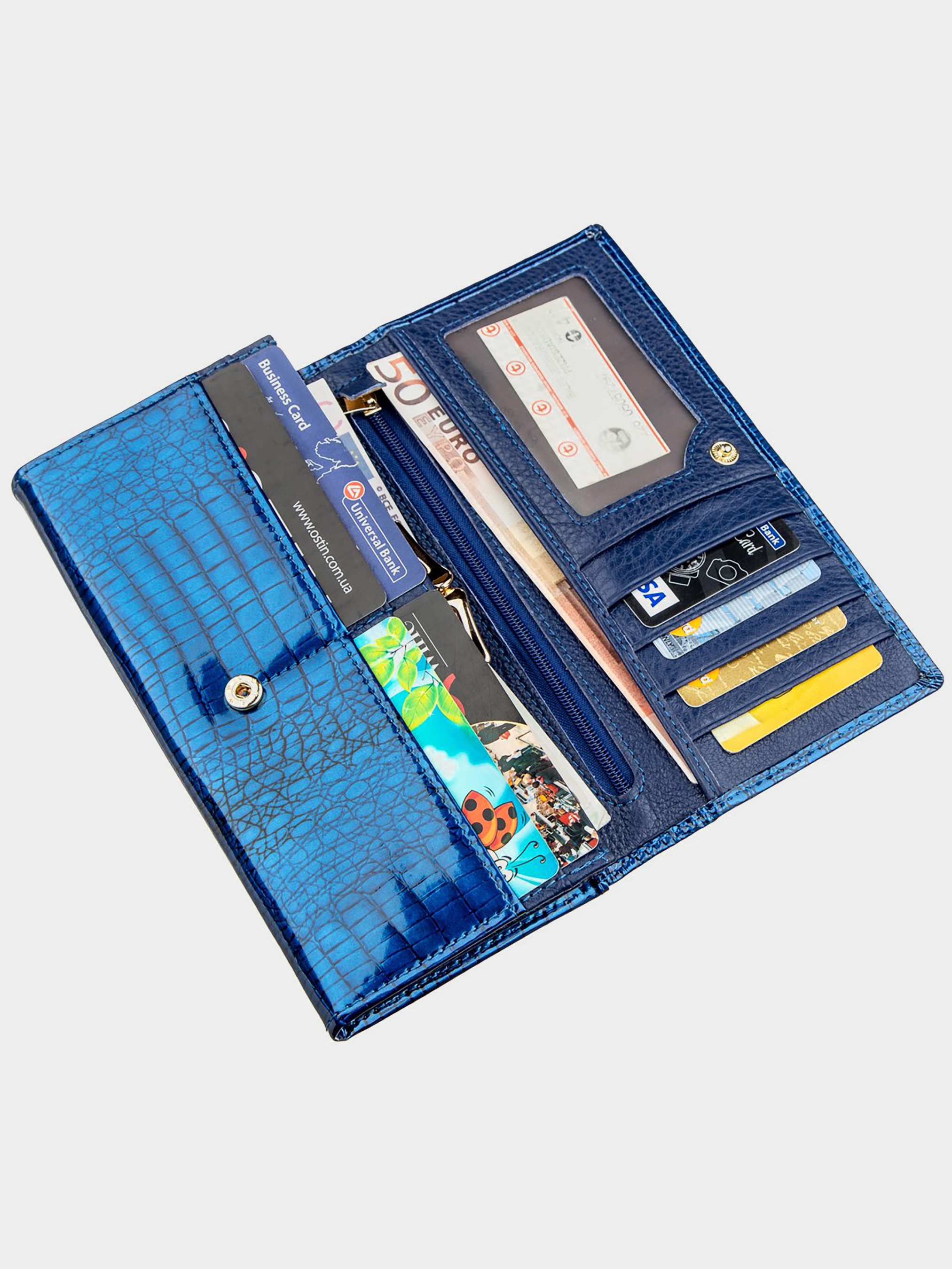 Матеріал: натуральна шкіра; Розміри (ШхВ, см): 18х9; Колір: синій; Країна виробник: Китай; Країна походження ТМ: Україна. Опис: - жіночий гаманець з натуральної шкіри на кнопці; - всередині розташовано три великих відділення для купюр по всій довжині; - одне велике відділення на блискавці по всій довжині; - подвійне відділення для монет на клямці; - потаємне відділення по всій довжині; - дві кишеньки для сім-карт; - прозоре відділення для фото; - 8 відділень для карт; - зовнішнє потаємне відділення на всю довжину; Вишуканий жіночий гаманець в класичному стилі для жінок будь-якого віку. Зроблено аксесуар з натуральної першосортної шкіри, яка м'яка і гладка на дотик, а також покрита лаком. Тому виглядає дуже красиво і шикарно. Колір гаманця насичений синій з блакитним відтінком. Наповнення гаманця теж можна сказати - класичне. Це відділення для купюр і банкнот, для необ'ємних документів, відділення для монет та інших дрібниць, а також кишені для візитних і кредитних карт. Даний аксесуар неодмінно стане відмінним подарунком не тільки самій собі, а й для іншої близької людини, особливо якщо є привід. Упаковка представлена у вигляді щільної фірмової картонної коробки.
