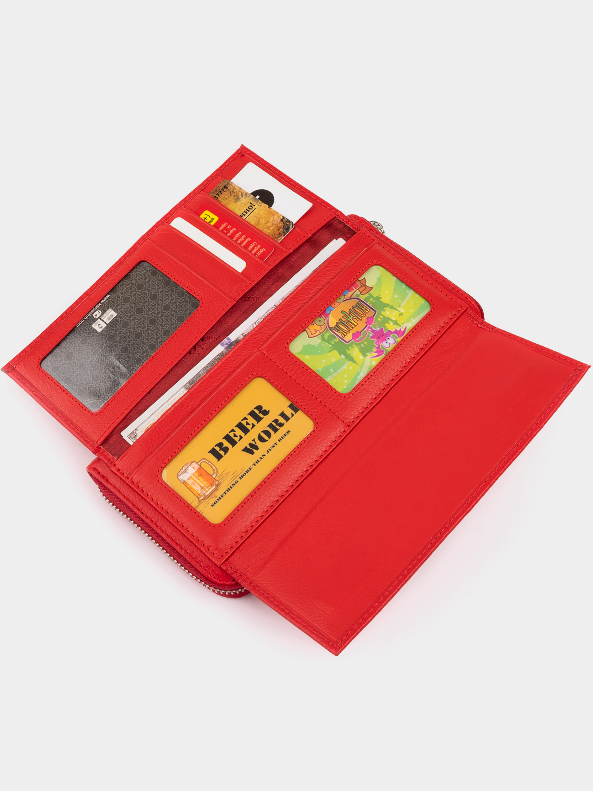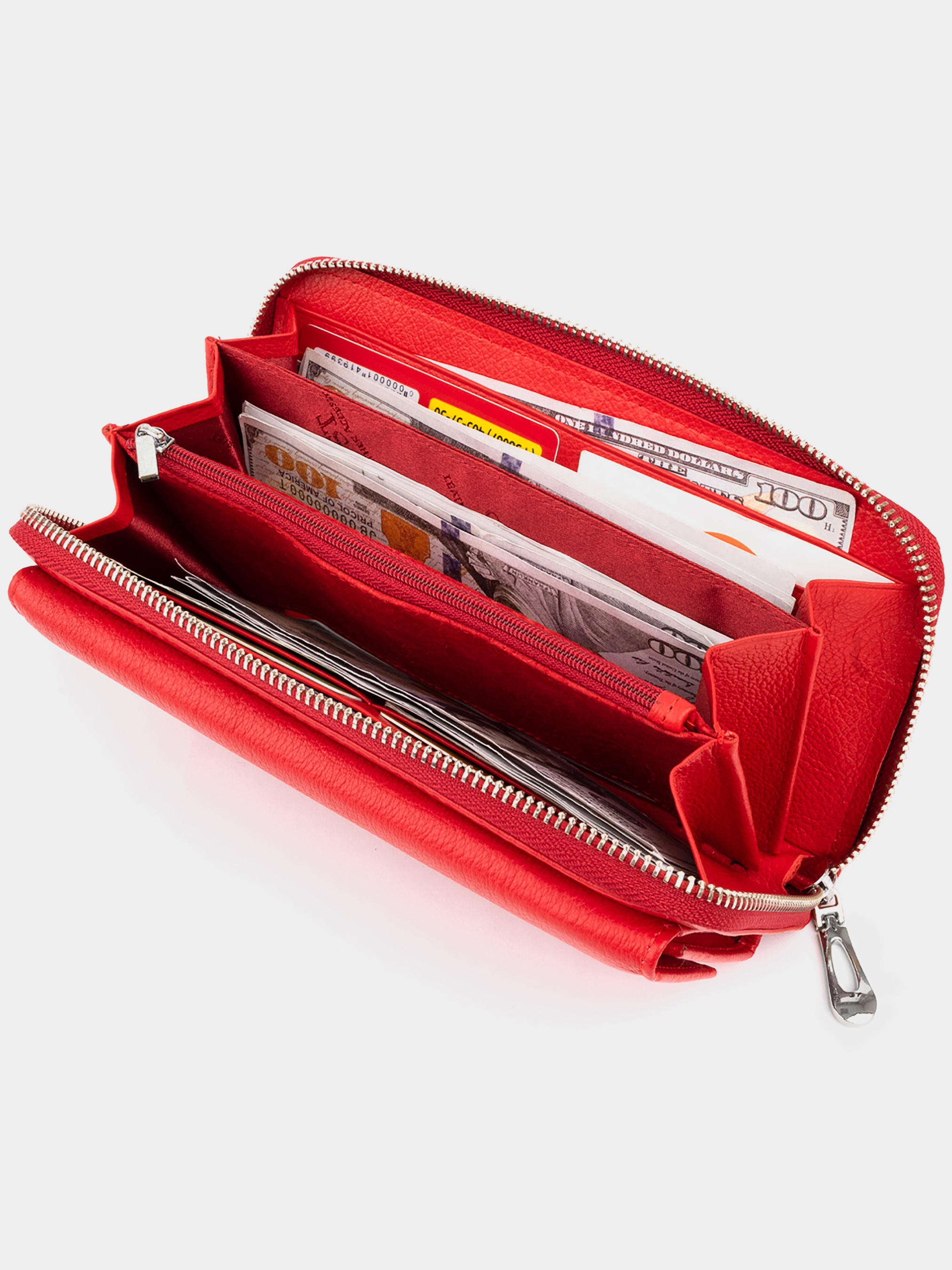 Матеріал: натуральна шкіра; Колір червоний; Розміри (ШхВхГ): 20х10х2. Країна виробництва: Китай. Особливості: -3 великих відділення для купюр; -3 приховані кишені (один посередині); -відділення на блискавці; -8 слотів під пластикові картки; -закривається на блискавку; -додаткова ремінець-петелька на зап'ястя; в другій автономній накладній частині: -3 кишеньки під плівкою; -4 слота під кредитки; -2 потайні кишені; -закривається на магніт. Дуже місткий гаманець-клатч яскравого червоного кольору з натуральної шкіри. Виріб виконаний з натуральної шкіри. Шкіра дуже м'яка і еластична. Наявність різноманітних відділень дає вам можливість розкласти всі ваші речі в повному порядку. Гаманець легко зможе замінити вам клатч і його буде зручно носити на зап'ясті. Модель упакована у фірмову коробку і ідеально підійде для подарунка близькій людині.