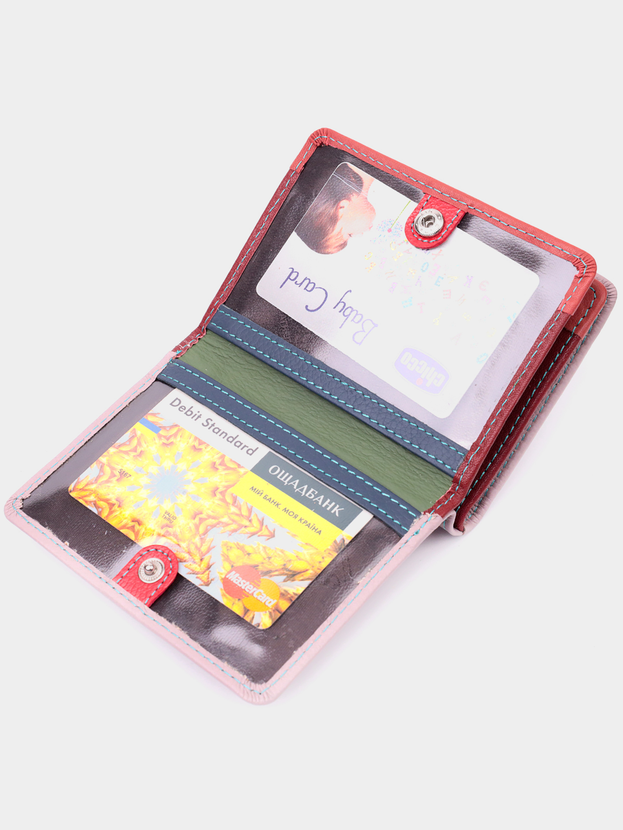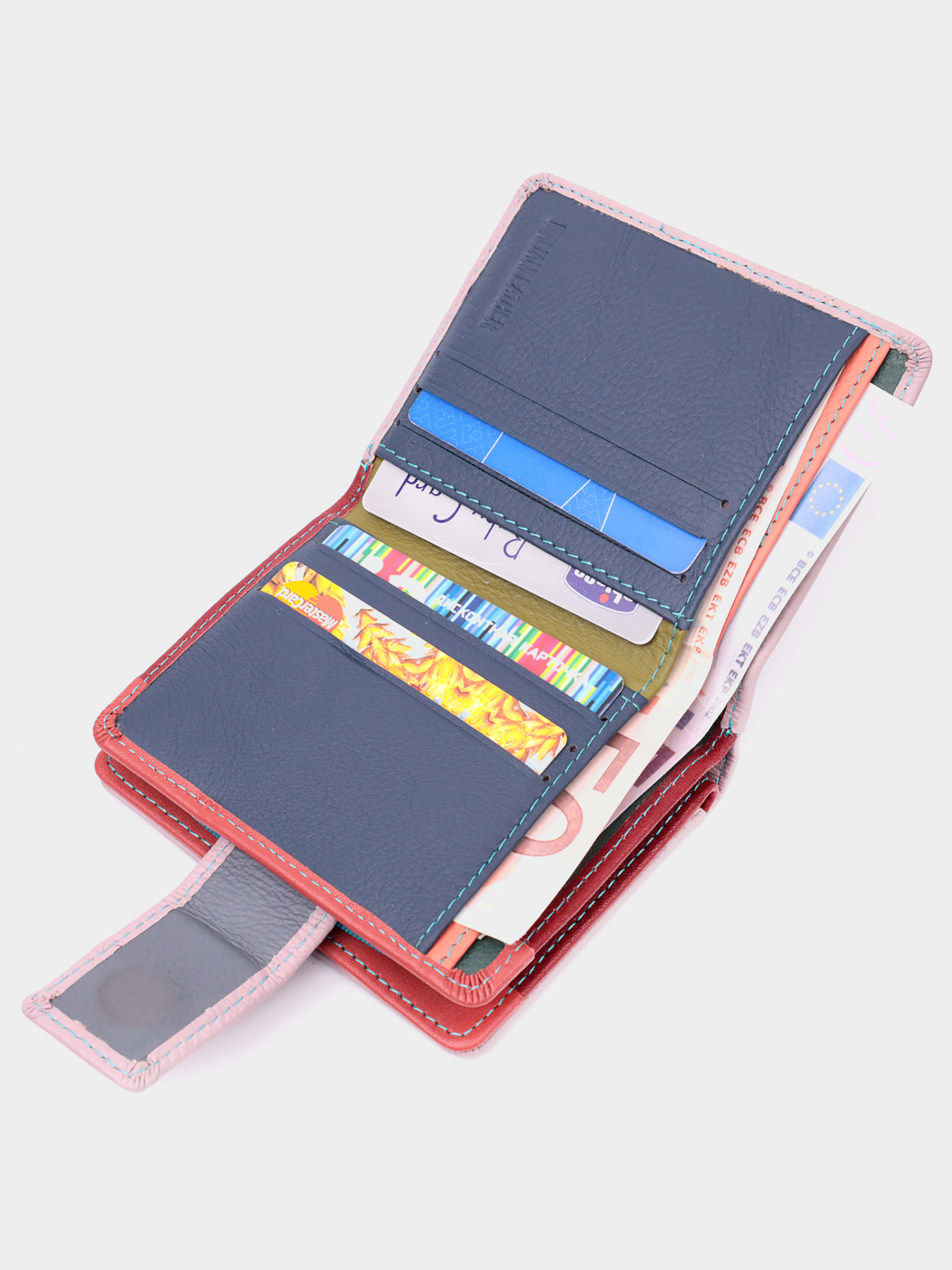 Матеріал: натуральна шкіра; Колір: рожевий; Розміри (ШхВхГ)см: 9,5х11,5х2,5см; Країна виробництва: Китай. Особливості: - 2 основні відділення для купюр; - 1 відділення на блискавці з перегородкою всередині для монет; - 2 приховані кишені; - 6 слотів для кредиток; - 2 кишеньки під плівкою; - закривається хлястиком на магніт. Відмінне портмоне в два складання компактного розміру з натуральної шкіри найвищої якості. Гаманець бежево-рожевого кольору зовні та різнобарвний усередині, що дуже стильно та сучасно. Шкіряне портмоне дуже практичне і служить досить довго. Аксесуар складається з двох містких кишень для купюр, кишені на блискавці для монет, шести осередків для карт, двох прозорих віконець для перепусток або фотографій та двох прихованих кишень. Портмоне доповнено надійною фурнітурою і прошито по краю рівним рядком бірюзового кольору. Укомплектований гаманець у фірмову картонну коробку білого кольору. Виріб стане ідеальним подарунком для дівчини будь-якого віку.