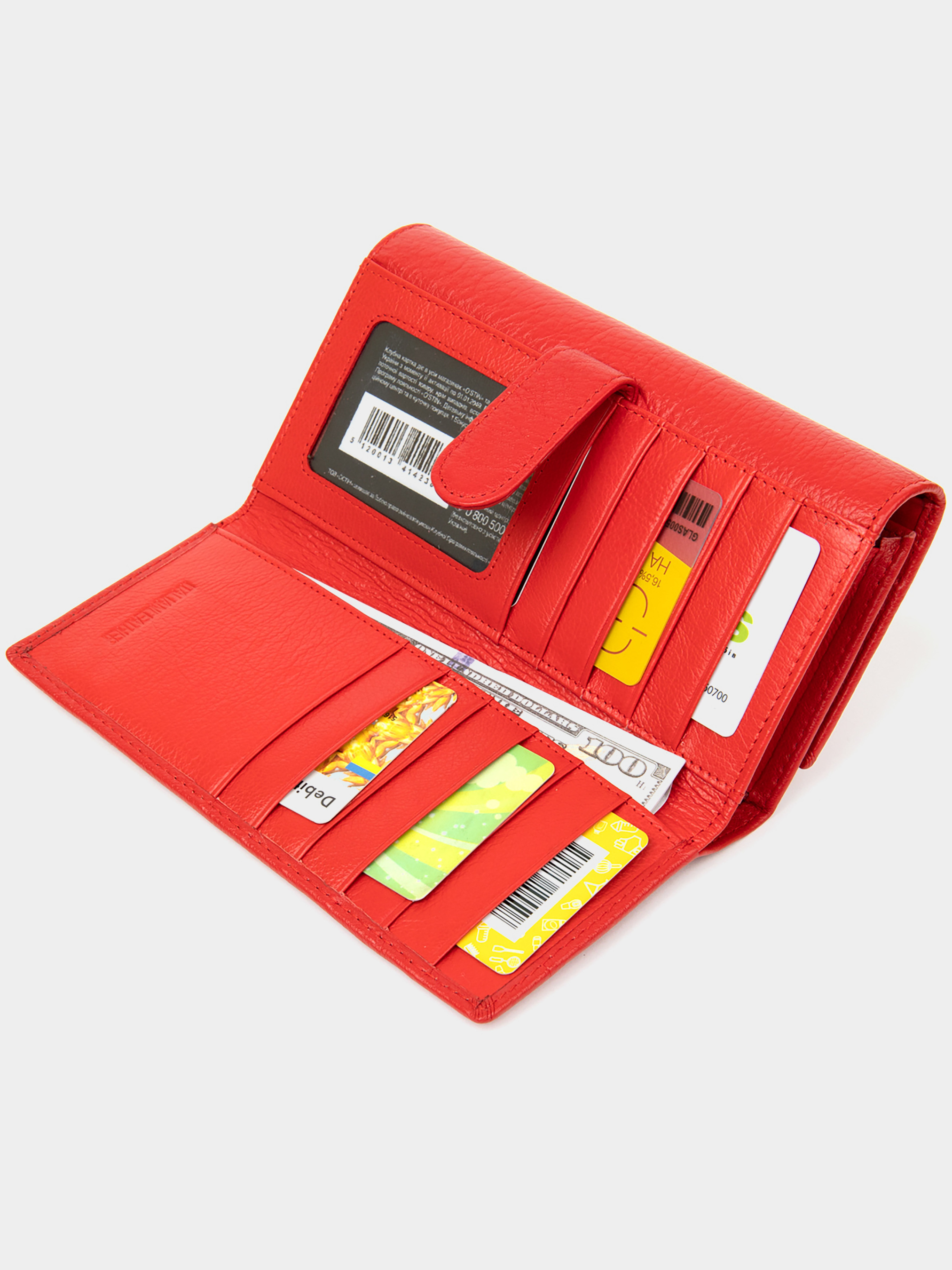 Матеріал: натуральна шкіра. Колір червоний. Розміри (ШхВхГ, см): 19х10х3 см. Країна виробник: Китай. Бренд: ST Leather. Опис: - основне відділення закривається на два магніти; - всередині розташовано чотири великих відділення для купюр по всій довжині; - одне відділення на всю довжину для інших цінних речей; - 2 відділення на блискавках; - 4 кишень для карток; - на зовнішній стороні розміщені слоти для карт 10 шт; - відділення на всю довжину гаманця; - прозора кишенька; - слоти закриваються на хлястик з кнопкою, яка регулює обсяг його наповнення; Гарний гаманець для яскравих жінок в насиченому червоному кольорі. Має матову зернисту фактуру, яка дуже приємна на дотик, що важливо при повсякденному використанні. Всередині є всі необхідні відділення та кишені для Вашої зручності. Якість виконання виробу на дуже високому рівні. Дана модель стане відмінним подарунком для коханої жінки, подруги або мами.