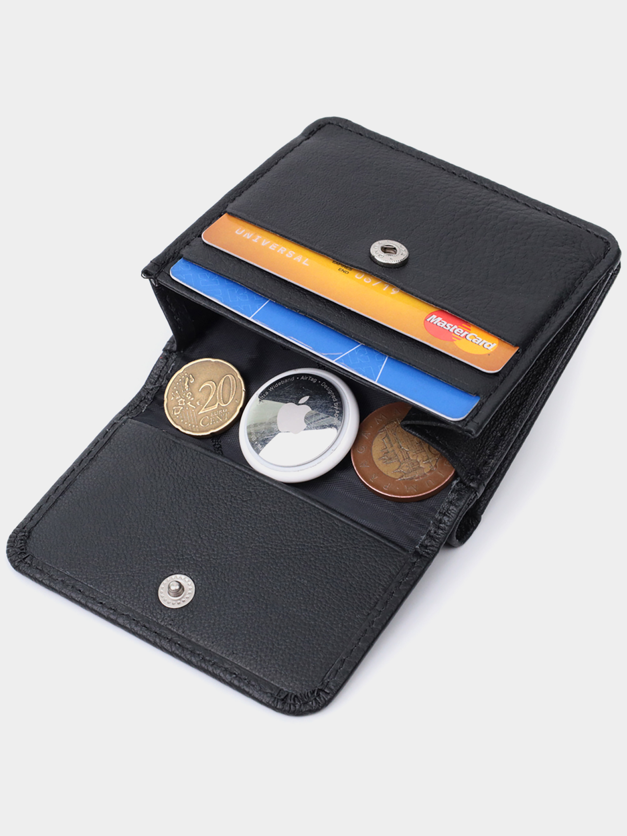 Матеріал: натуральна шкіра; Колір: чорний; Розміри (ШхВхГ): 9,5х9,5х1,5; Країна виробництва: Китай. Опис: - два відділення для купюр; - три слоти для пластикових карток; - одна потаємна кишеня, зовні; - кишеня для монет зовні; - закривається в два складання на магніт. Компактний гаманець для жінок із високоякісної натуральної шкіри флотар. Шкіра флотар є одним з найякісніших і міцніших матеріалів, вона має матову поверхню і благородну зернистість. Гаманець має все необхідне, щоб стати Вам незамінним аксесуаром у повсякденному житті. Завдяки своєму компактному розміру аксесуар легко поміщається в найменшу сумочку. Ви легко помістите в нього паперові купюри, монети, документи, картки. На лицьовій стороні посередині розташований металевий логотип виробника, що є запорукою якості виробу. Запакований аксесуар у білу щільну картонну коробку з фірмовим логотипом.