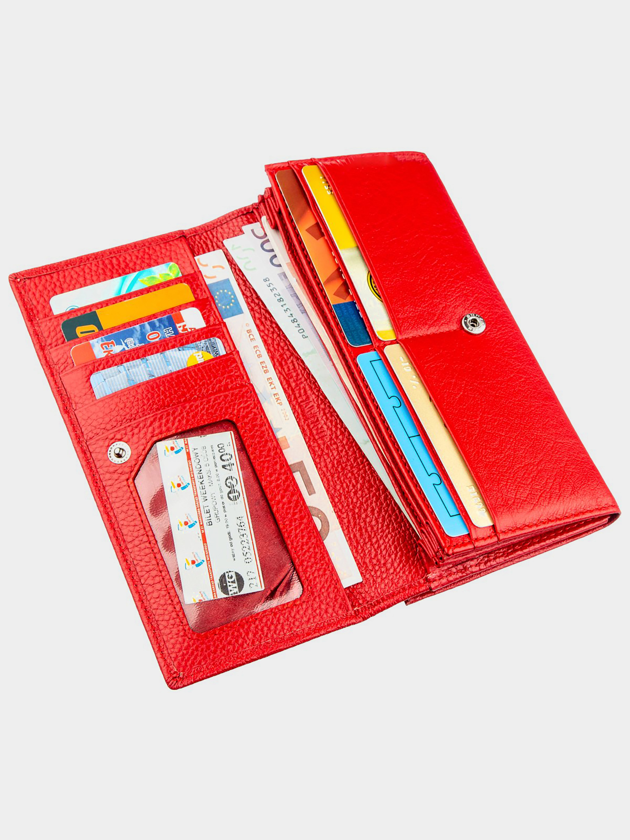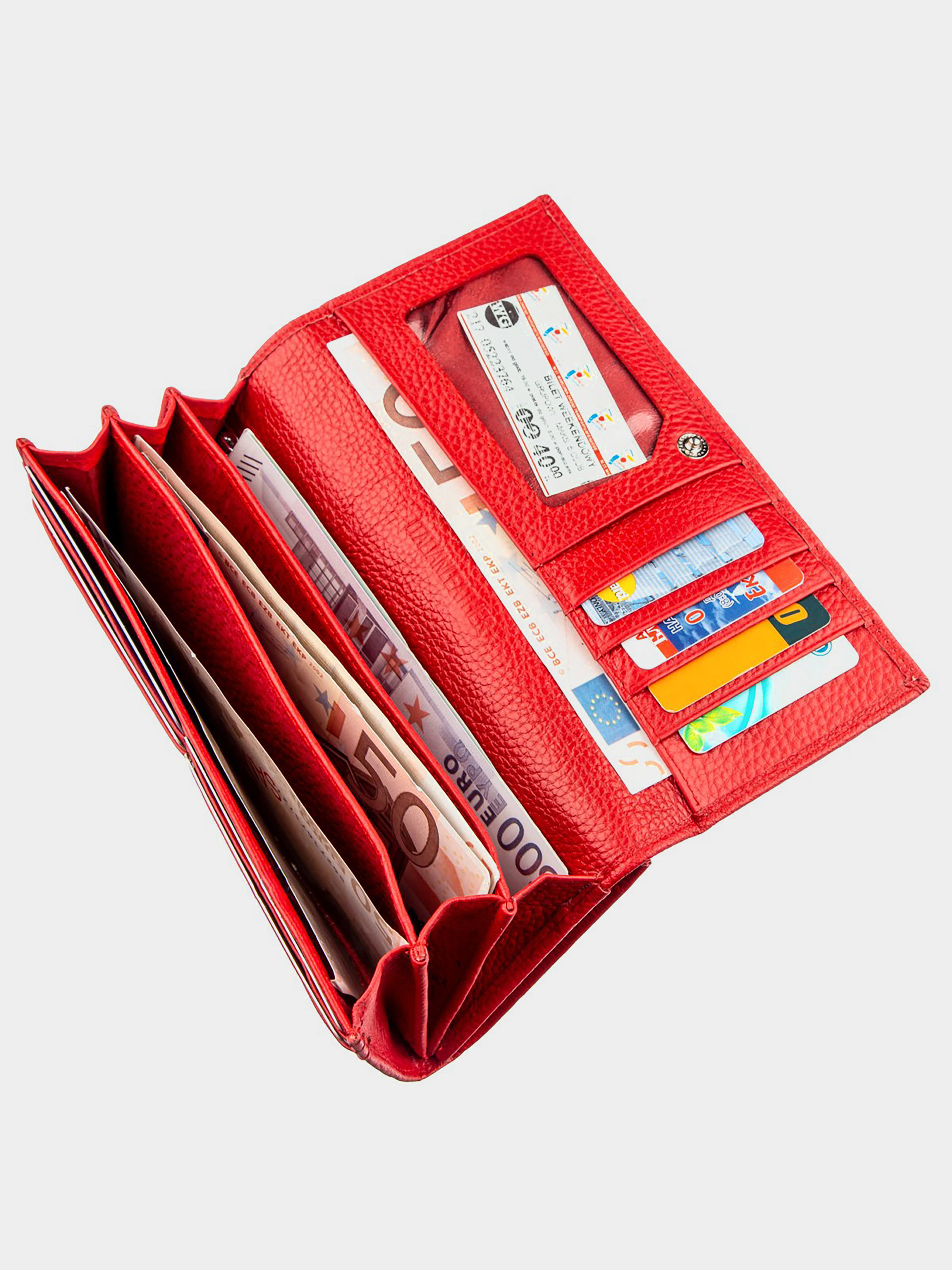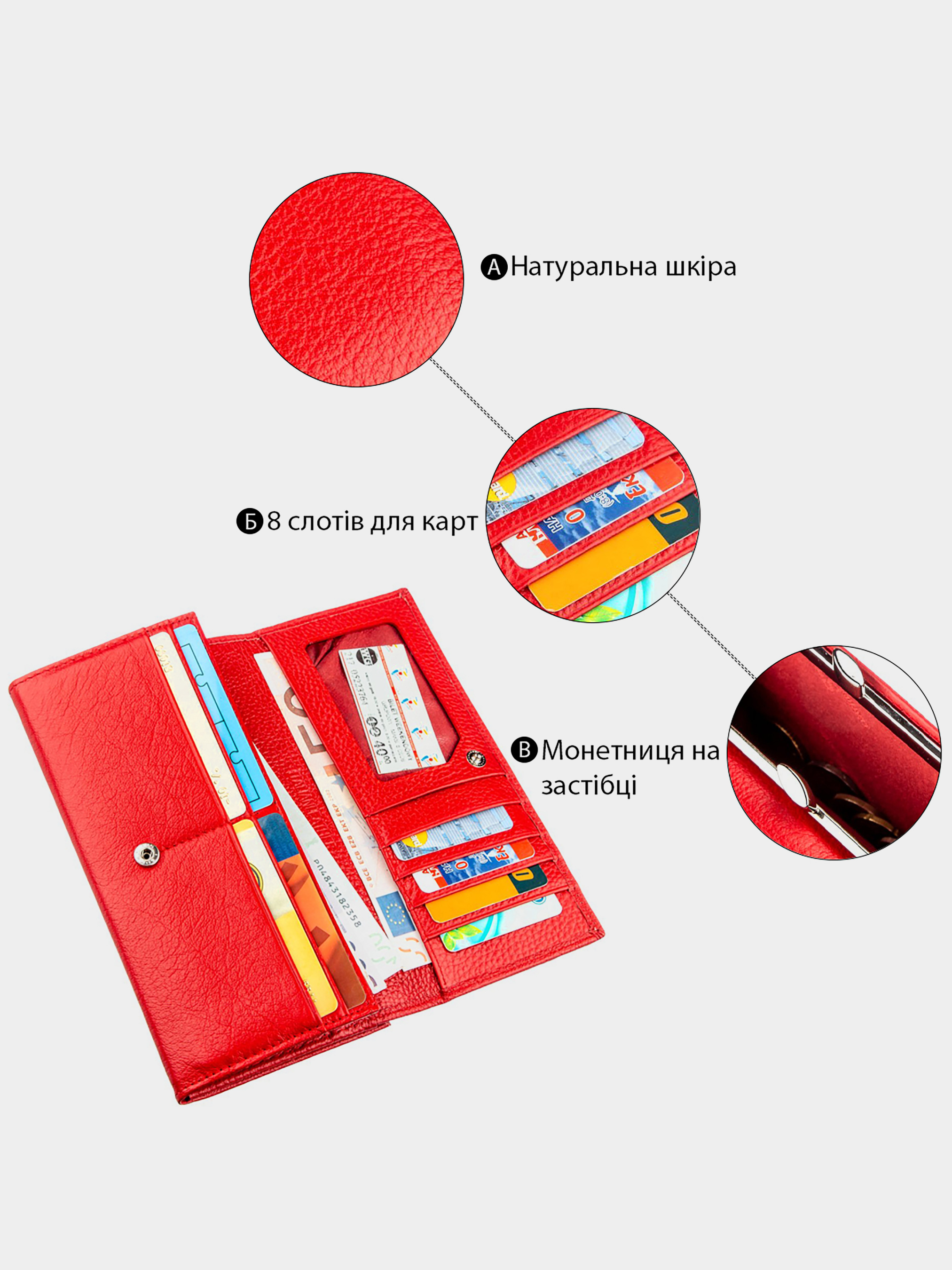 Матеріал: натуральна шкіра; Розміри (ШхВ, см): 9х18,5; Колір: червоний; Країна виробник: Китай; Країна походження ТМ: Україна. Опис: - жіночий гаманець з натуральної шкіри на кнопці; - всередині розташовано три великих відділення для купюр по всій довжині; - одне велике відділення на блискавці по всій довжині; - відділення для монет на кнопці; - потаємне відділення на всю довжину; - прозоре відділення для фото; - 8 відділень для карт. Ефектний жіночий гаманець для яскравих і впевнених у собі жінок. Має гарний і стильний дизайн для сучасних дам. Матеріал виготовлення - відмінна натуральна шкіра з високими показниками якості та зносостійкості. Особливістю гаманця звичайно є його експресивний червоний колір. Усередині вироби розташовані місткі відділення для купюр і банкнот, для необ'ємних документів, для різних кредитних і візитних карток. Монетниця знаходиться на тильній стороні і закривається на масивну металеву заклепку в золотому кольорі. Упаковано виріб в щільну картонну коробку білого кольору з логотипом виробника.