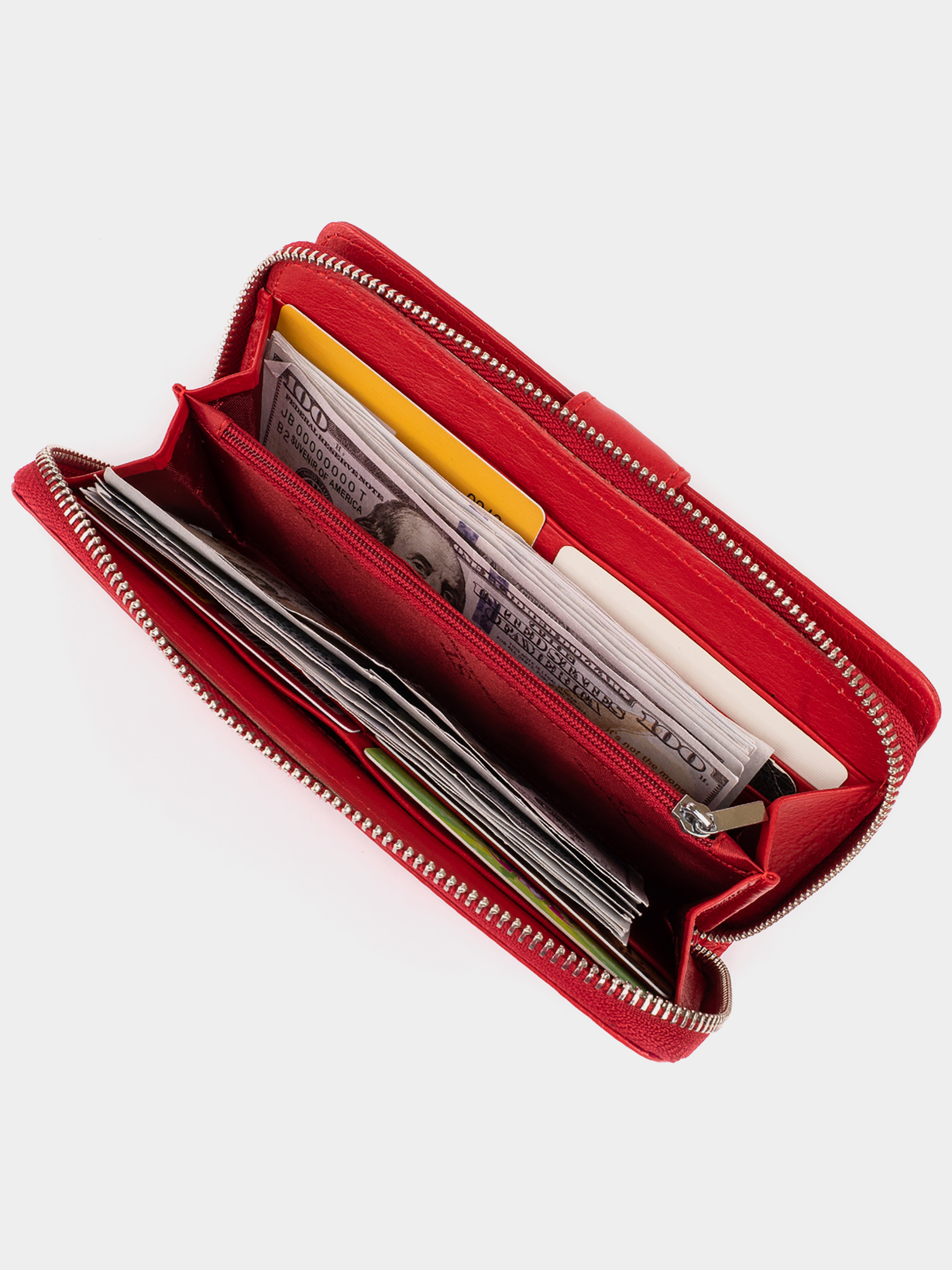 Матеріал: натуральна шкіра; Колір червоний; Розміри (ШхВхГ): 19х9,5х2,5. Країна виробництва: Китай. Особливості: -виріб складається з двох частин в першій частині: -2 відділення для купюр; -2 прихованих кишені; -кишеня-перегородка на блискавці; -8 слотів для кредиток; -закривається на блискавку. в другій автономній частині: -3 відкритих кишені; -10 слотів для кредиток (один з них під плівкою); -закривається на хлястик з магнітом; -кишеня на блискавці на тильній стороні. Місткий аксесуар з натуральної шкіри яскравого червоного кольору. Виріб підійде для дівчат, які люблять яскраві аксесуари. Впевнені, що даний гаманець не залишиться без уваги і отримає багато компліментів у свою адресу. Функціонал гаманця виражений достатньою кількістю слотів для кредиток і відділень для купюр в розгорнутому вигляді. Даний гаманець зручно лежить в руці. М'яка і приємна шкіра прослужить вам далеко не один рік. По краях аксесуар прошитий рівним рядком. На лицьовій стороні гаманця металевий логотип бренду. Внутрішнє оздоблення: поєднання міцного текстилю та натуральної шкіри.