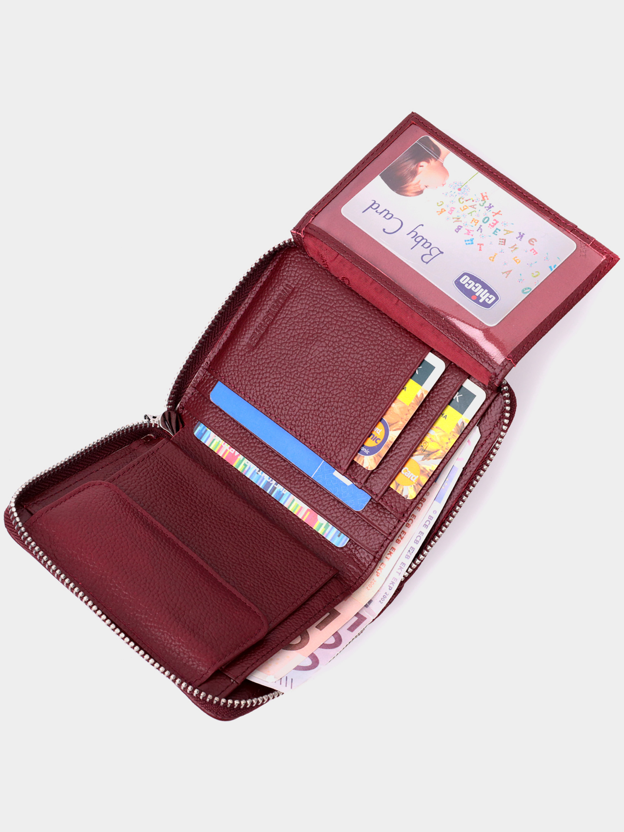 Матеріал: натуральна шкіра; Колір: бордовий; Розміри (ШхВхГ)см: 12,5х10,2х2 см; Країна виробництва: Китай. Особливості: - 2 відділення для купюр; - 6 слотів для кредиток; - 4 приховані кишені; - 1 прозора кишеня; - 1 кишеня для монет на кнопці під клапаном; - закривається на блискавку. Стильне портмоне для жінок середнього розміру із натуральної шкіри найвищої якості. Аксесуар складається з двох містких відділень для купюр, шести осередків для карт, чотирьох прихованих кишень, прозорої кишені та кишені для монет. Зовні виріб прошитий рівним рядком по краю і прикрашений металевим логотипом компанії виробника, який розміщений вгорі посередині. Портмоне доповнено надійною фурнітурою та міцною підкладкою. Укомплектований гаманець у фірмову картонну коробку білого кольору. Виріб стане ідеальним подарунком для дівчини будь-якого віку.