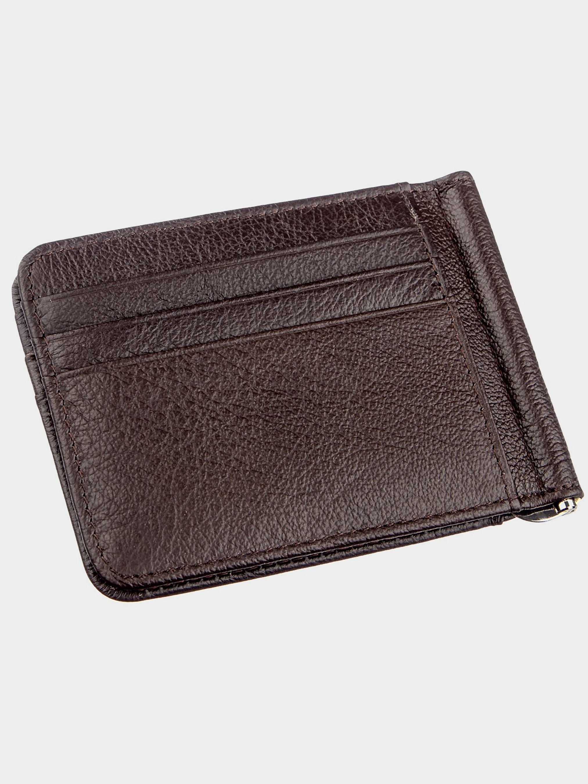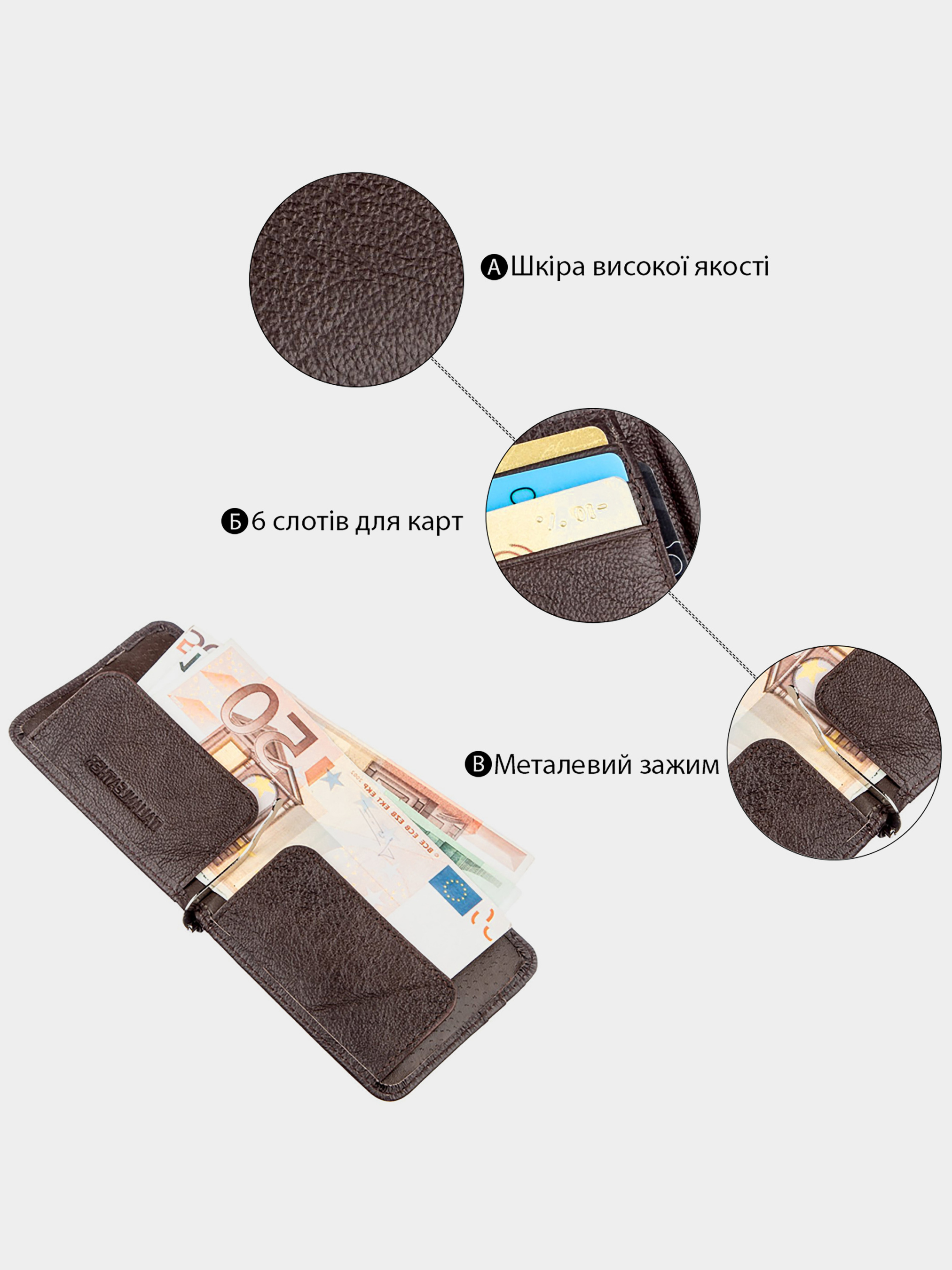 Матеріал: натуральна шкіра; Розміри (ШхВ, см): 11,5х8,5х1,5; Колір: коричневий; Країна виробник: Китай; Країна походження ТМ: Україна. Опис: - чоловічий зажим з натуральної шкіри; - всередині розташований металевий затискач для купюр; - два зовнішніх потаємних відділення; - 6 відділень для карт. Стильний чоловічий зажим в строгому і практичному дизайні. Стане прекрасним придбанням для тих, кому набридли громіздкі гаманці і тим, у кого є бажання носити з собою мінімум речей. Виконано виріб з відмінної натуральної шкіри з хорошими показниками зносостійкості в процесі експлуатації. Має гарний досить насичений коричневий колір, що надає йому особливого шарму. Якщо незабаром наближається особливе свято, то перед Вами відмінний подарунок справжньому чоловікові. Упакований зажим в картонну фірмову коробку.
