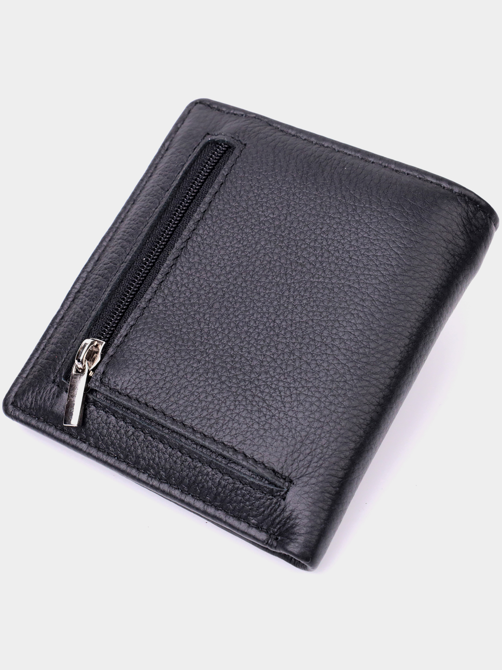 Матеріал: натуральна шкіра; Колір: чорний; Розміри (ШхВхГ)см: 9,5х10,3х1,5см; Країна виробництва: Китай. Особливості: - 1 основне відділення для купюр; - 1 відділення на блискавці на всю довжину; - 6 слотів для кредиток; - 2 приховані кишені; - 1 зовнішня кишеня для монет на блискавці; - закривається на магніт. Акуратний гаманець невеликого розміру з натуральної шкіри найвищої якості. Аксесуар складається з одного місткого відділення для купюр, кишені на блискавці через всю довжину, шести осередків для карт, двох прихованих кишень та зовнішньої кишені на блискавці, що чудово прослужить для монет. Портмоне доповнено надійною фурнітурою та міцною підкладкою. Укомплектований гаманець у фірмову картонну коробку білого кольору. Виріб стане ідеальним подарунком на будь-яке свято.