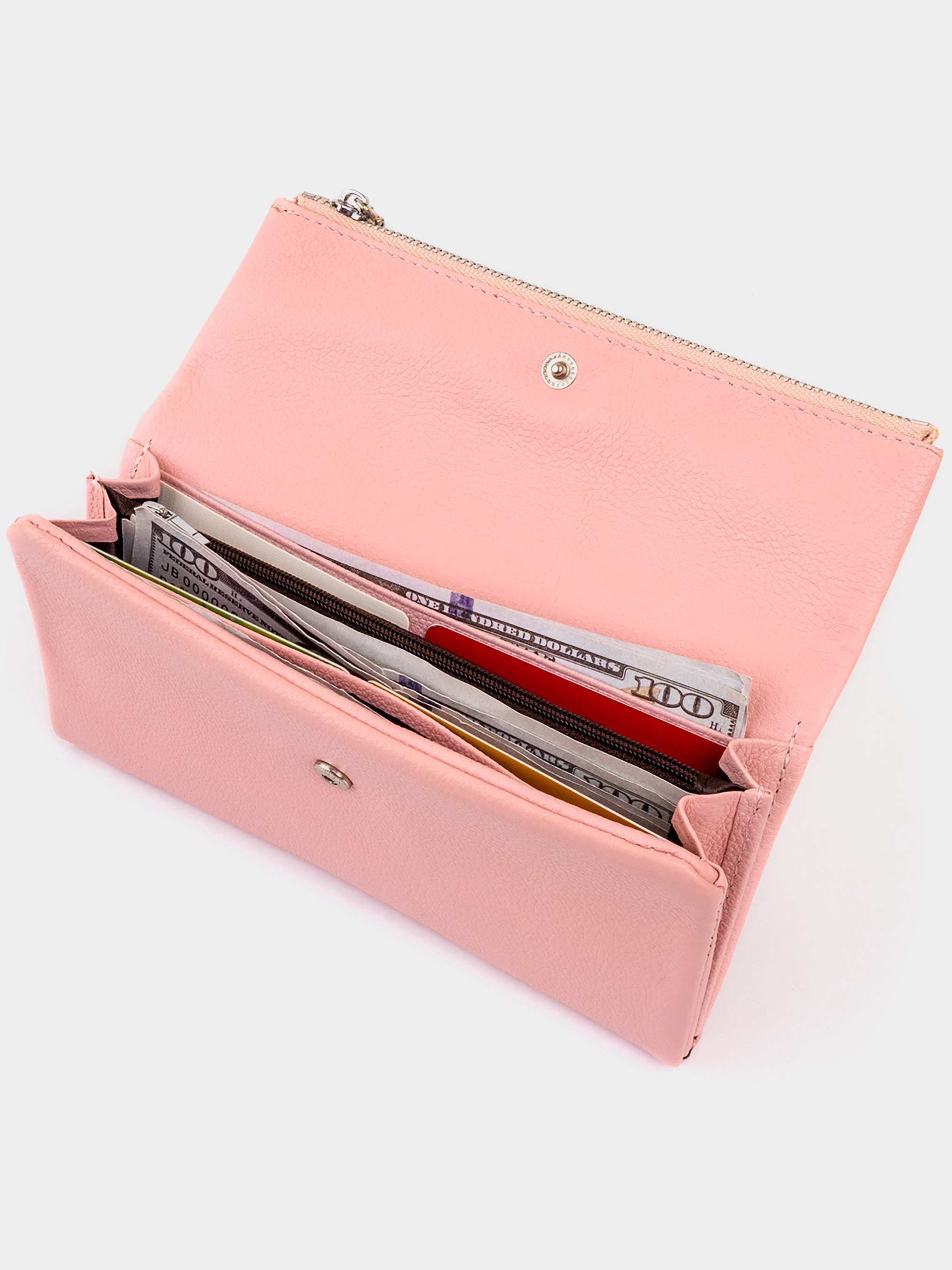 Матеріал: натуральна шкіра; Колір рожевий; Розміри (ШхВхГ): 18,5х9,8х2. Країна виробництва: Китай. Особливості: -2 приховані кишені; -2 великих відділення для купюр; -кишеню перегородка на блискавці; -12 осередків під пластикові картки; -закривається на кнопку; -велика суцільна кишеня на блискавці(вміщує паспорт і телефон розміри кишені 16 на 18,5 см). Клатч у вигляді конверта дуже практичний і універсальний. Ніжний рожевий колір додасть вам легкості і ніжності. Кришка клатча має суцільну кишеню на блискавці яка,легко помістить паспорт і ваш мобільний. У такий клатч можна скласти не тільки купюри і кредитки. Ми впевнені, що кожна дівчина не встоїть перед функціональністю даної моделі. Матеріал виконання - натуральна шкіра високої якості дуже м'яка і приємна на дотик. Клатч ви можете носити як в дамській сумочці так і в руках. Виріб упаковано в фірмову коробку й стане найкращим подарунком для будь-якої дівчини.