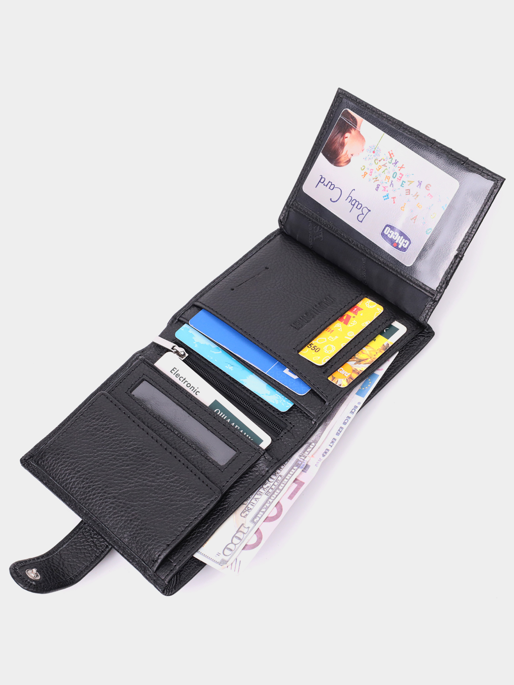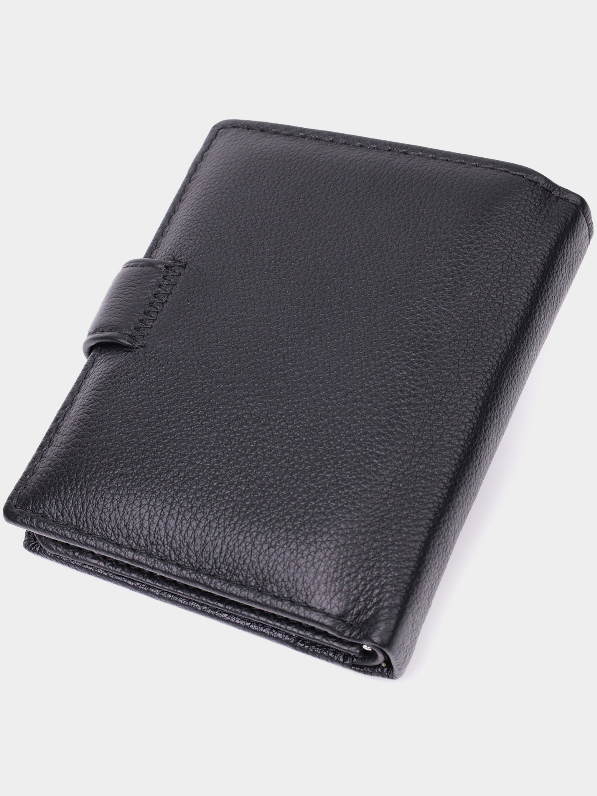 Матеріал: натуральна шкіра; Колір: чорний; Розміри (ШхВхГ)см: 10,5х12х2,5 см; Країна виробництва: Китай. Особливості: - 2 відділення для купюр; - 1 вертикальна кишеня на блискавці; - 1 кишеня під плівкою; - 11 осередків для кредиток; - 3 приховані кишені; - 1 кишеня для монет на кнопці під клапаном; - закривається хлястиком на кнопку. Якісний гаманець вертикального типу для чоловіків, які цінують якість та практичність. Аксесуар невеликого розміру, але дуже місткий з натуральної шкіри, він складається з двох містких відділень для купюр, однієї вертикальної кишені на блискавці, кишені під плівкою, одинадцяти осередків для карт, трьох прихованих кишень та кишені для монет. Портмоне доповнено надійною фурнітурою та міцною підкладкою. Запакований гаманець у фірмову картонну коробку білого кольору.