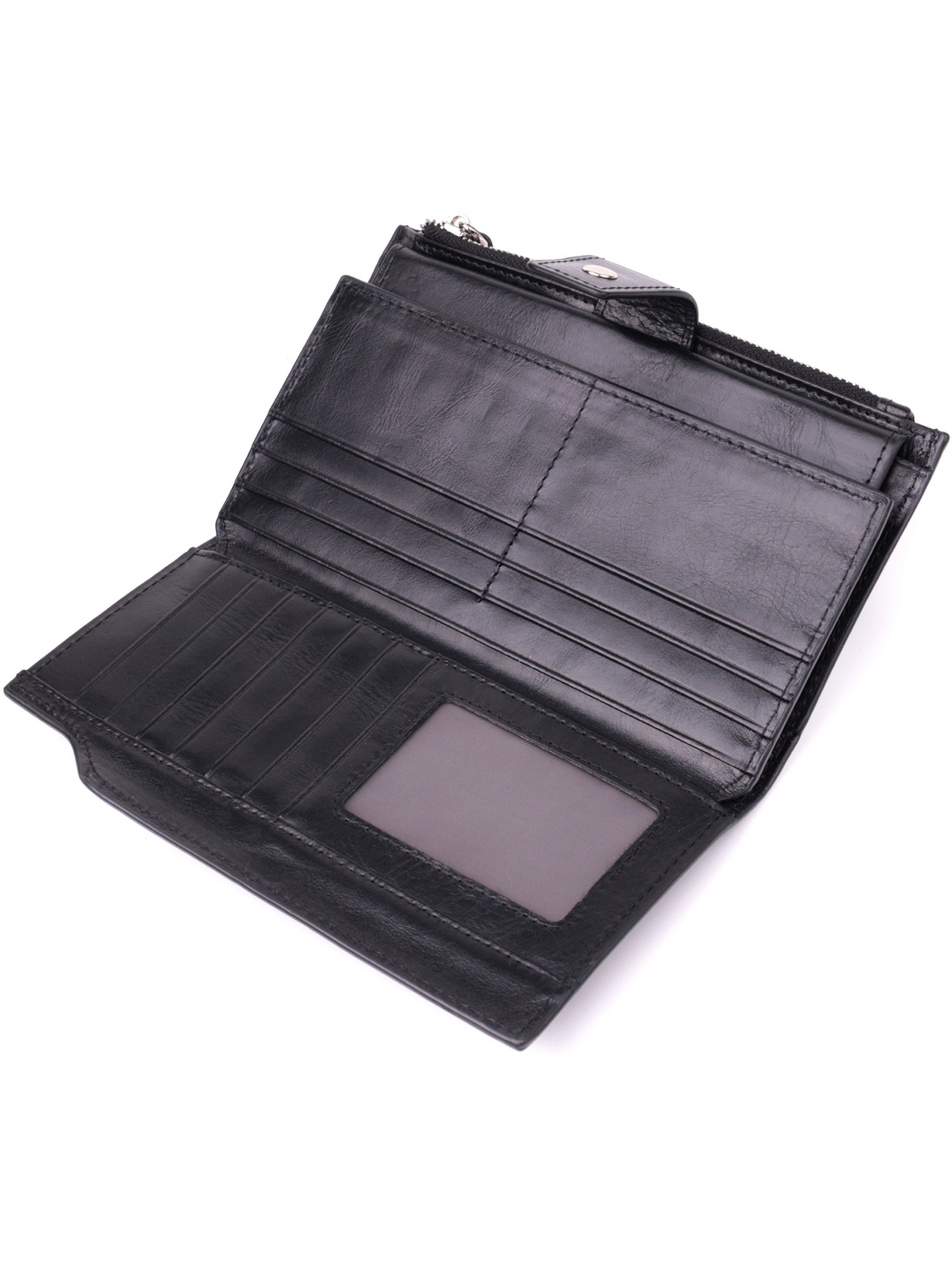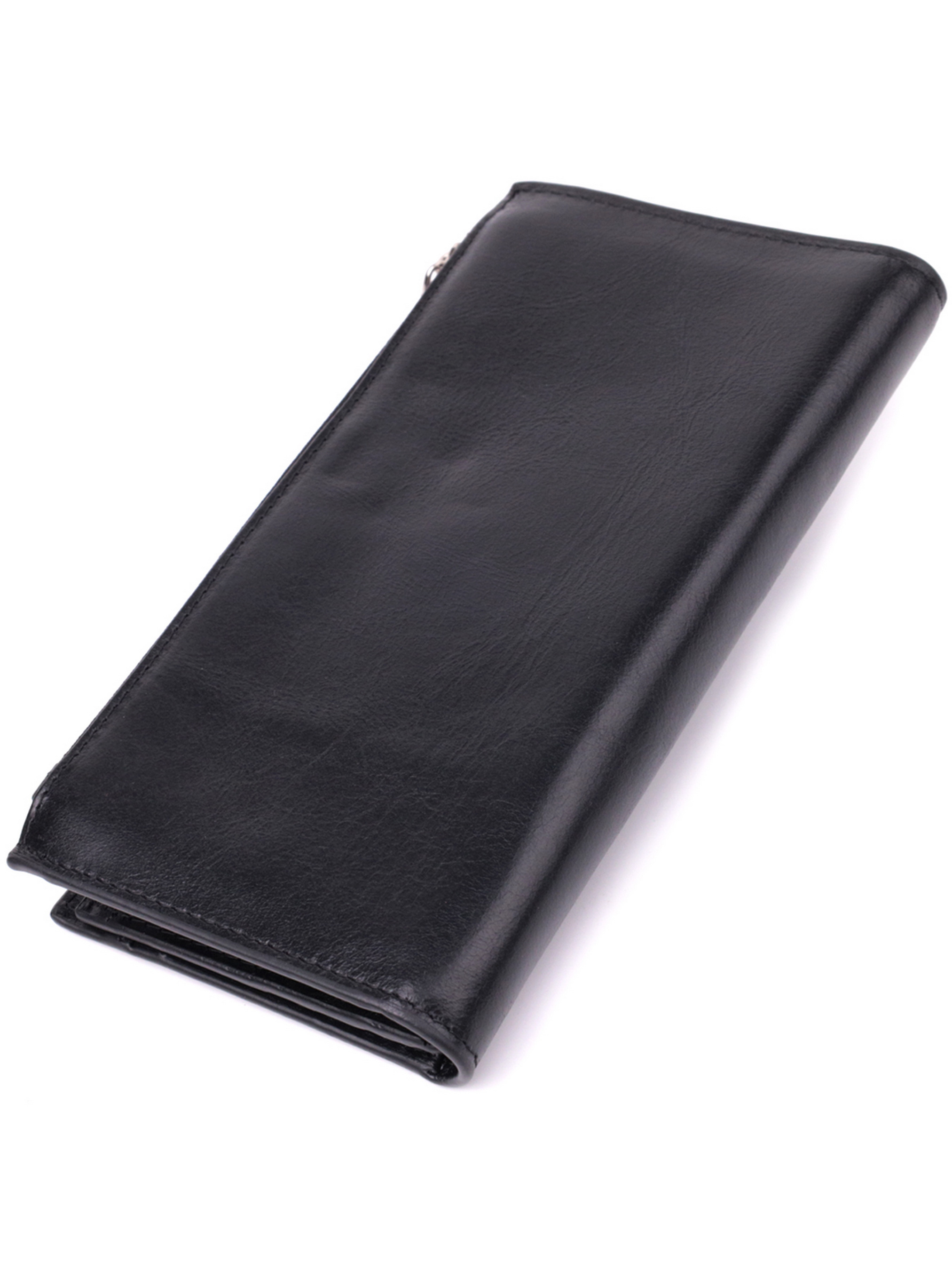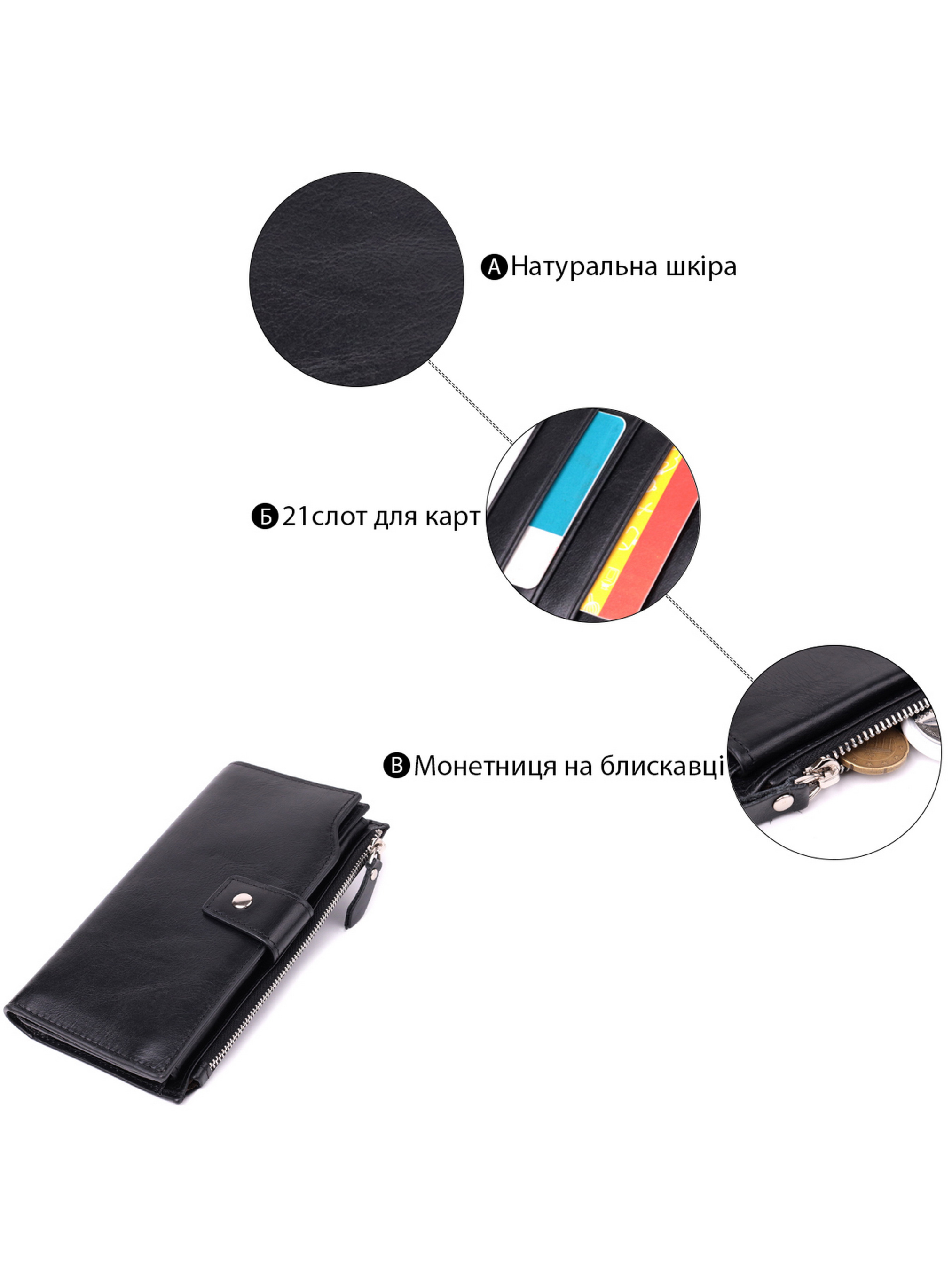 Колір: чорний; Матеріал: натуральна шкіра; Розмір (ШхВхГ, см): 10,5х19,5х2см; Країна виробник: Китай. Бренд: Vintage. Особливості: - 3 відділення для купюр; - 21 слот для кредитних карток (один під плівкою); - 1 монетниця що закривається клапаном на кнопку - 1 кишенька на блискавці зовні; - закривається шкіряним хлястиком на кнопку. Універсальне портмоне як для чоловіка, так і для жінки у класичному чорному кольорі з невимушеним дизайном. Аксесуар виготовлений з якісної натуральної шкіри, яка має вишуканий блиск і приємна на дотик. Тонкий і м'який на дотик гаманець має більш ніж достатньо осередків для кредиток, кишеньок для монет та відділення для купюр. Аксесуар дуже стильний і доповнений найнеобхіднішим функціоналом без зайвих деталей. Це портмоне, ідеальне поєднання практичності та витонченого стилю, що підкреслює Ваш смак та увагу до деталей.