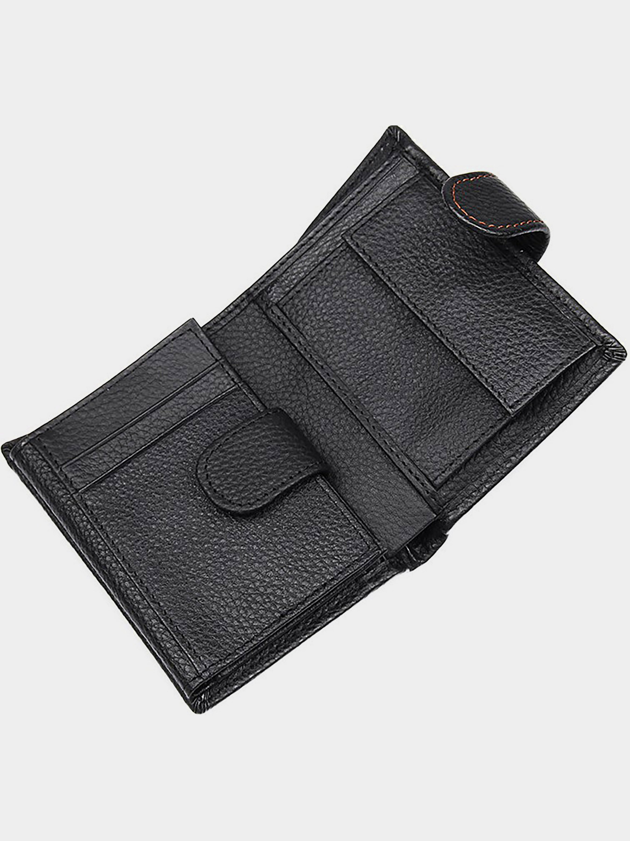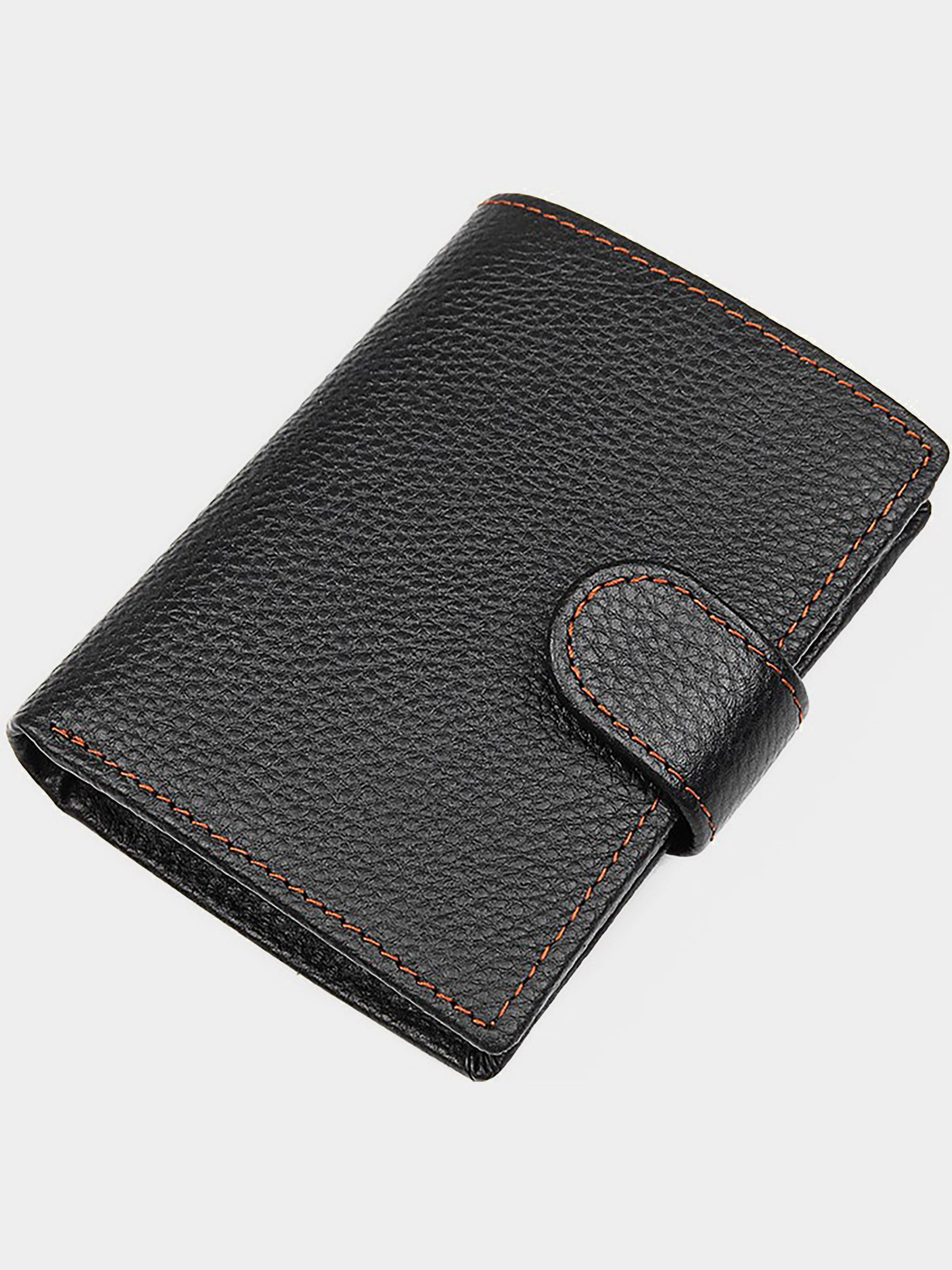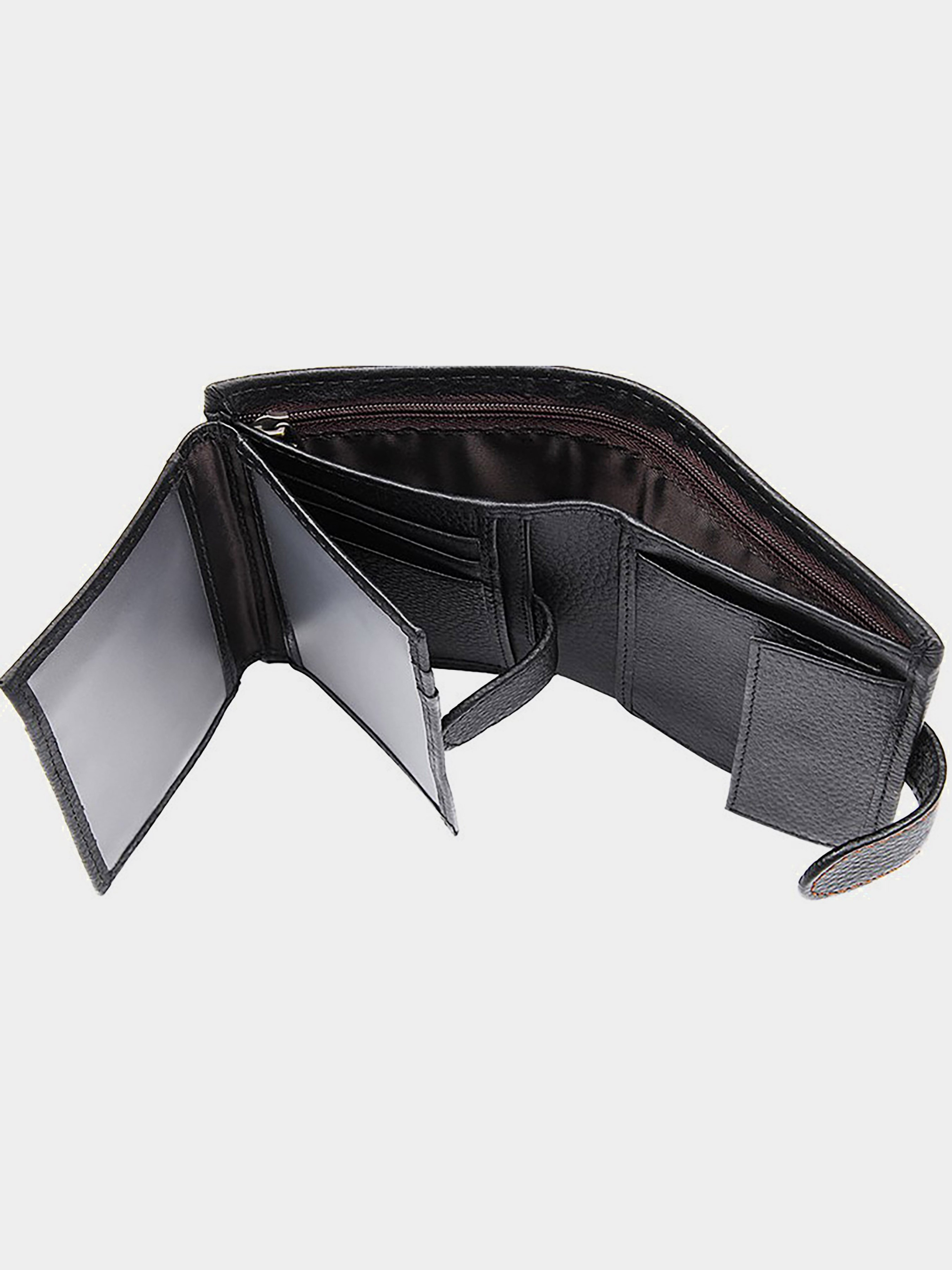 Колір: чорний; Матеріал: натуральна високоякісна шкіра; Розмір (ШхВ, см): 9,5х12. Опис: - два відділення для банкнот, одне з яких закривається блискавкою; - монетниця на кнопці; - 7 відділень для пластикових карток; - два невеликих відділення для документів під прозорою плівкою; - три потаємних кишені; - закривається хлястиком на кнопку. Вертикальне чоловіче портмоне чорного кольору. Аксесуар виконаний з натуральної високоякісної фактурної шкіри приємною на дотик. Портмоне акуратною прошитий світло-коричневою ниткою, що надає йому родзинку. Колір фурнітури: латунь. Виріб упаковано в текстильний пилозахисний мішечок білого кольору.