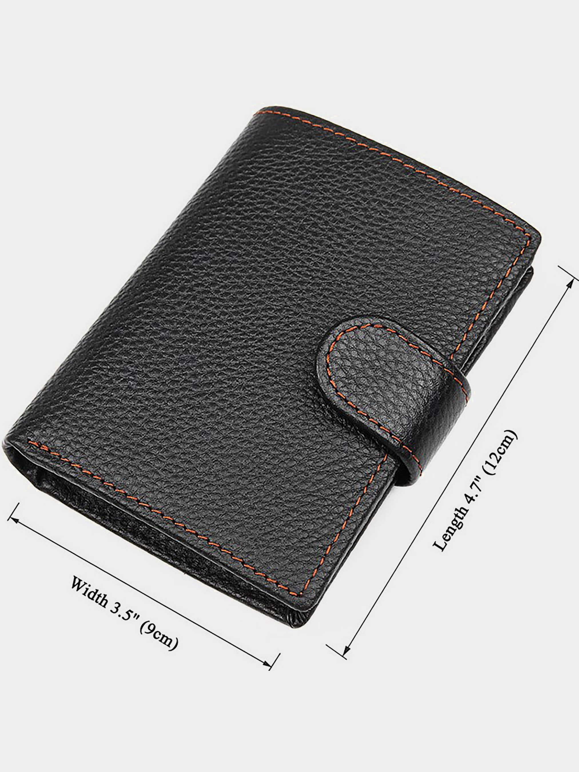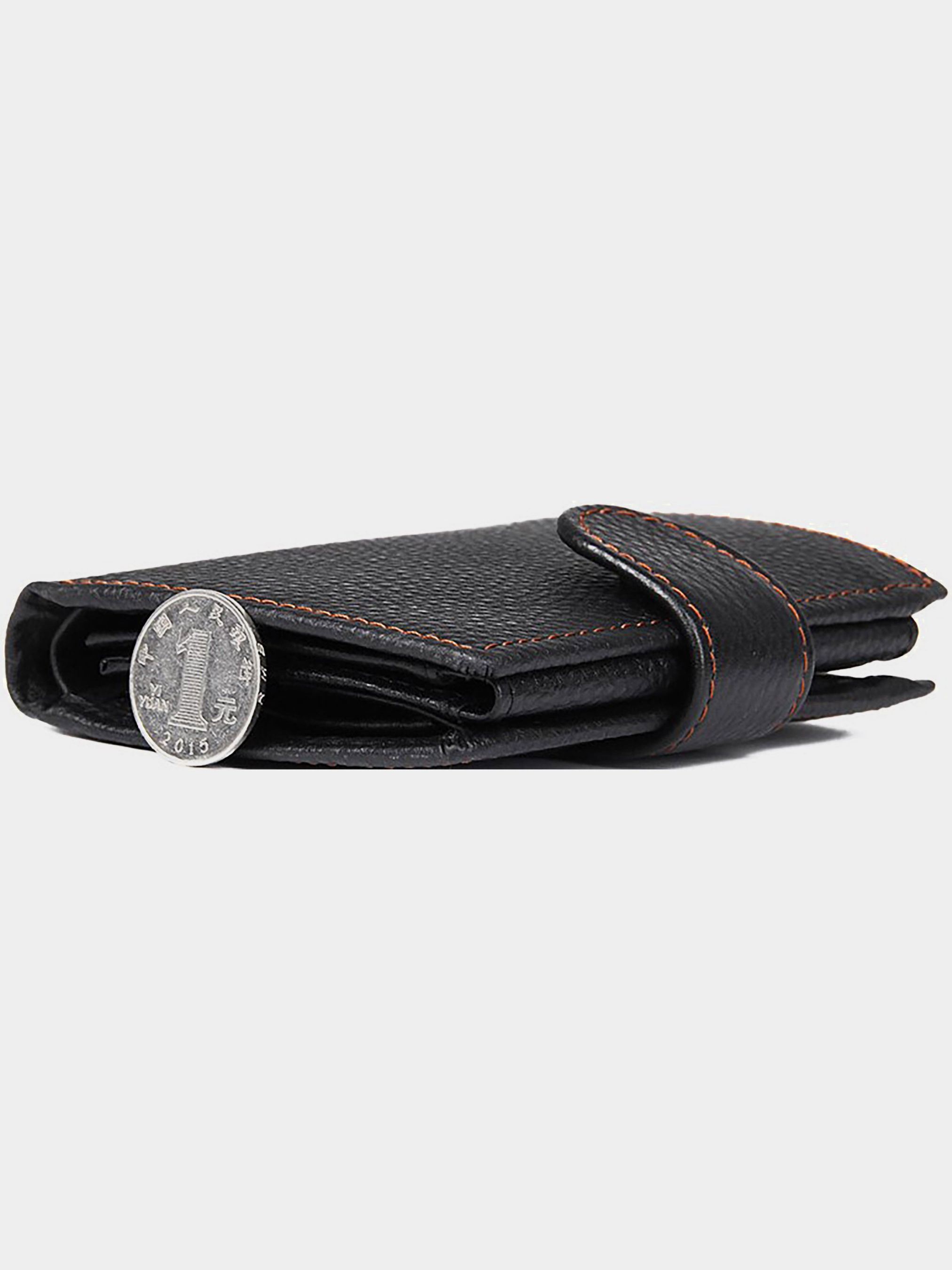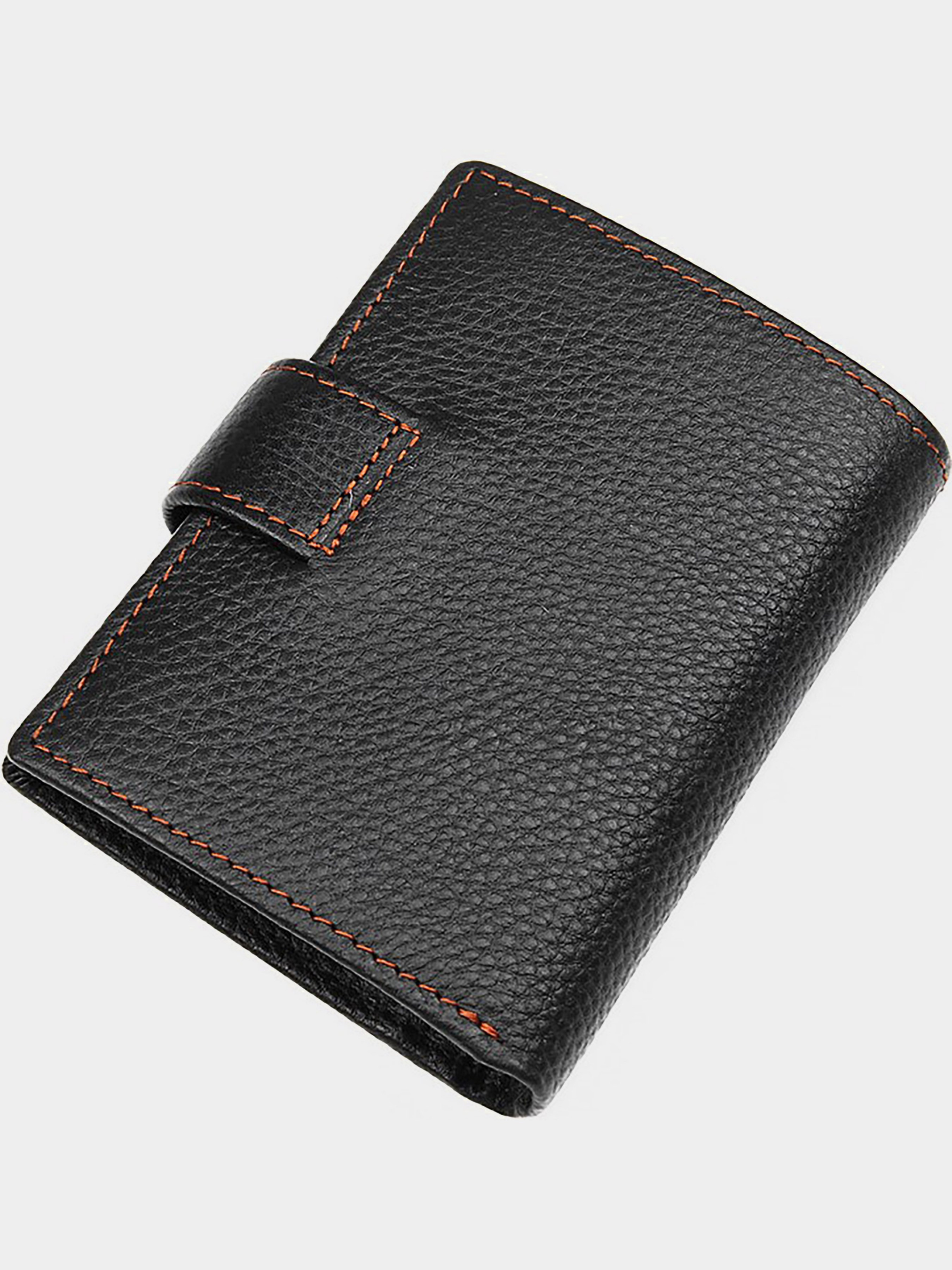 Колір: чорний; Матеріал: натуральна високоякісна шкіра; Розмір (ШхВ, см): 9,5х12. Опис: - два відділення для банкнот, одне з яких закривається блискавкою; - монетниця на кнопці; - 7 відділень для пластикових карток; - два невеликих відділення для документів під прозорою плівкою; - три потаємних кишені; - закривається хлястиком на кнопку. Вертикальне чоловіче портмоне чорного кольору. Аксесуар виконаний з натуральної високоякісної фактурної шкіри приємною на дотик. Портмоне акуратною прошитий світло-коричневою ниткою, що надає йому родзинку. Колір фурнітури: латунь. Виріб упаковано в текстильний пилозахисний мішечок білого кольору.
