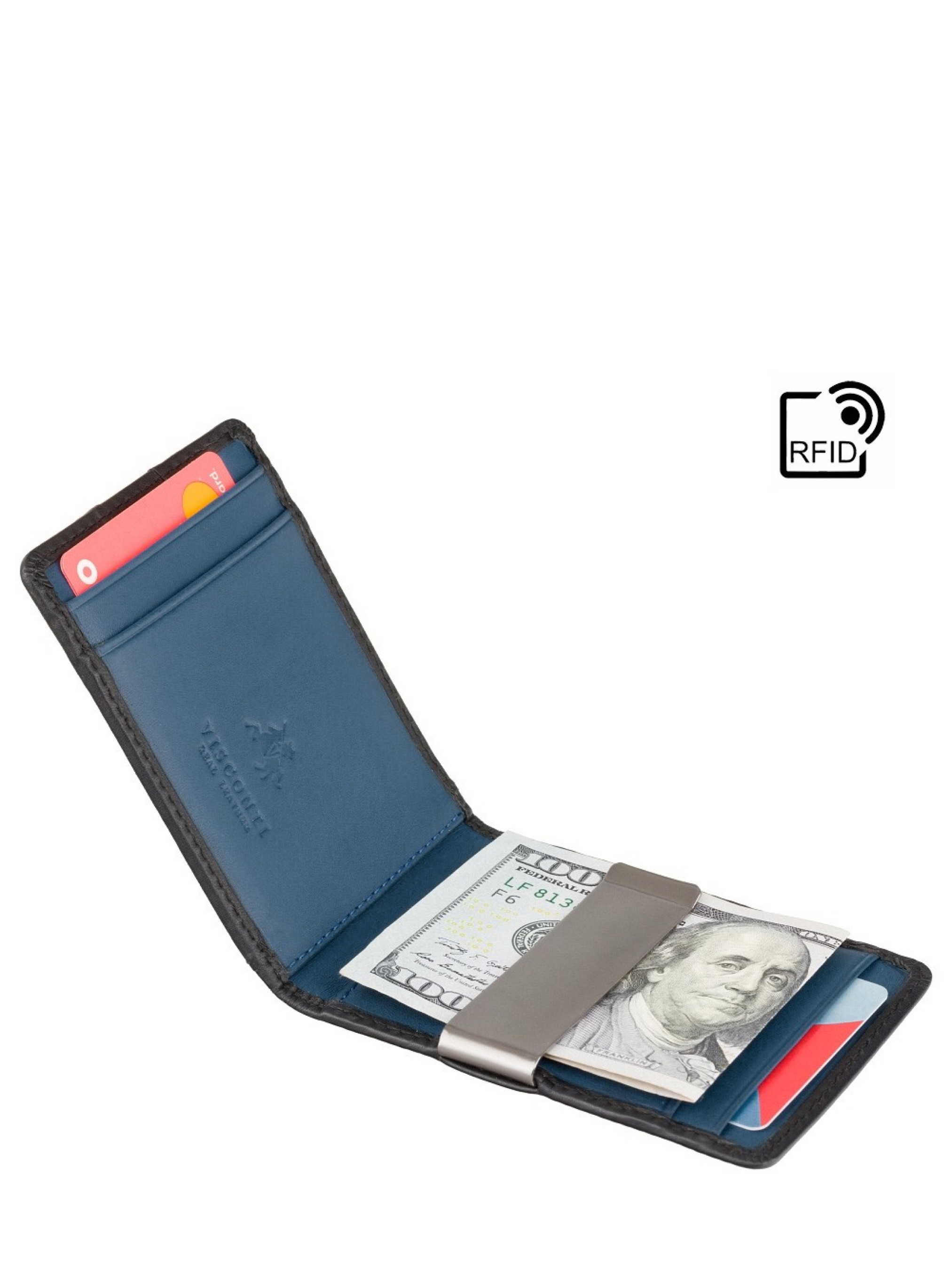 Чоловічий затискач для грошей Visconti VSL57 (Black/Cobalt) виготовлений з високоякісної телячої шкіри чорного кольору зовні та синього кольору всередині, що надає аксесуару стильного та сучасного контрастного вигляду. Компактний і тонкий дизайн робить його зручним для щоденного використання та дозволяє легко носити в будь-якій кишені. Міцна натуральна шкіра забезпечує довговічність виробу та допомагає зберігати його охайний вигляд протягом тривалого часу. Модель оснащена надійним затискачем для купюр, чотирма відділеннями для банківських карток і спеціальним відділенням Tap-n-Go для швидких безконтактних платежів. Додатковий захист від зчитування даних карток підвищує безпеку під час використання. Затискач для грошей Visconti VSL57 (Black/Cobalt) поєднує стиль, практичність і сучасні технології та постачається у фірмовій подарунковій коробці, що робить його чудовим варіантом для подарунка.