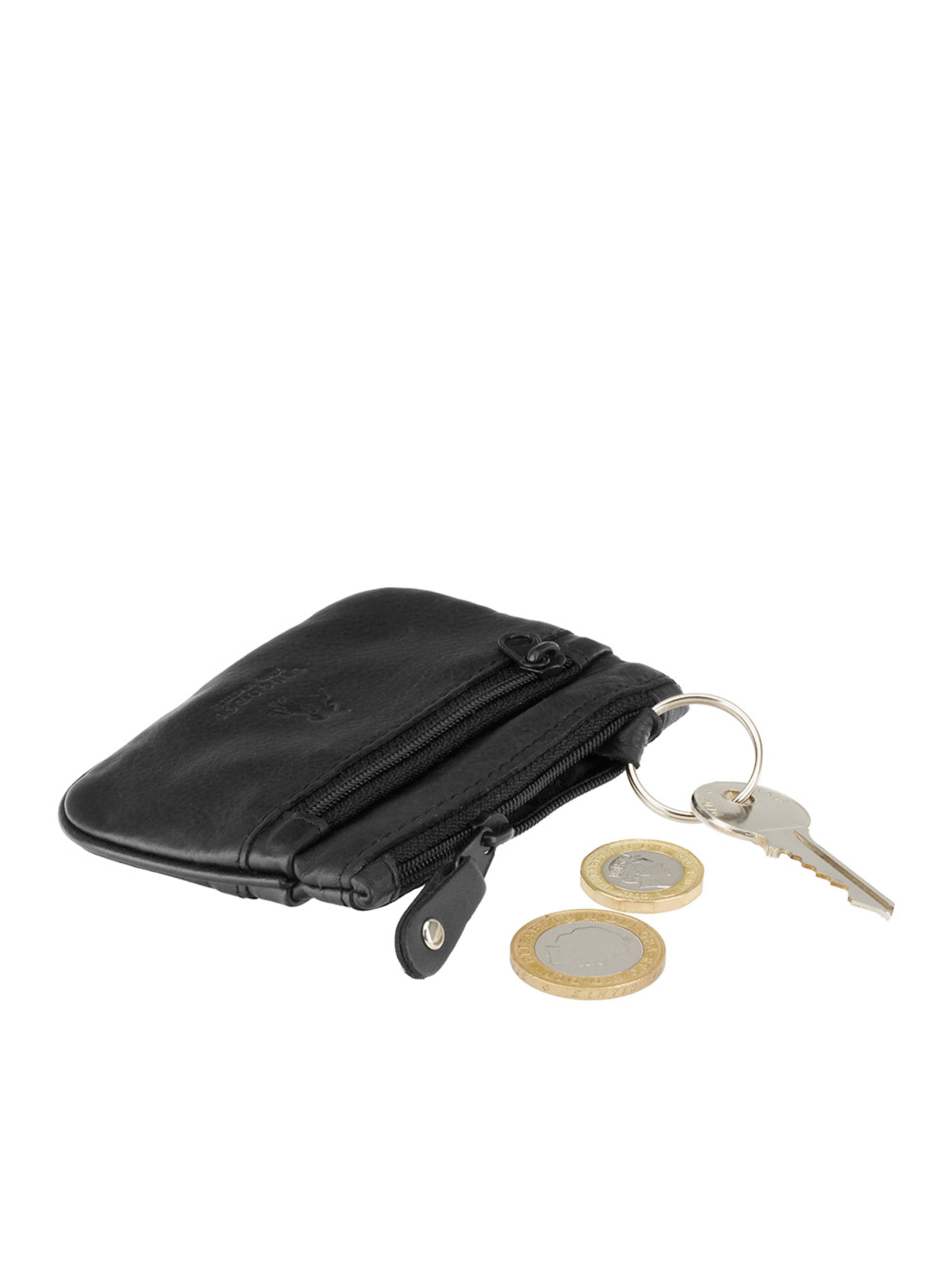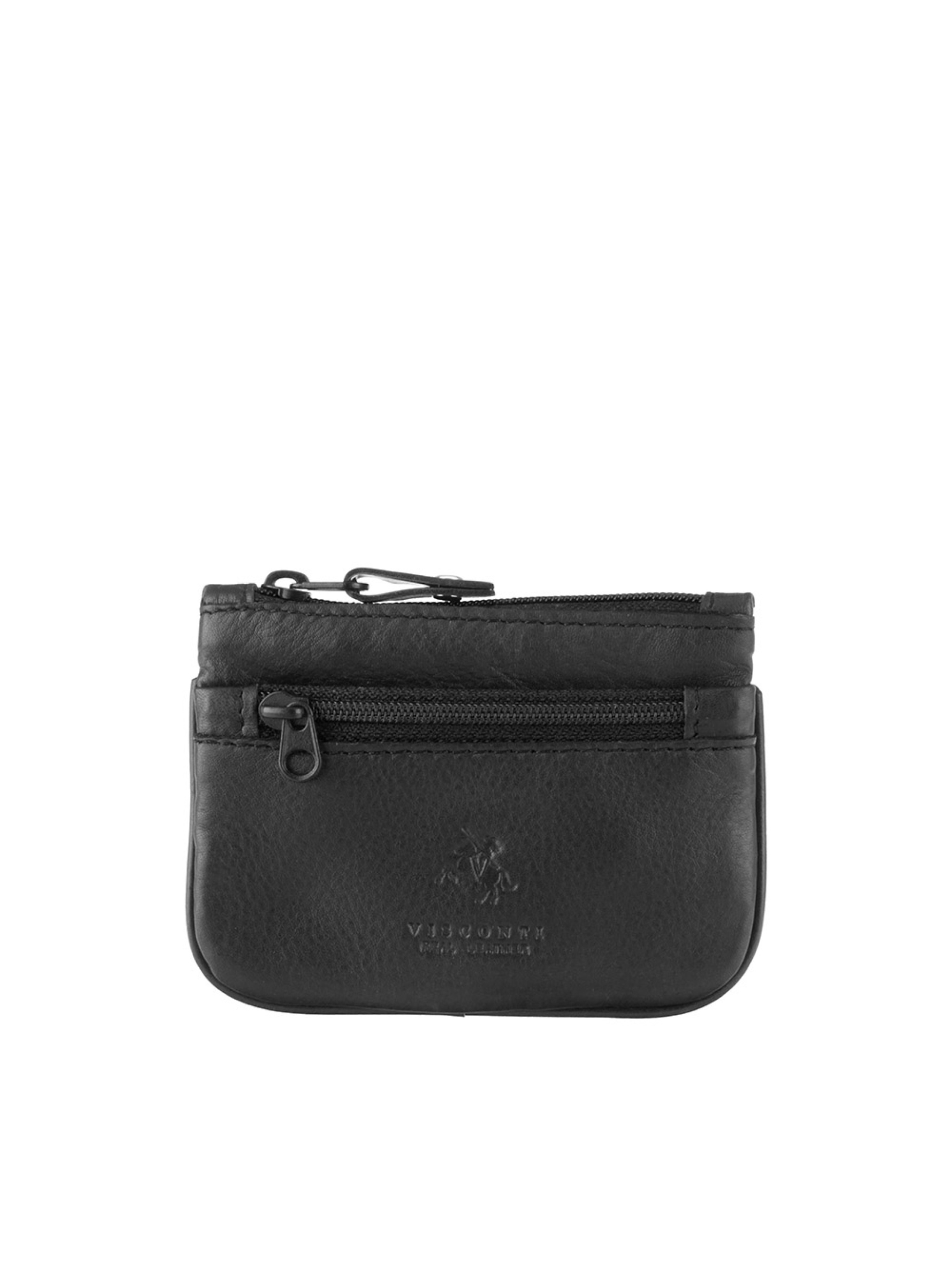 Ключниця Visconti CP3 (Black) — компактний і практичний аксесуар для зберігання ключів і дрібниць. Модель виготовлена з натуральної шкіри з матовою фактурою, яка відрізняється міцністю та акуратним зовнішнім виглядом. Класичний чорний колір робить аксесуар універсальним і легко поєднується з іншими шкіряними виробами. Ключниця закривається на блискавку, що забезпечує надійне зберігання вмісту. Всередині розташований металевий тримач з кільцем для ключів, який дозволяє зручно закріпити ключі та запобігти їх втраті. Додатковий простір можна використовувати як невелику монетницю для зберігання монет або інших дрібних предметів. Текстильна підкладка підвищує зносостійкість виробу та робить використання більш практичним. Завдяки компактному розміру ключниця легко поміщається в кишені, сумці або рюкзаку та підходить для щоденного використання. Розміри 11 × 7 см.