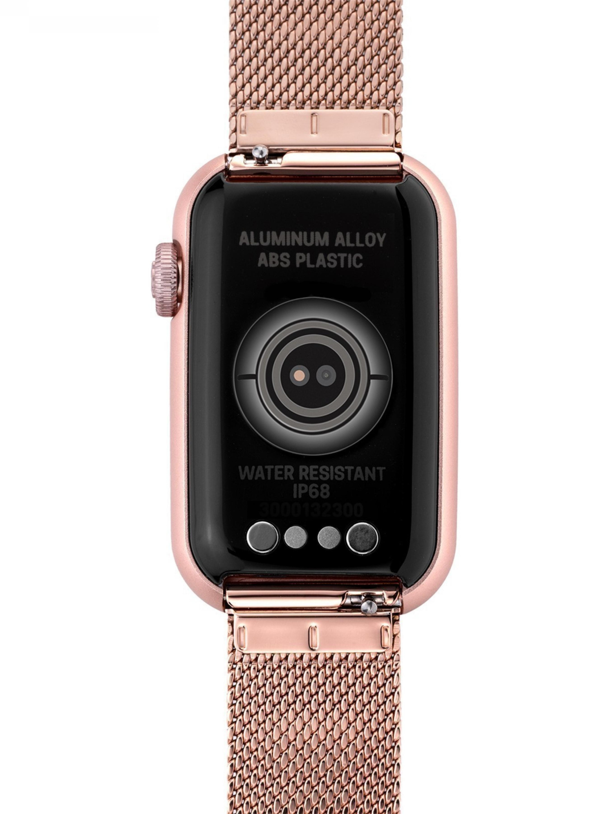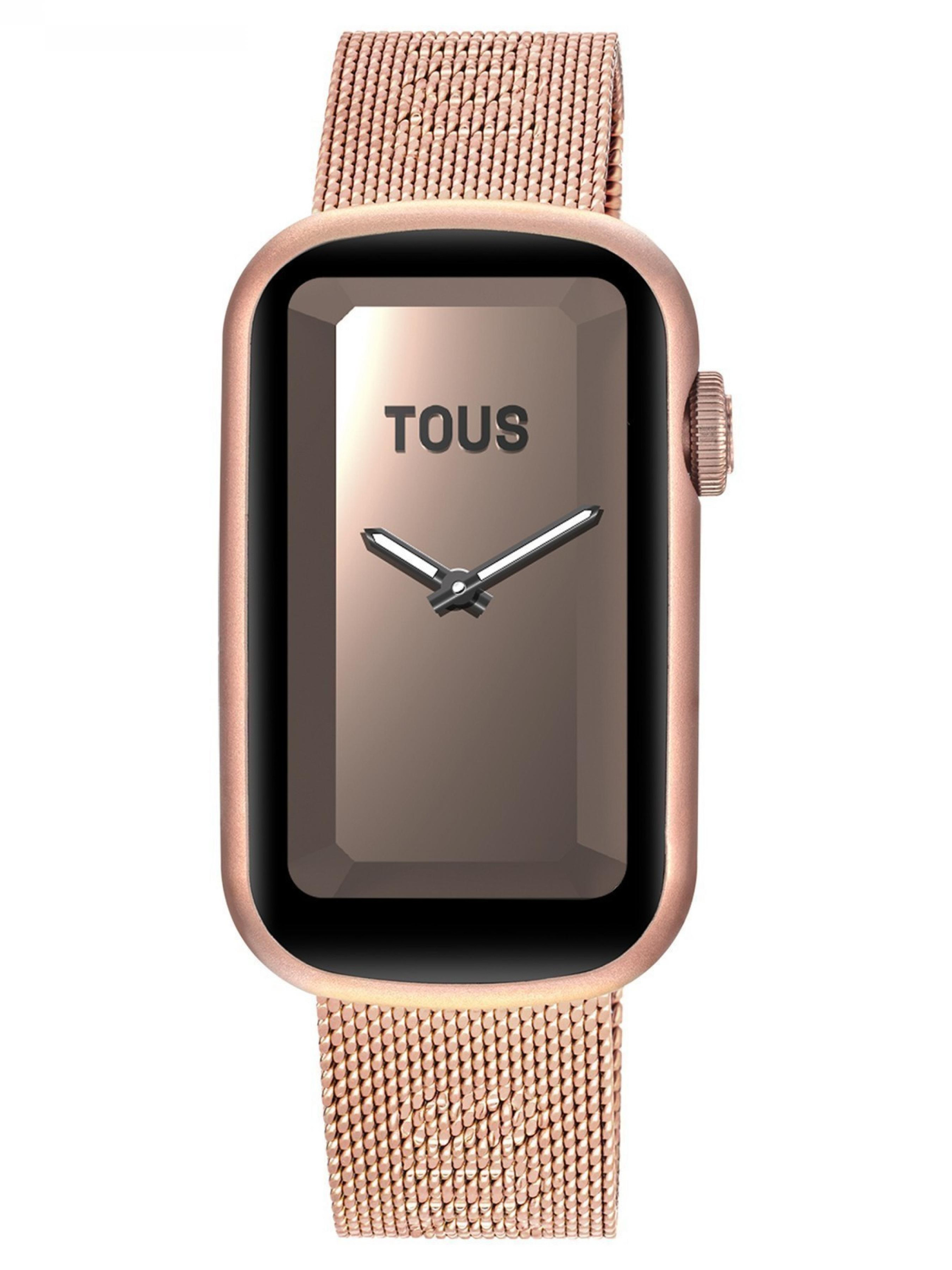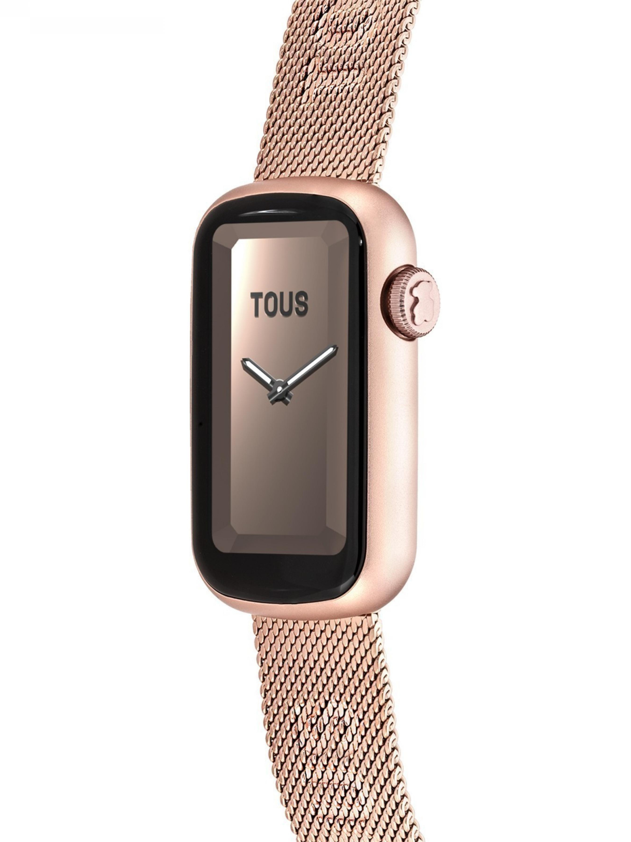 Смарт-годинник TOUS T-Band Mesh з рожевим браслетом з нержавіючої сталі IPRG та алюмінієвим корпусом рожевого кольору. Сумісність: Android 7.0 та iOS 12.0 або новішої версії. Дисплей/LCD: прямокутний сенсорний екран розміром 1,47 дюйма TFT-DLC в кольорі (Full Touch) з роздільною здатністю 172 x 320. Операційна система: RT OS. Зв'язок: Bluetooth версії BLE 5.0. Коефіцієнт підсилення антени: 0 dBi. Оперативна пам'ять: 128 кб, флеш-пам'ять 64 МБ. Акумулятор: ємність 140 мАг, літій-іонний 3,8 В/2,9 г, перезаряджається за допомогою магнітного кабелю (мінімум 5 В/1 А), 5-7 днів в режимі роботи і 8-10 в режимі очікування. Чіпсет: Realtek RTL8762CK і частота серцевих скорочень: HRS 3300 - ARM Cortex-M3 - частота 53 МГц. Водонепроникність: IP68. Функції: 5 циферблатів TOUS, один з яких змінний з додатку TOUS WEAR APP, години, хвилини, місяць, дата, день тижня, щоденна активність з лічильником кроків, лічильником калорій і пройденої відстані в милях або кілометрах, види спорту (ходьба, біг, піші прогулянки, їзда на вел
